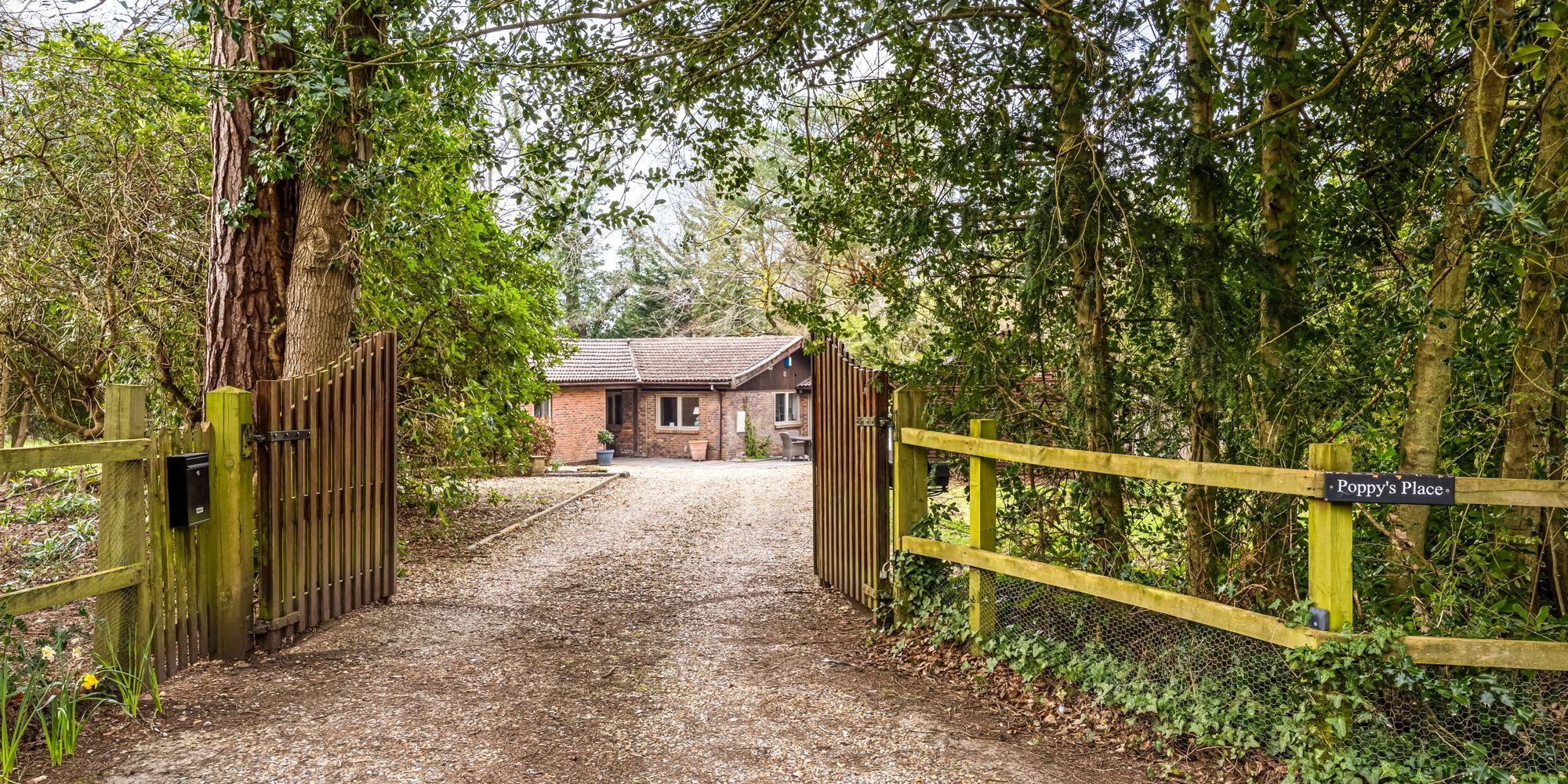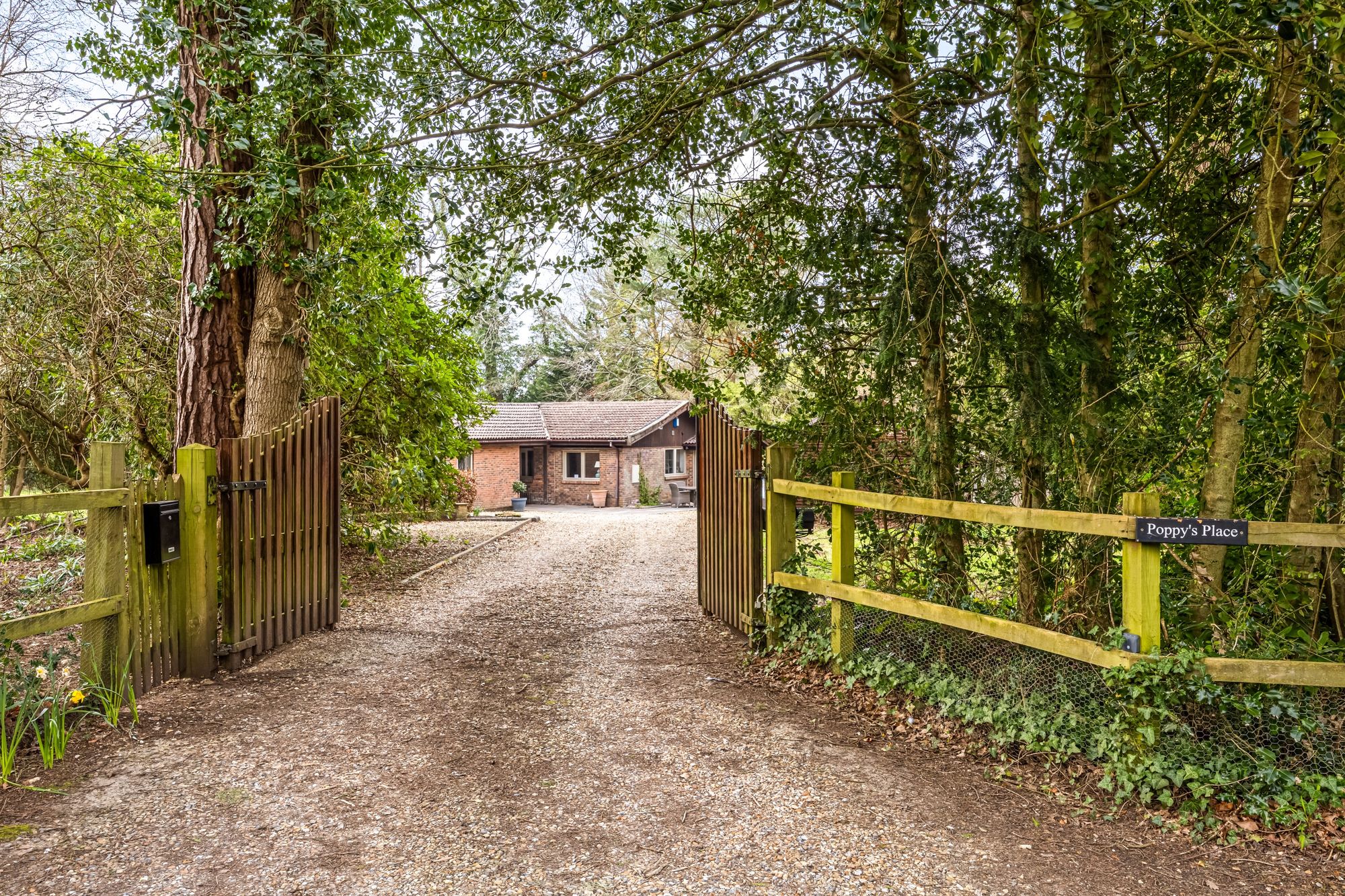 Outside the property is approached by wooden gates and a large gravel driveway, providing ample parking and access to a substantial outbuilding (ideal for storage or as a workshop).