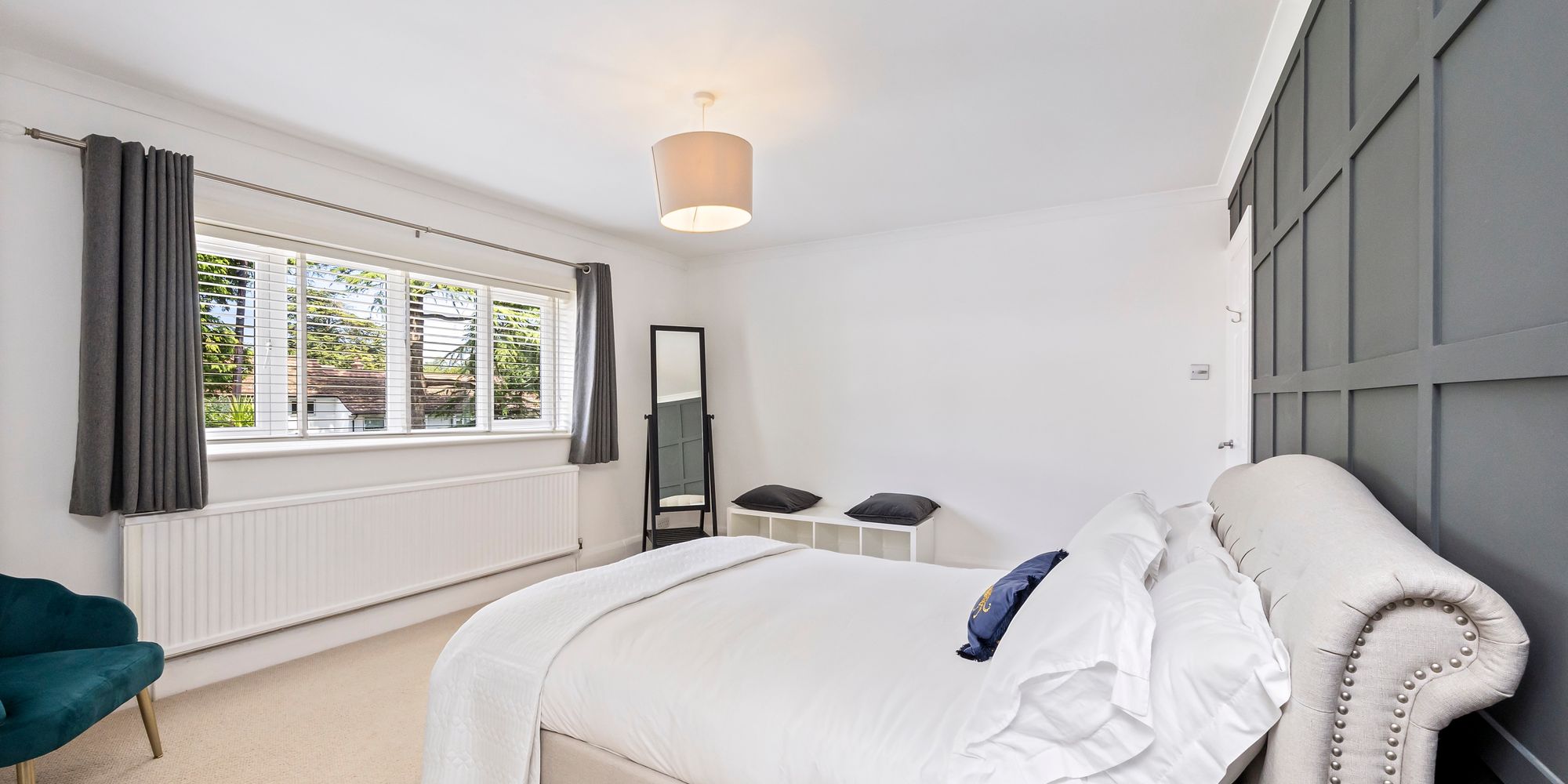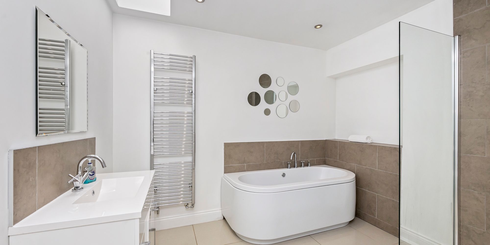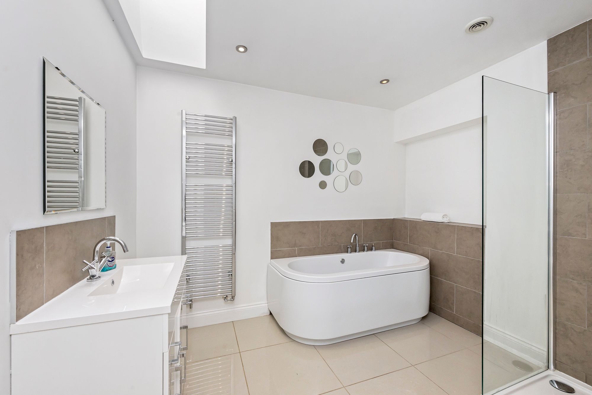 The first floor accommodates five generous double bedrooms with bedrooms one and two benefitting from an en-suite bathroom and shower room respectively whilst the remainder are serviced by a sleek family bathroom featuring a back to wall freestanding bath tub, separate walk-in rainfall shower, heated towel rail, vanity mirror and sink unit with under basin storage along with all essentials.