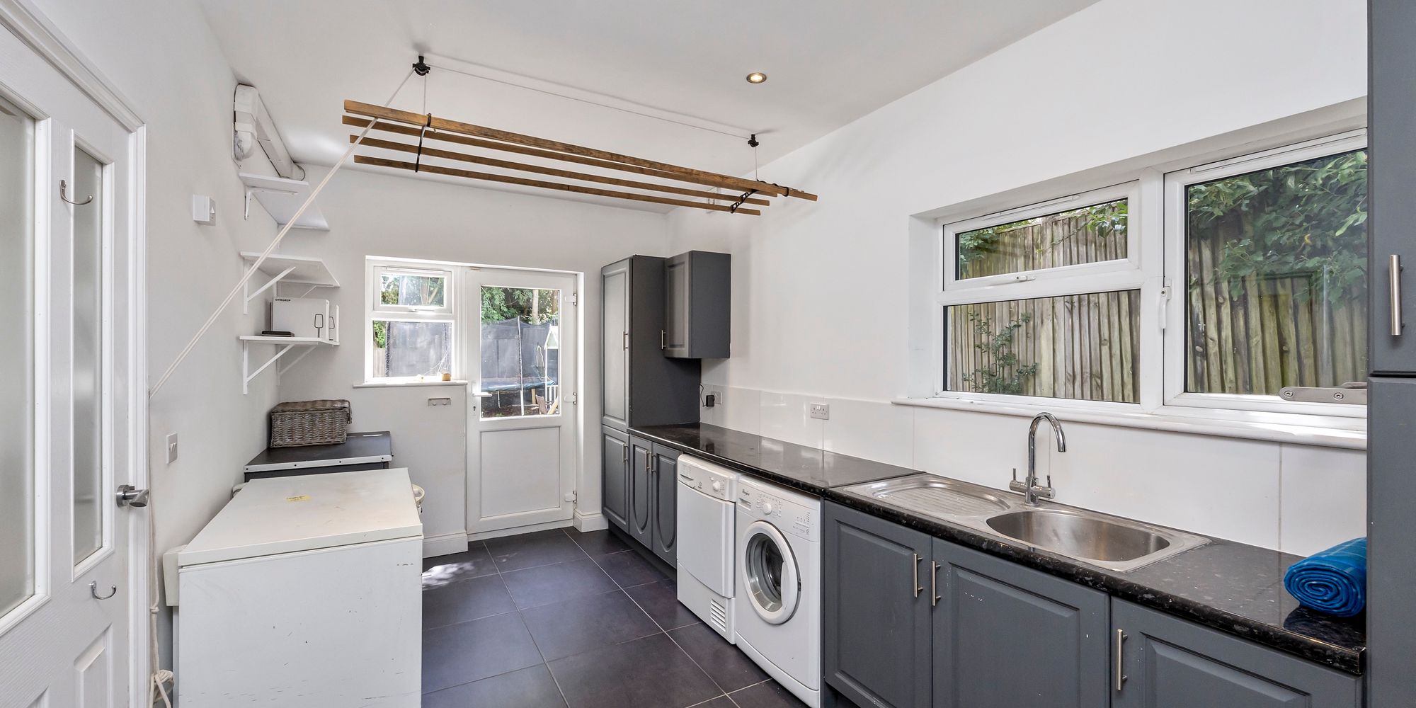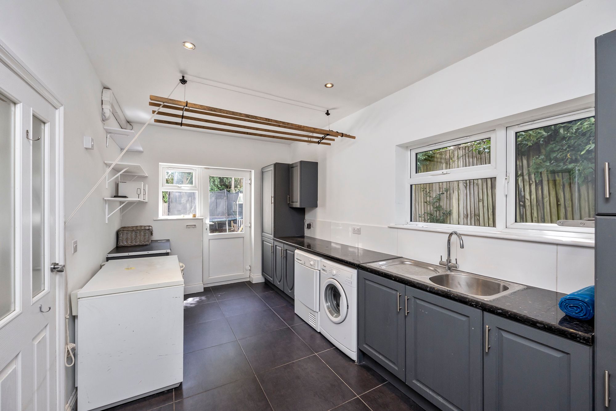 A separate utility room adds convenience whilst providing additional storage and hiding bulky white goods whilst also providing access into the rear garden or integral garage which is currently set up as a home gym.