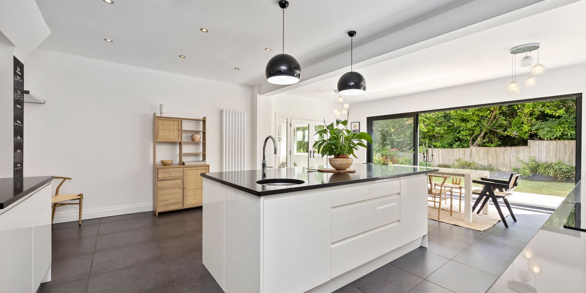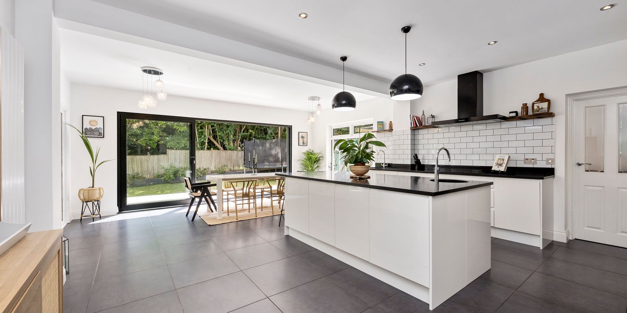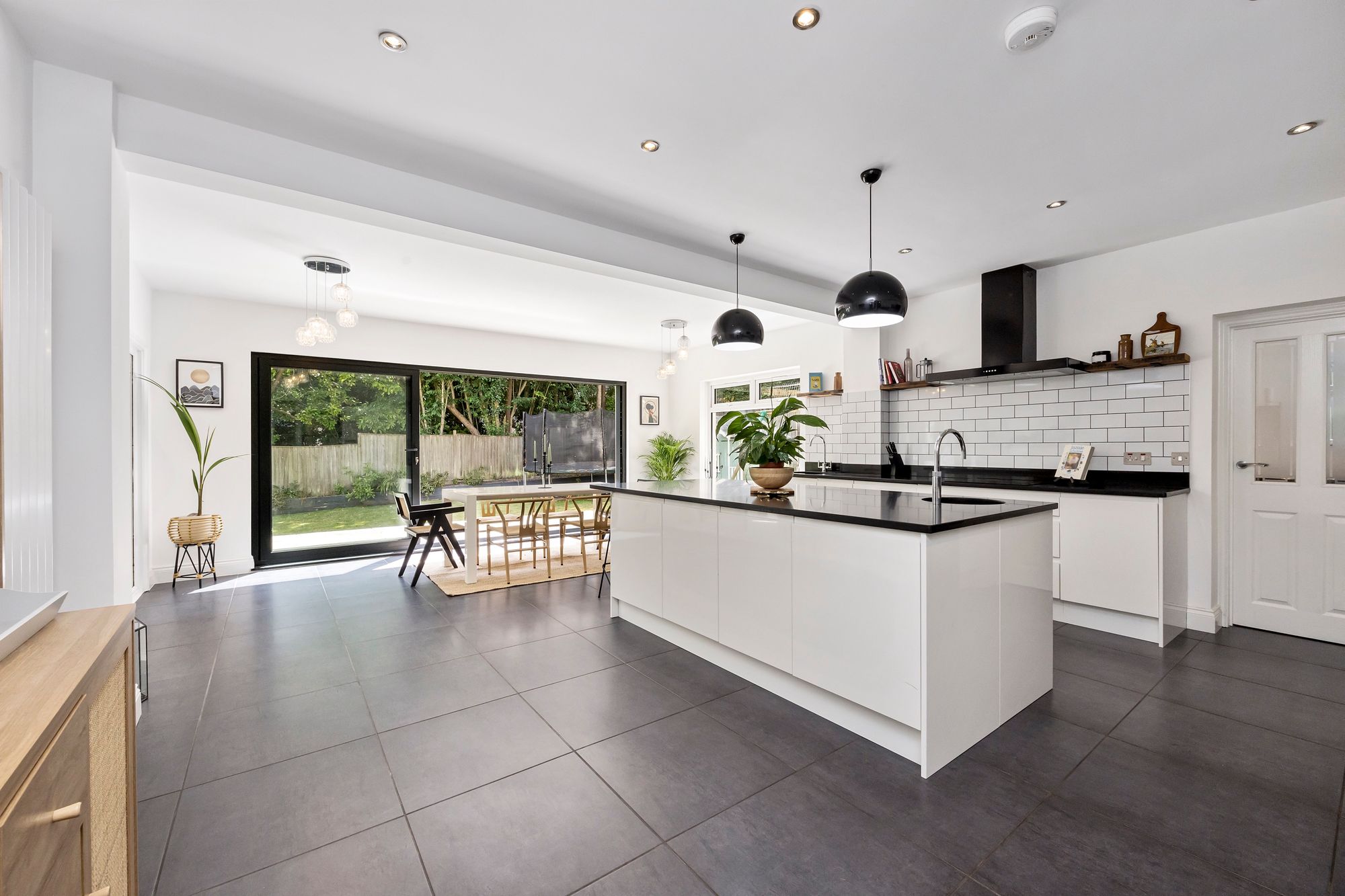 Adjacent, the hub of the home follows in the open plan kitchen / dining area showcasing floor-to-ceiling sliding doors seamlessly blending indoor / outdoor living whilst the kitchen itself is well-equipped with sleek handless wall and base units, granite work-surfaces with a tiled splash-back, induction hob with extractor fan above, integrated appliances and large centre island with a breakfast bar.