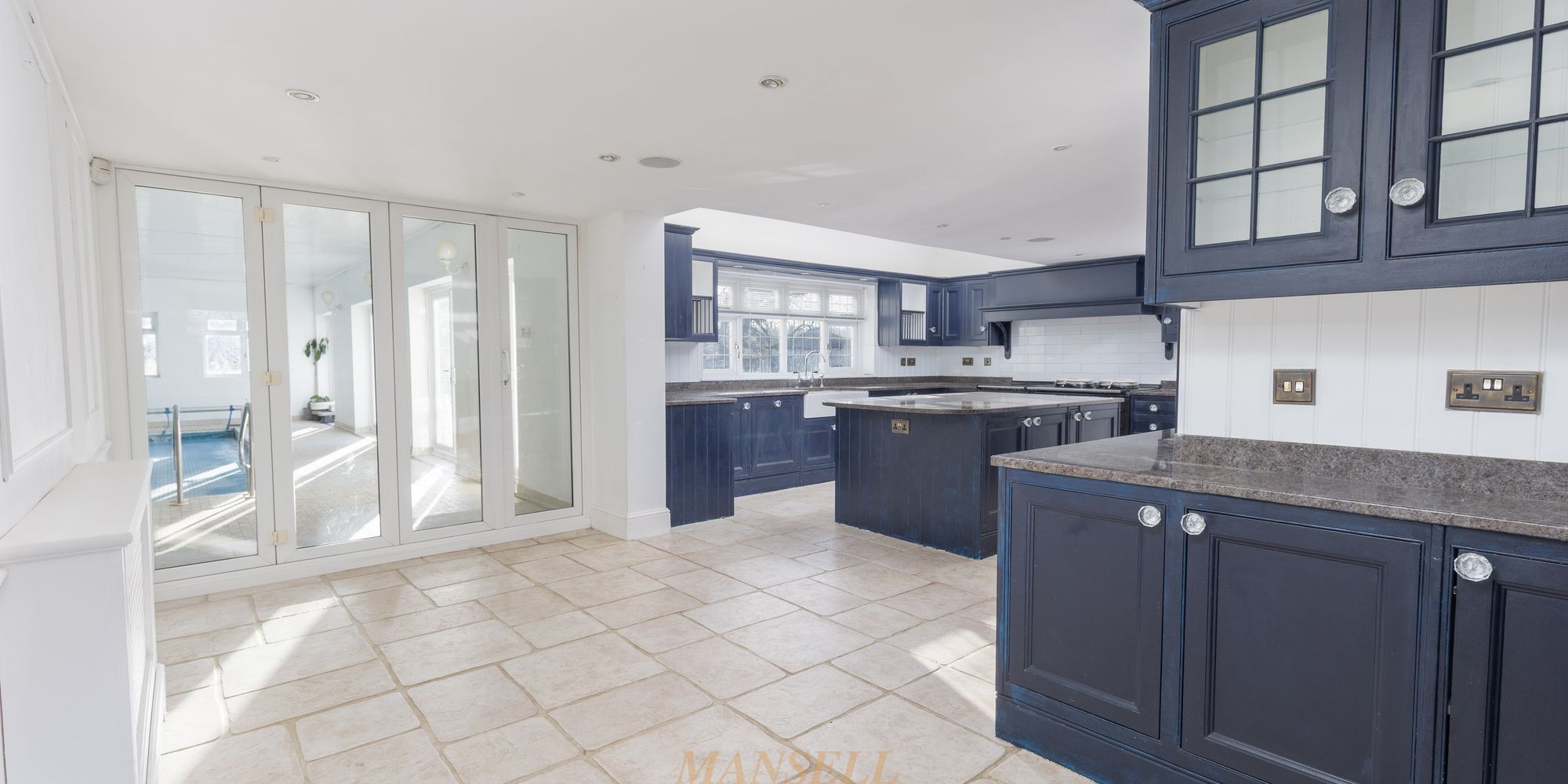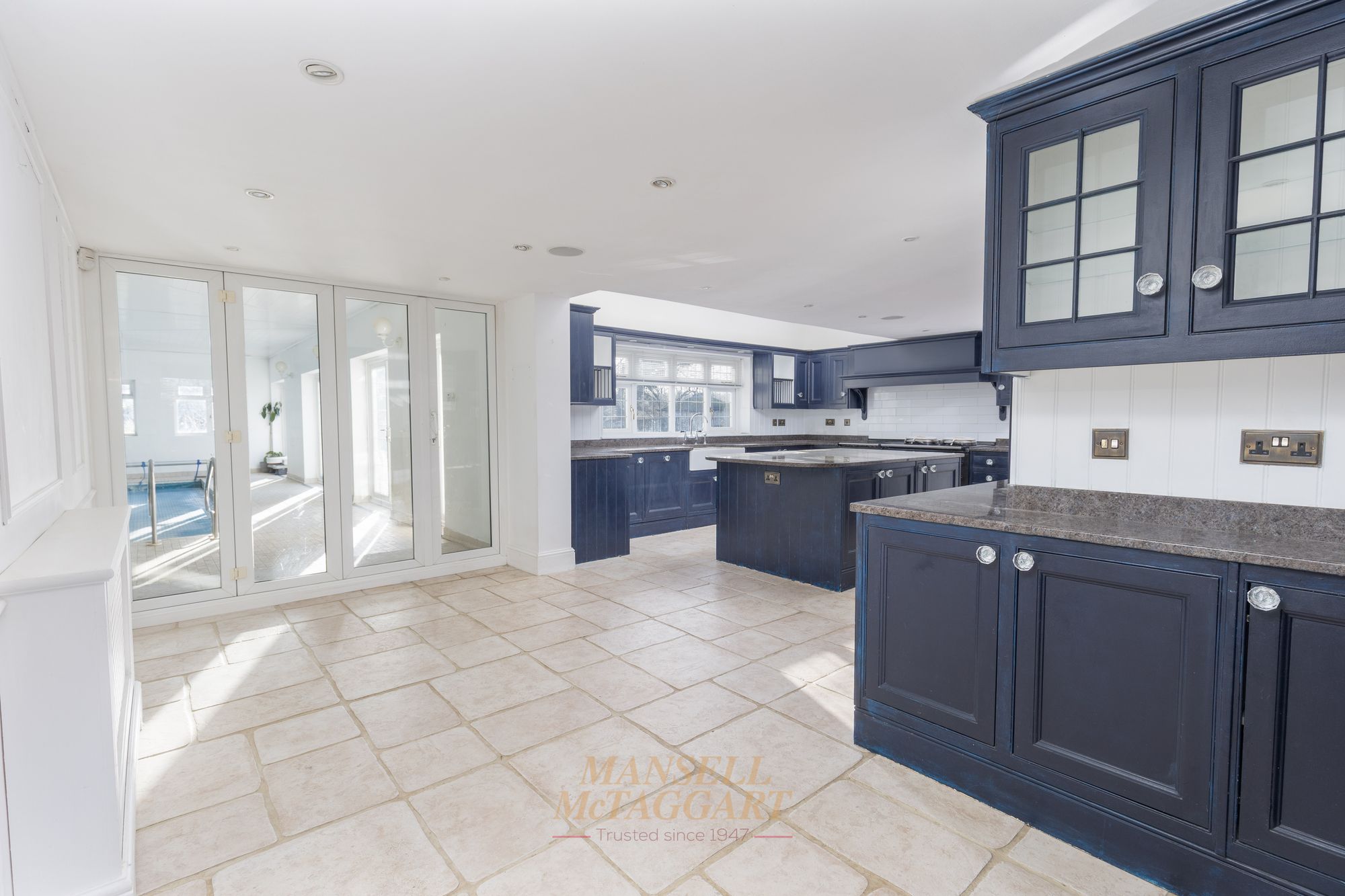 Upon entering, you are greeted by a spacious entrance hallway, complete with wooden flooring and a full-height feature window to the front, setting the tone for the generous accommodation throughout. Off the hallway, a large walk-in understairs storage cupboard offers fitted shelving and lighting, while a well-appointed downstairs cloakroom features a low-level WC, wash hand basin with vanity storage beneath, and a front-facing window. To the left is a reception room, previously used as a cinema room, while the triple-aspect living room to the right invites natural light and garden views and features an elegant fireplace that adds warmth and character, creating a versatile space for entertaining and relaxing. The dining room, accessed via double doors from the living room, provides plenty of space for family meals and gatherings, featuring wooden flooring and double doors that open directly into the garden. The kitchen/breakfast room is beautifully fitted with a range of wall and base units, complemented by integrated appliances, including an AGA with extractor above, an American-style fridge/freezer, a Miele wine cooler, an under-counter fridge, and a dishwasher. Granite worktops and tiled flooring enhance the space, while rear-facing windows and a skylight flood the room with natural light. A central island provides additional storage and incorporates an integrated Miele microwave, creating a stylish hub for cooking. Off the kitchen, the utility room provides additional storage and workspace, fitted with a range of wall and base units, granite worktops, and a door and window to the front. Adjacent, a study offers a dedicated space for a home office. Rounding off the ground floor is a spectacular indoor swimming pool, complete with changing facilities, a further cloakroom, a shower, and a sauna. With direct access to the garden, this area provides the perfect environment for relaxation, entertaining, and embracing a luxurious lifestyle.