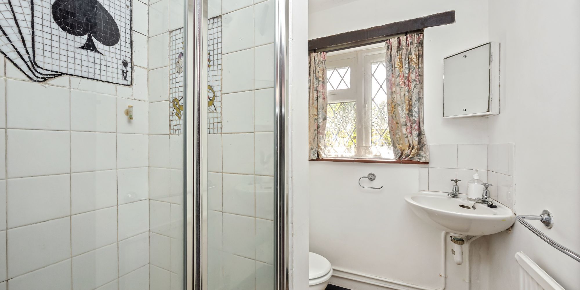 White suite with low level w/c, basin, single shower cubicle with double glazed window offering natural ventilation.