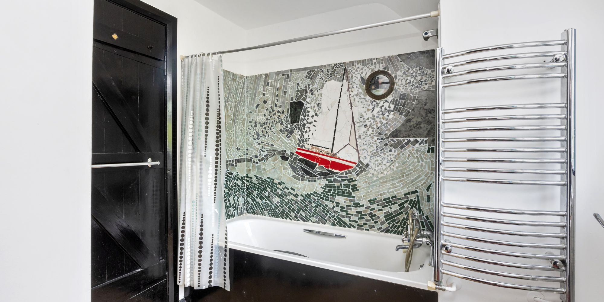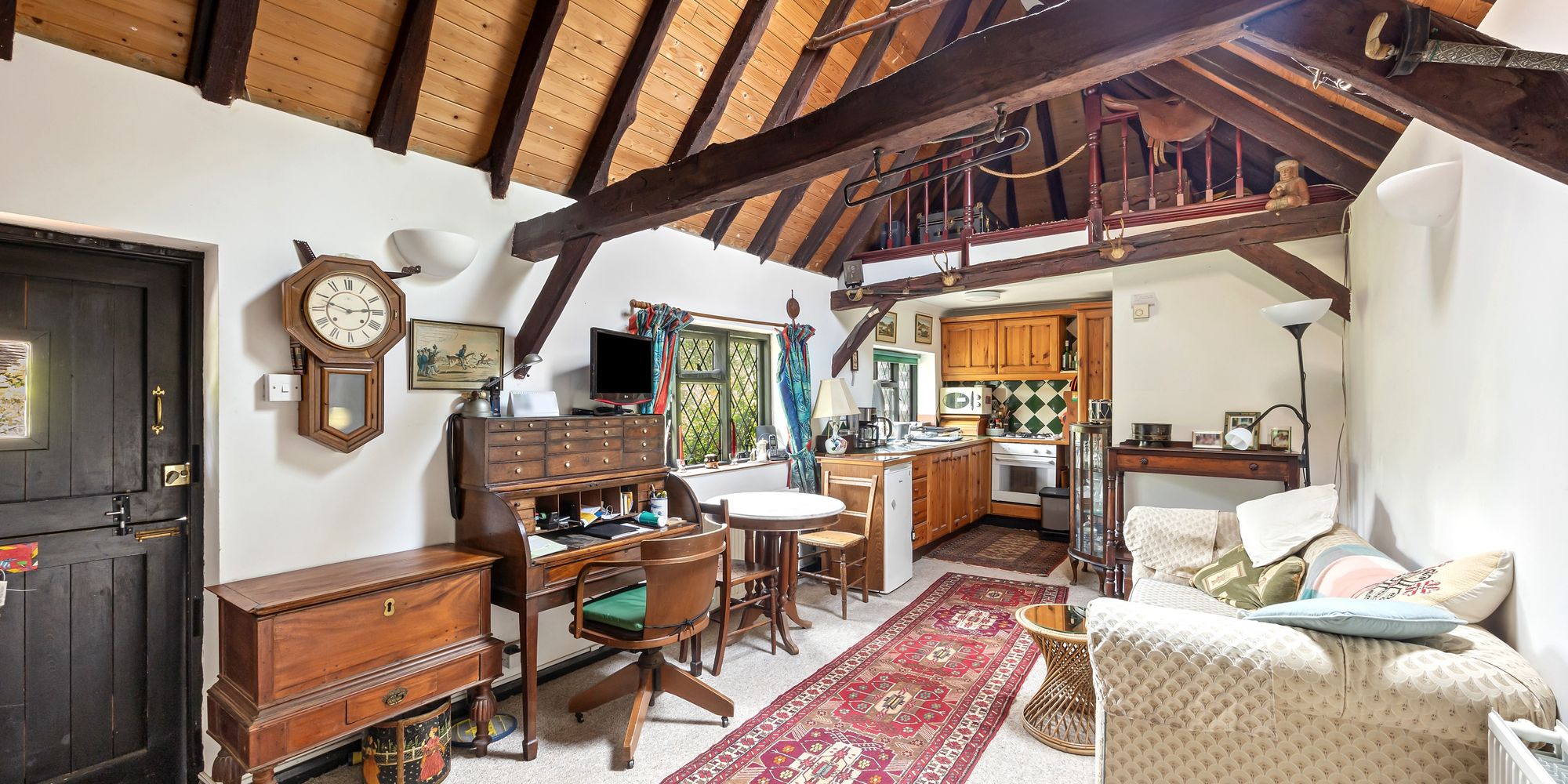 On the opposite side of the main room is a door leading to the sizeable bedroom. Both bedroom and reception room have mezzanine storage areas accessed by ladder.