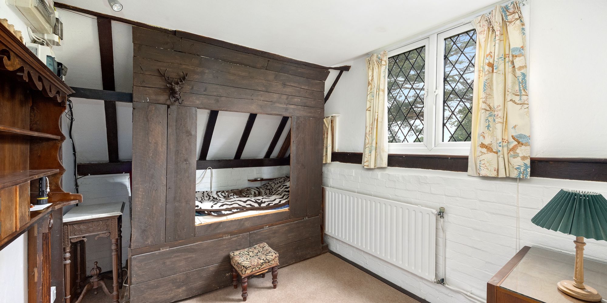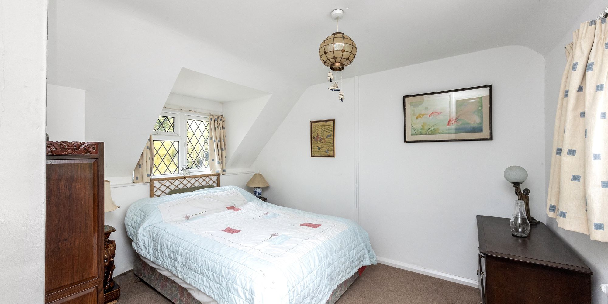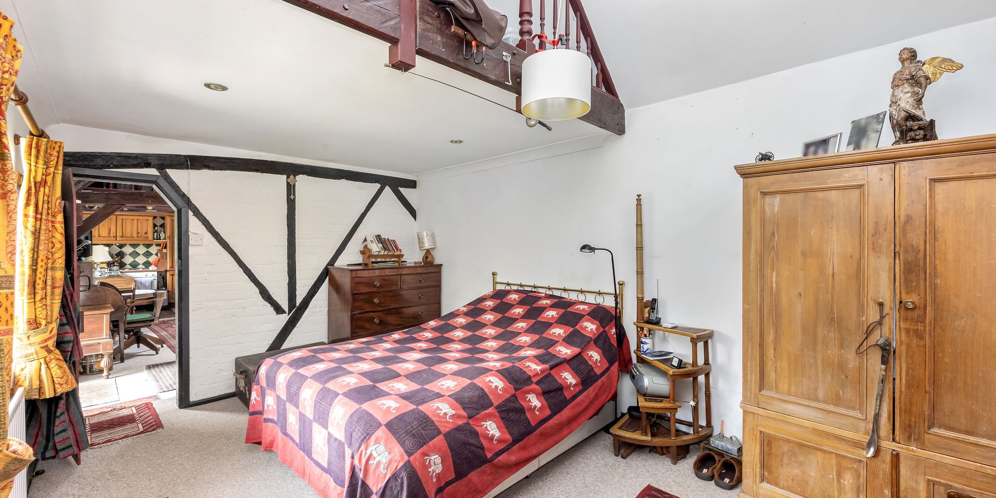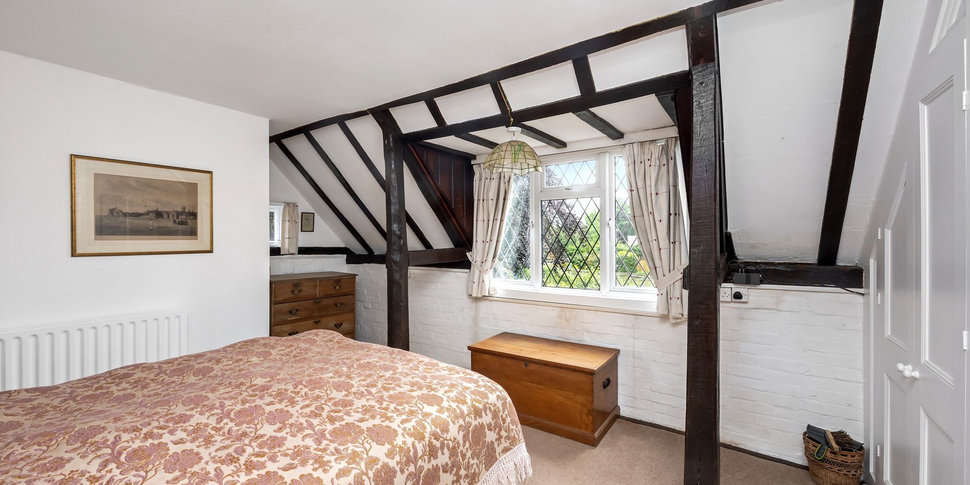 First door on the left is to the principal bedroom, a large double with part-vaulted ceiling and exposed beams. Fitted wardrobes line one wall, and a uPVC double-glazed window offers partial views of the South Downs.