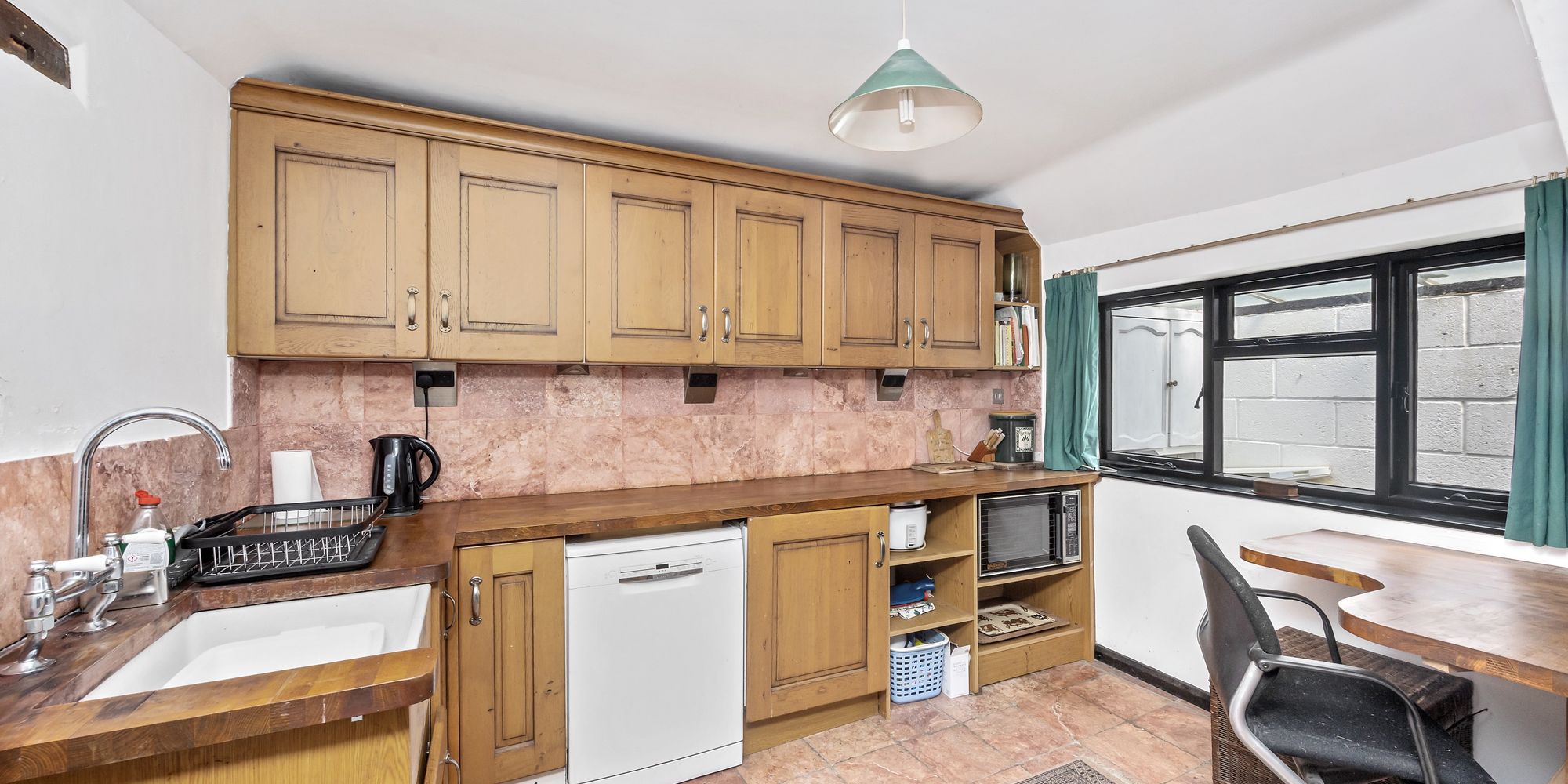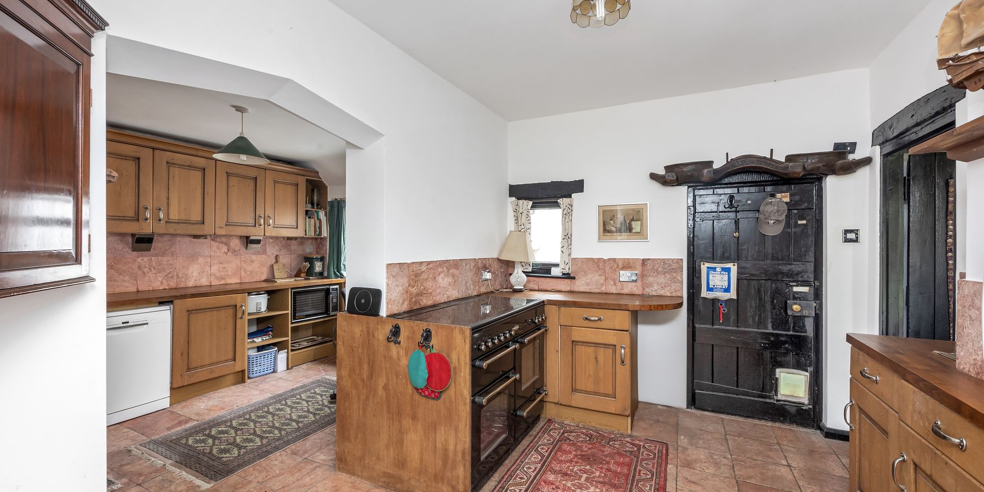 Country-style kitchen separated into three areas: two linked kitchen spaces and a breakfast room, all with fully tiled floor. The kitchen areas have custom-built, wall-mounted and base-level solid wood cupboards with solid wood countertops. Appliances include a freestanding Rangemaster 5-ring hob/oven, freestanding dishwasher, washing machine, fridge freezer and ceramic butler sink. The Breakfast room comfortably seats six and has uPVC double-glazed windows with views into the rear garden.