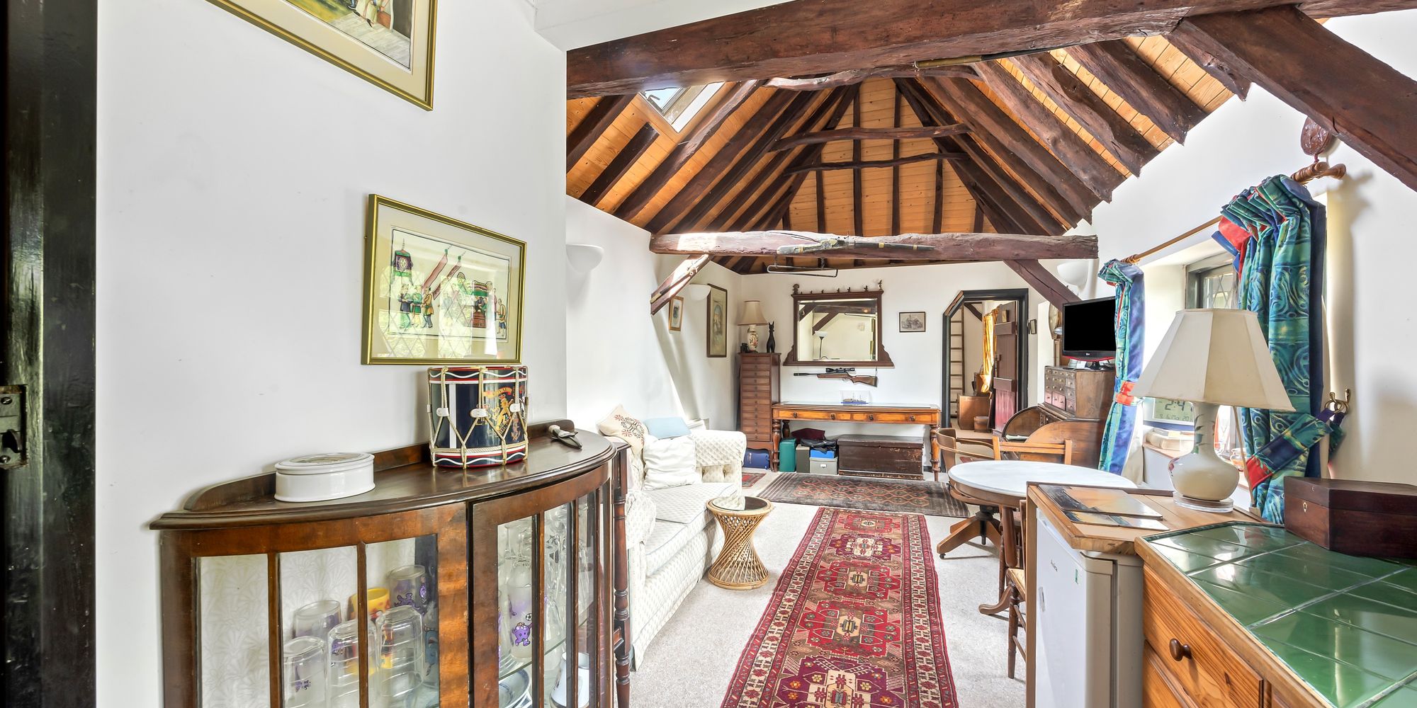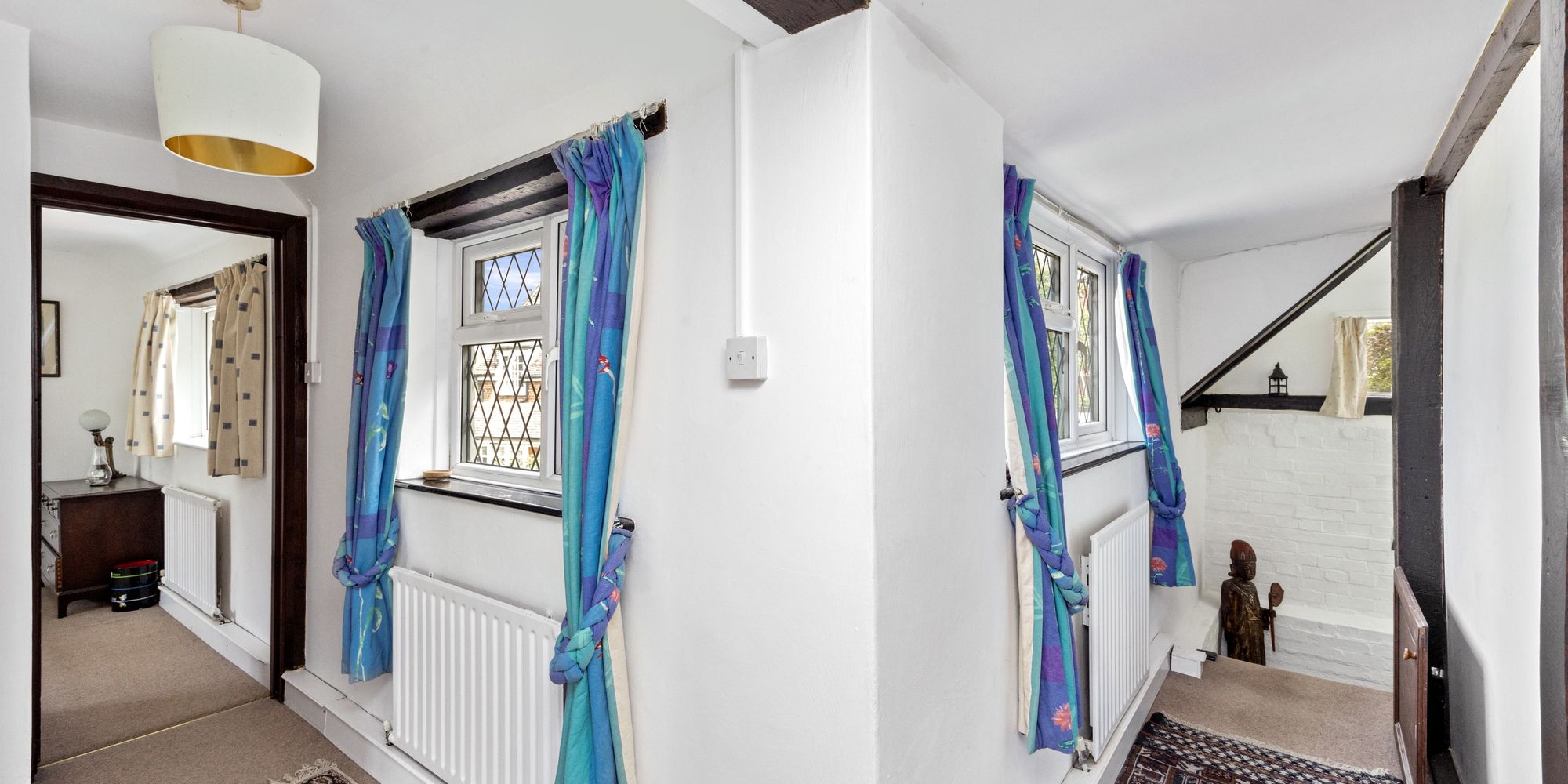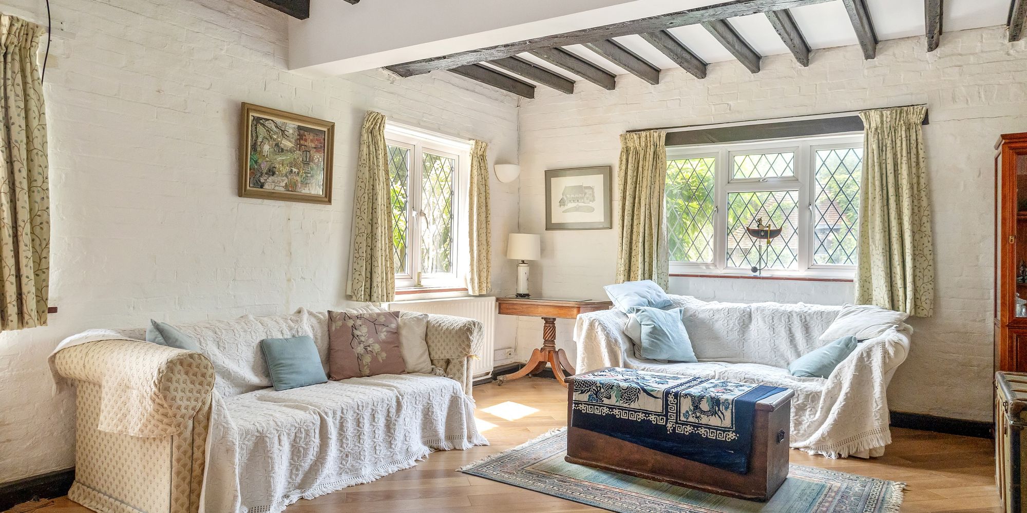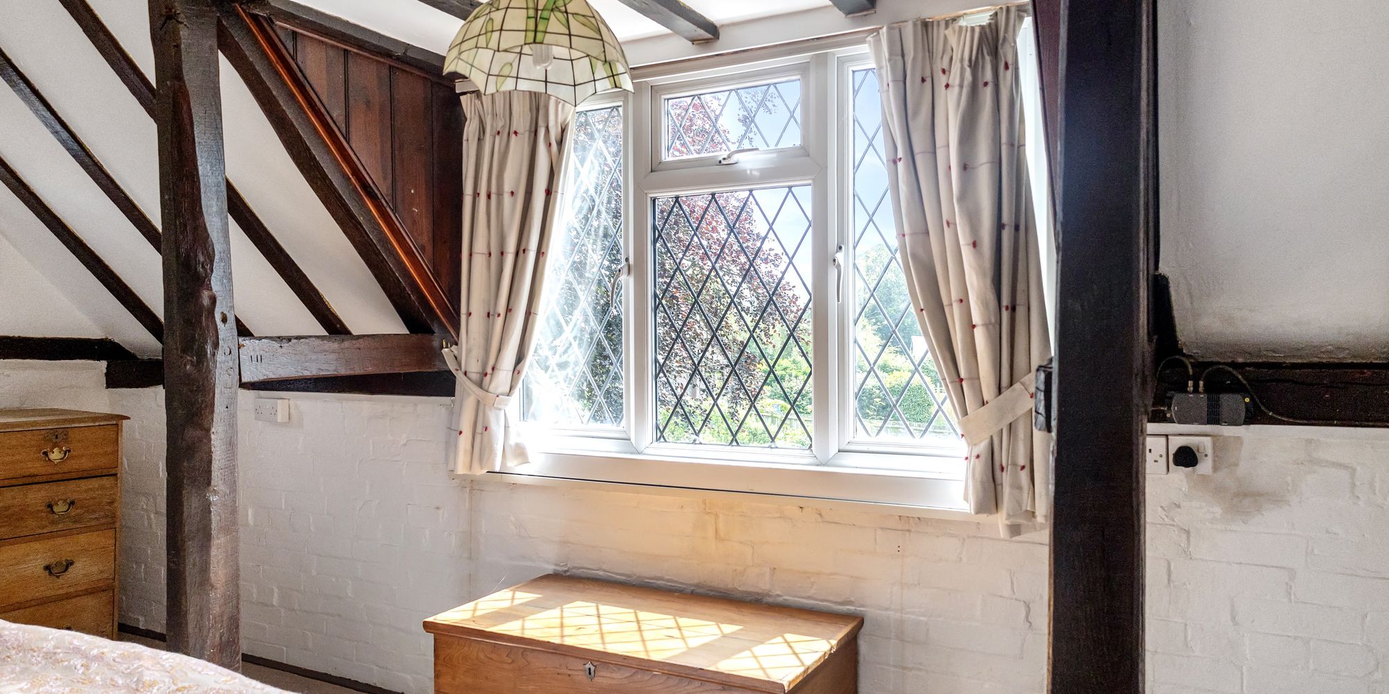 Large, dual aspect room with views into the gardens, exposed ceiling beams, uPVC double-glazed windows and understairs storage niche.