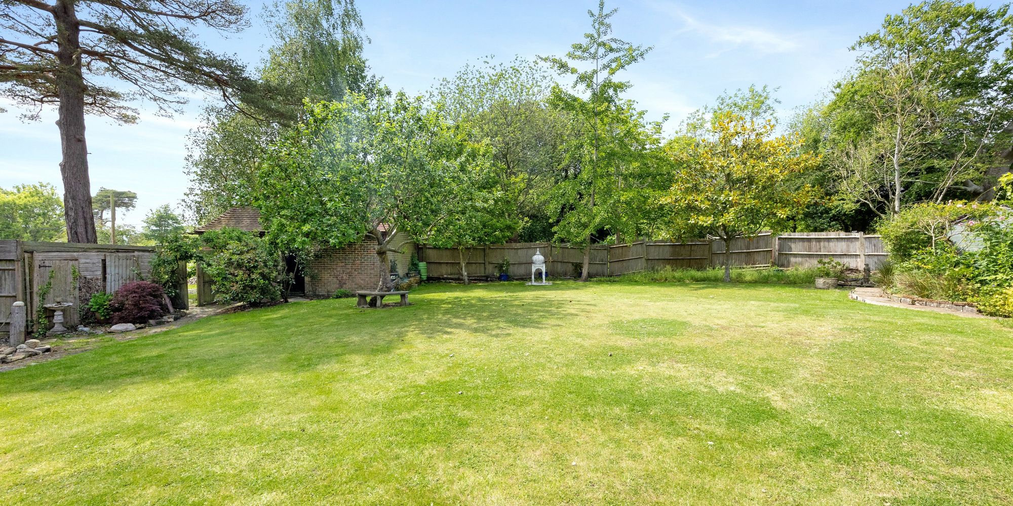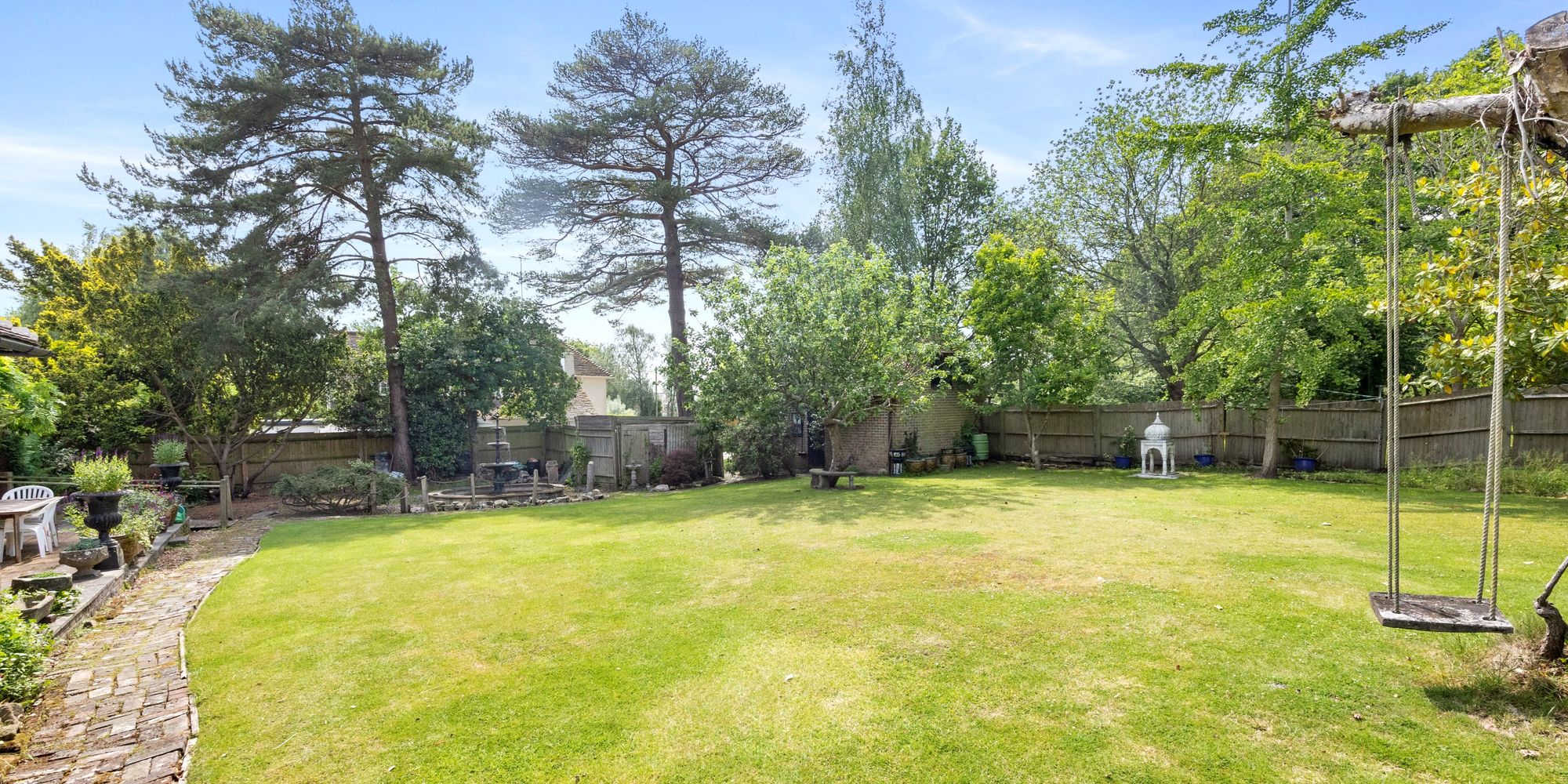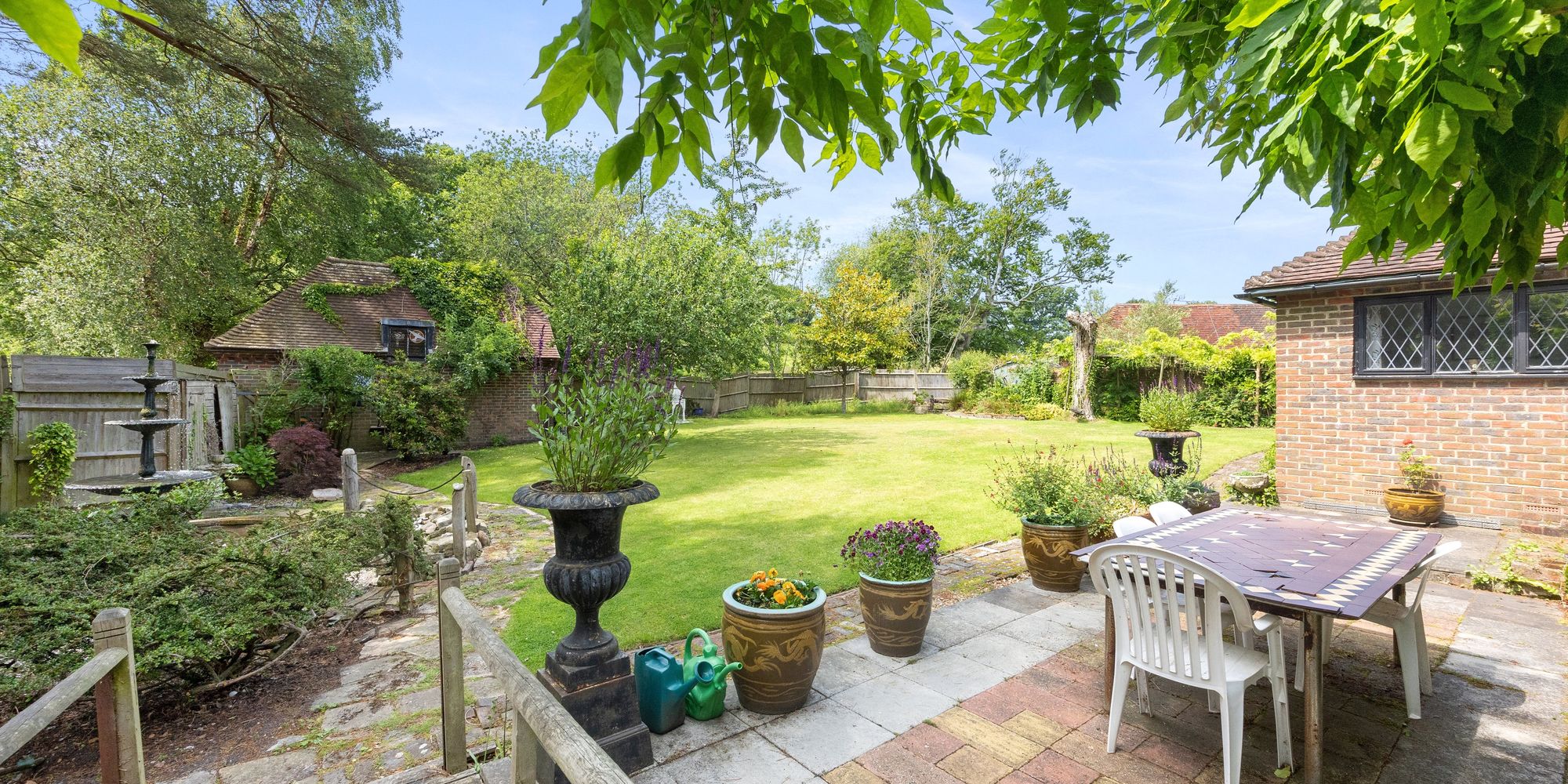 A spacious south/west facing garden with large lawn, sunny terrace and patio for outside seating and shingled areas for pots, water features etc. Enclosed fully by wooden fence panels, access to the side door of the garage, greenhouse and more.
