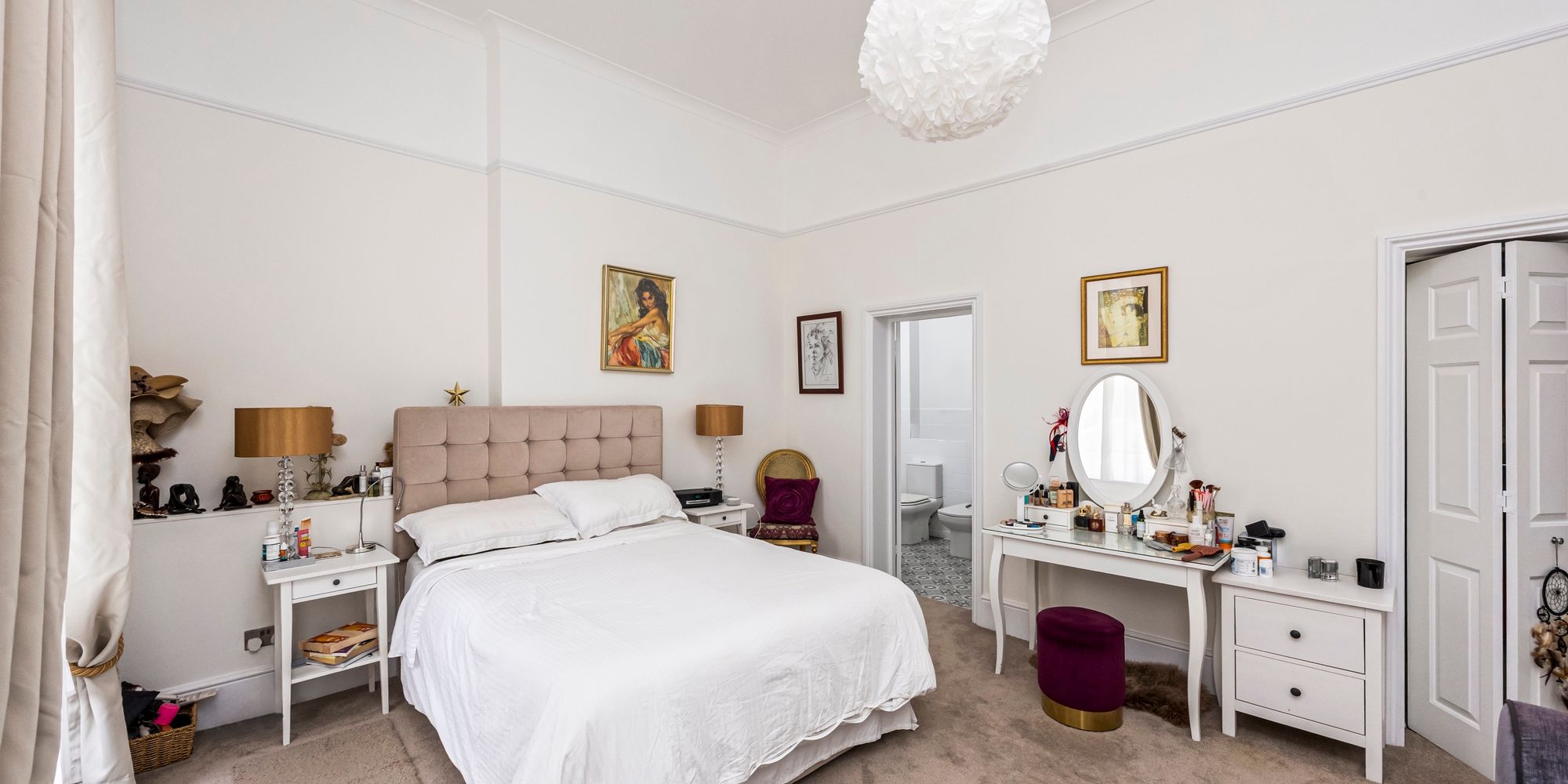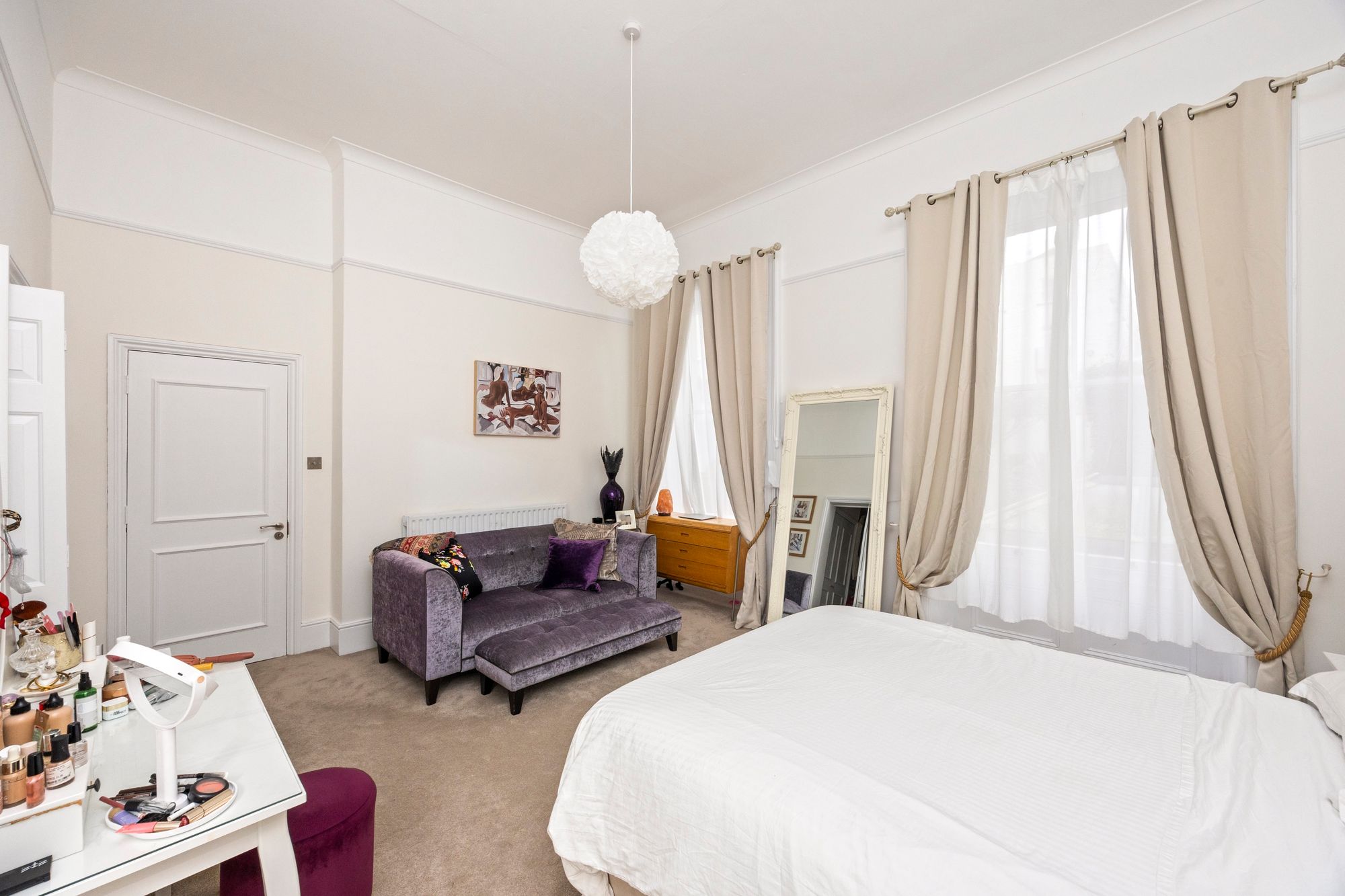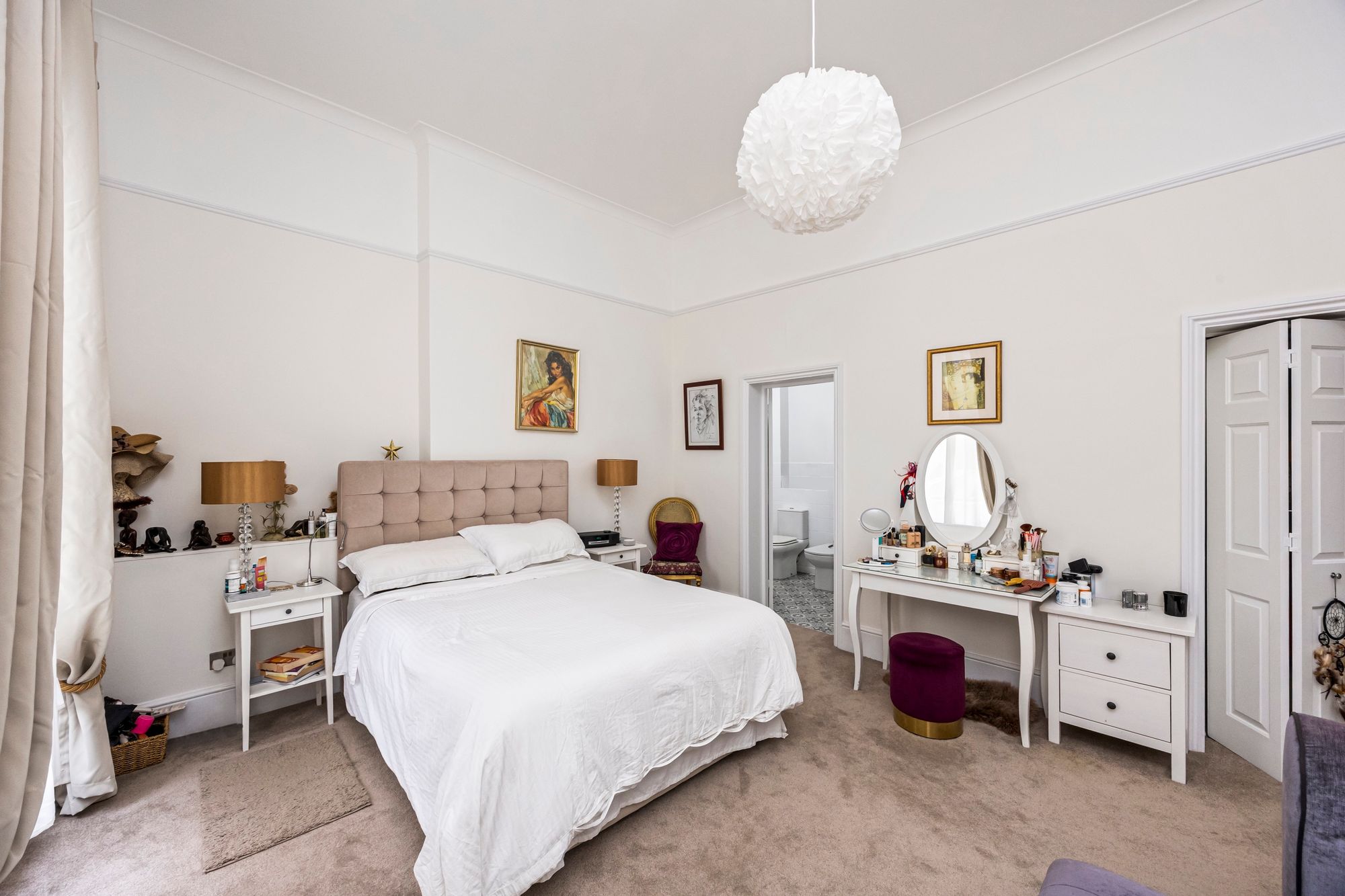 The principal bedroom is generously proportioned and benefits from beautiful sash windows, a walk-in closet for ample storage, and an en suite shower room for added privacy and comfort.