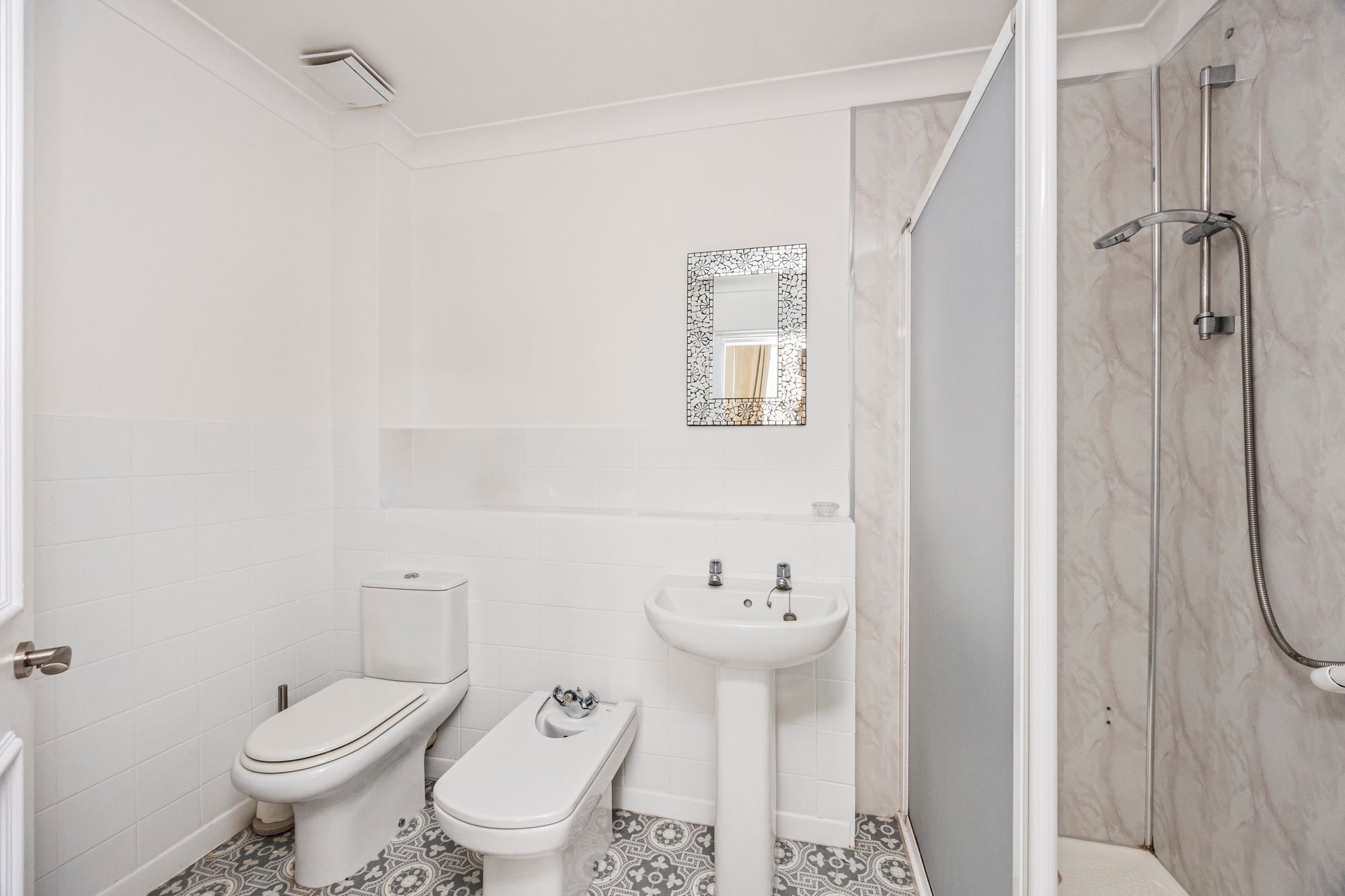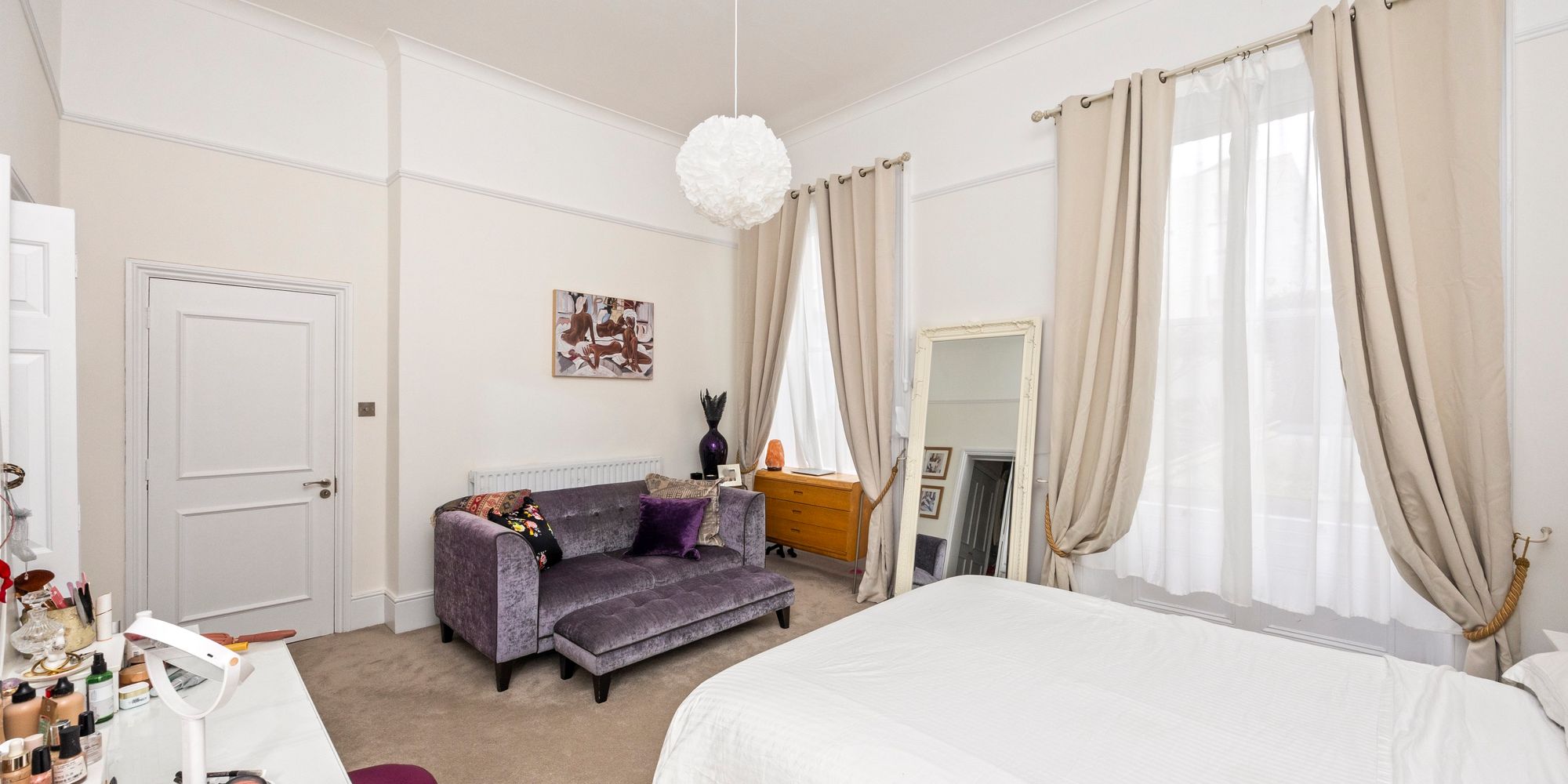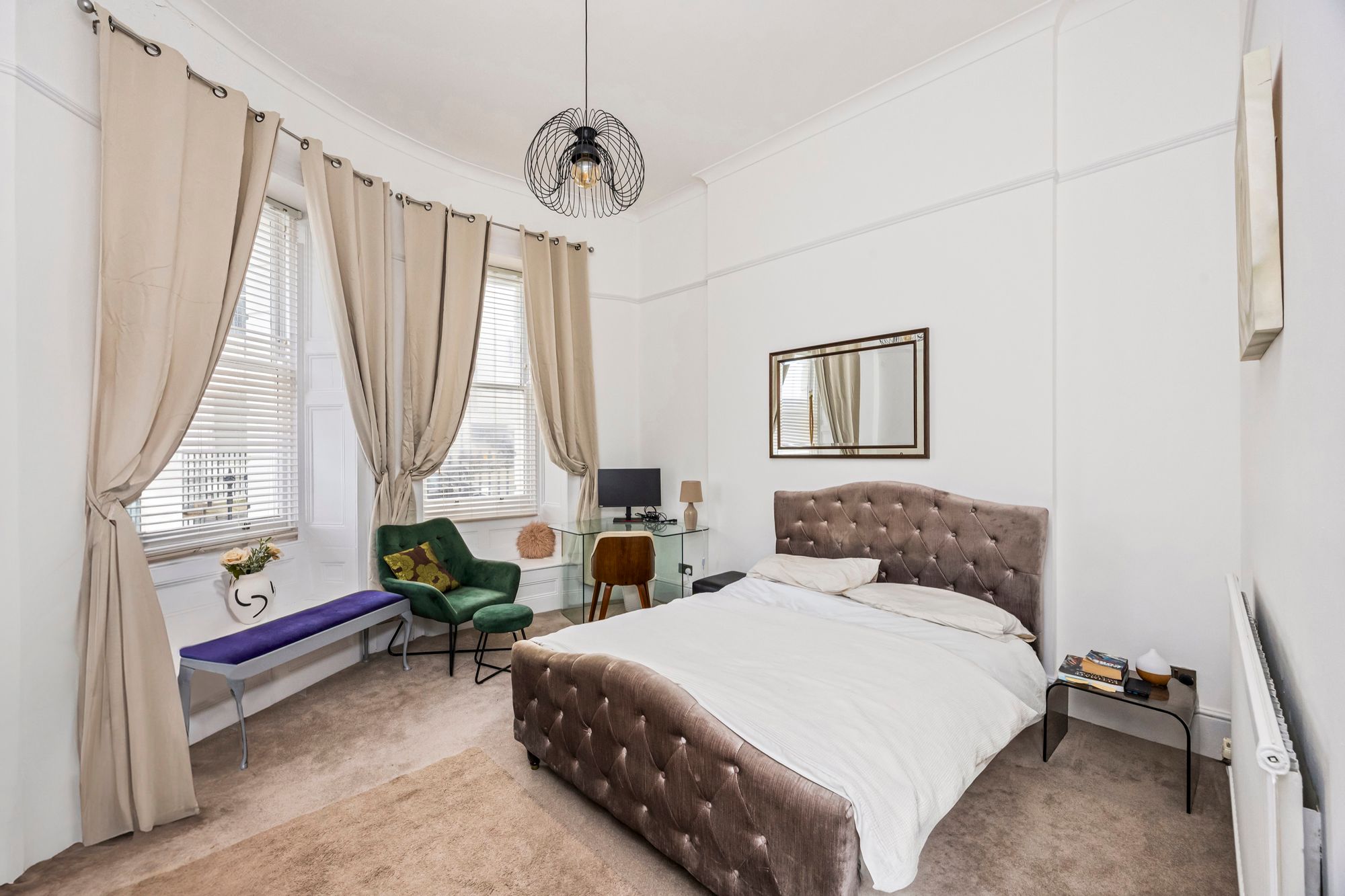 The principal bedroom is generously proportioned and benefits from beautiful sash windows, a walk-in closet for ample storage, and an en suite shower room for added privacy and comfort.