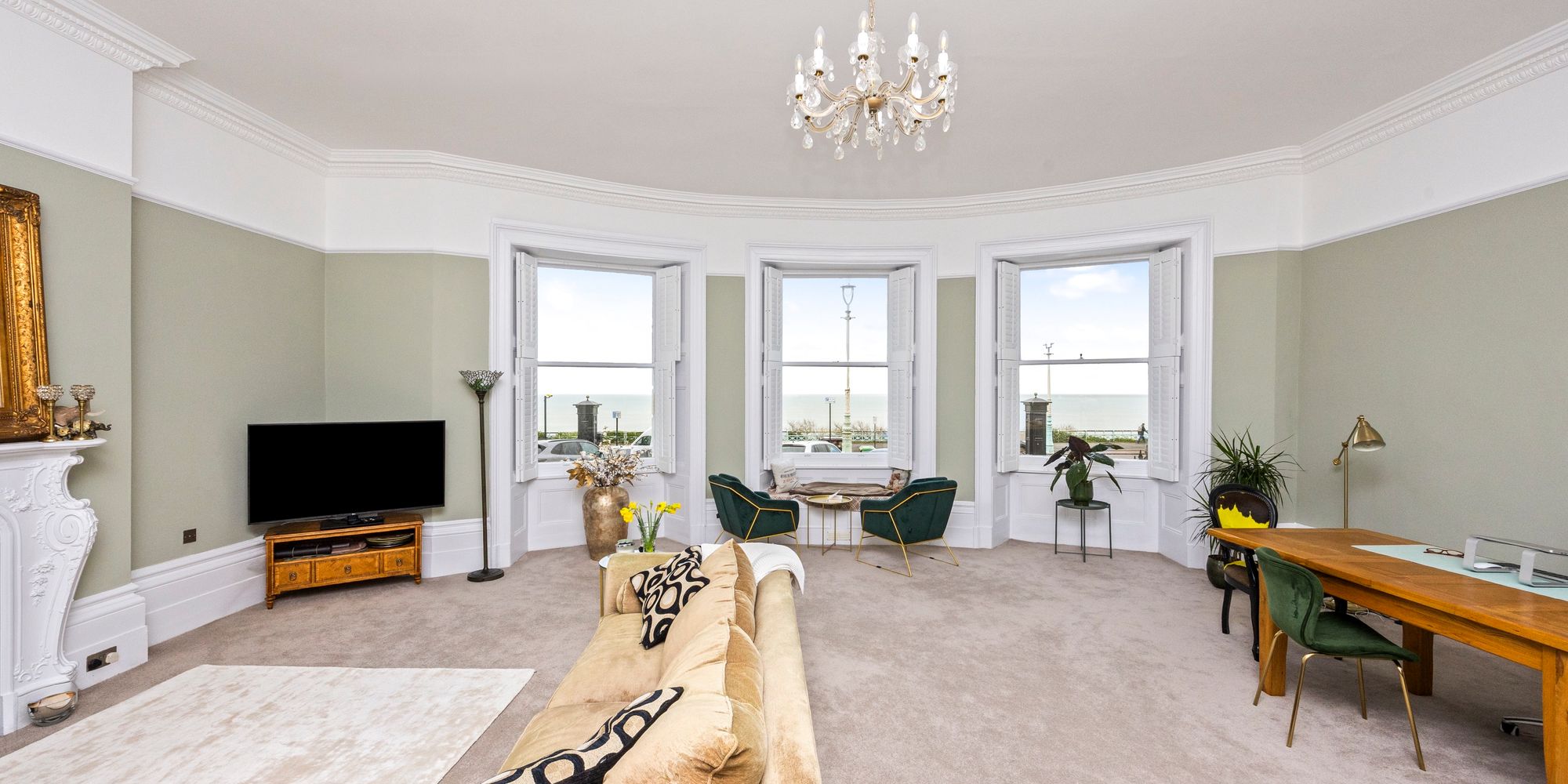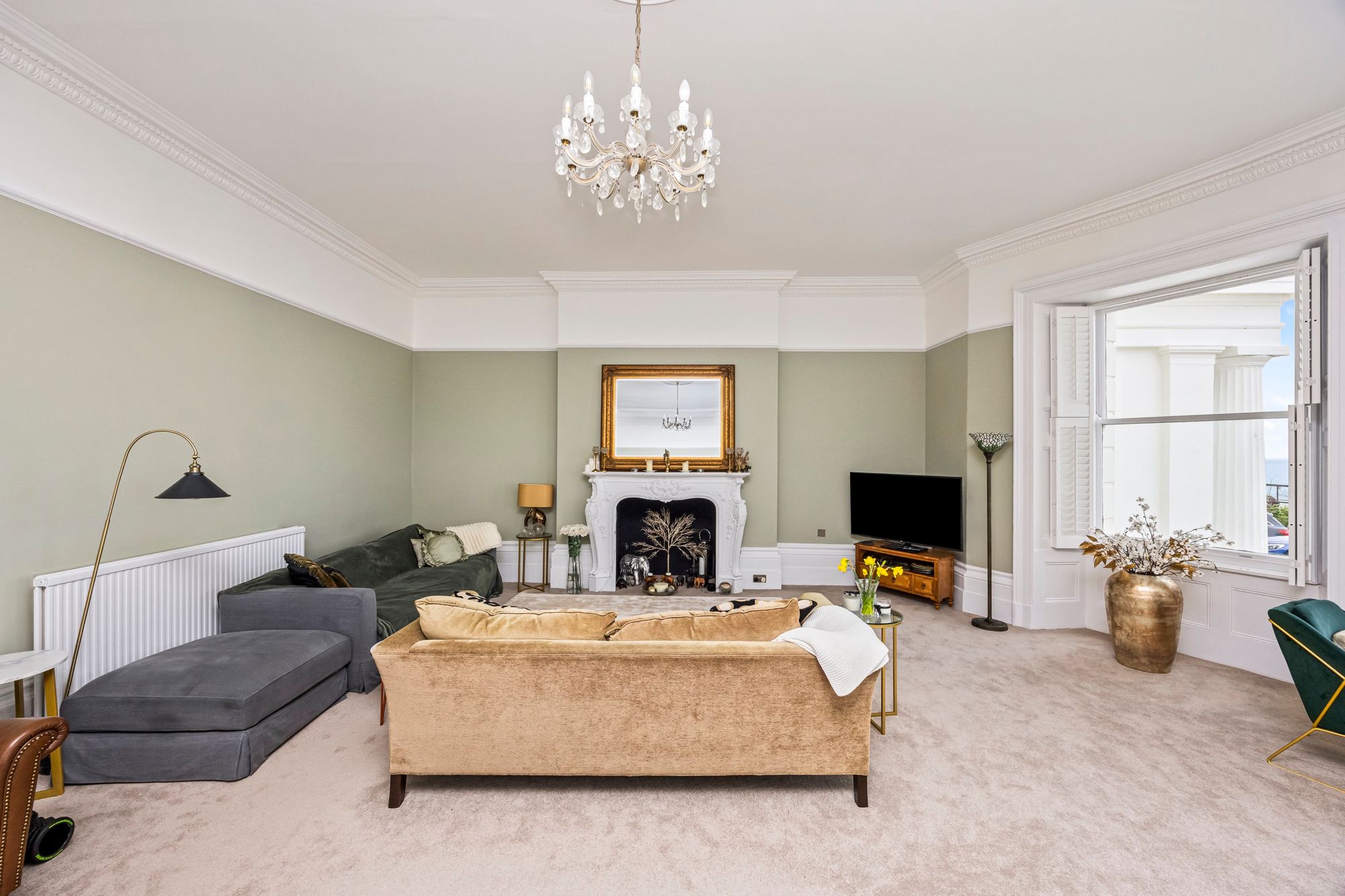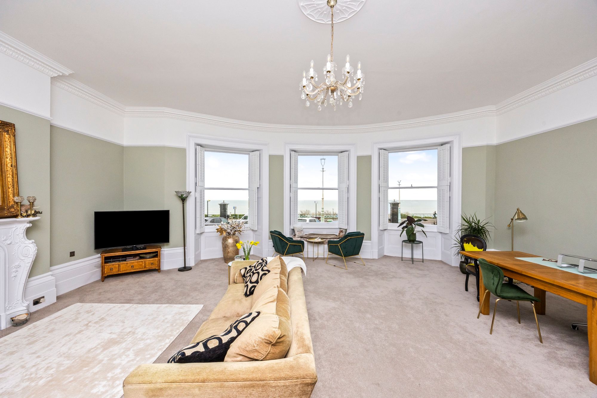 The property boasts a large lounge, where high ceilings with intricate cornicing and a stunning feature fireplace create a sense of grandeur, while expansive sash windows provide excellent sea views, filling the room with natural light.