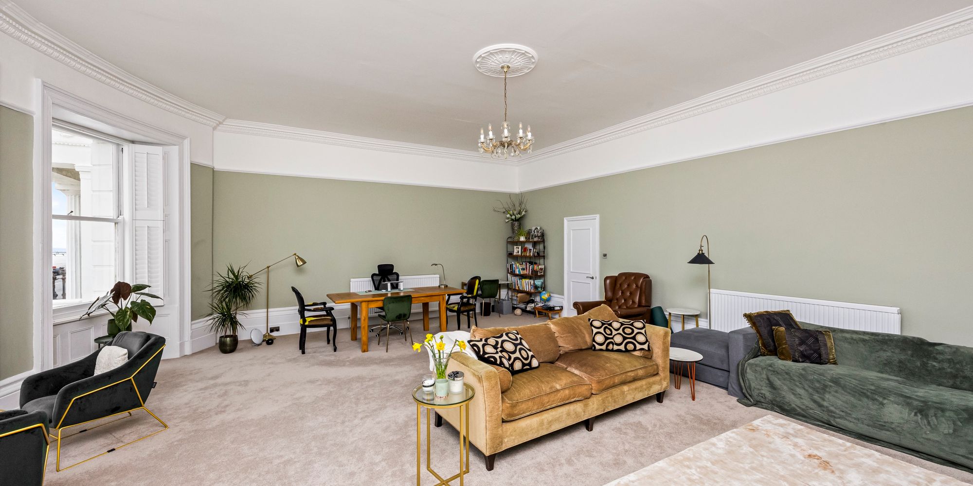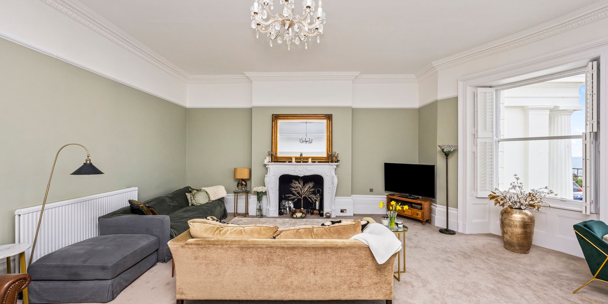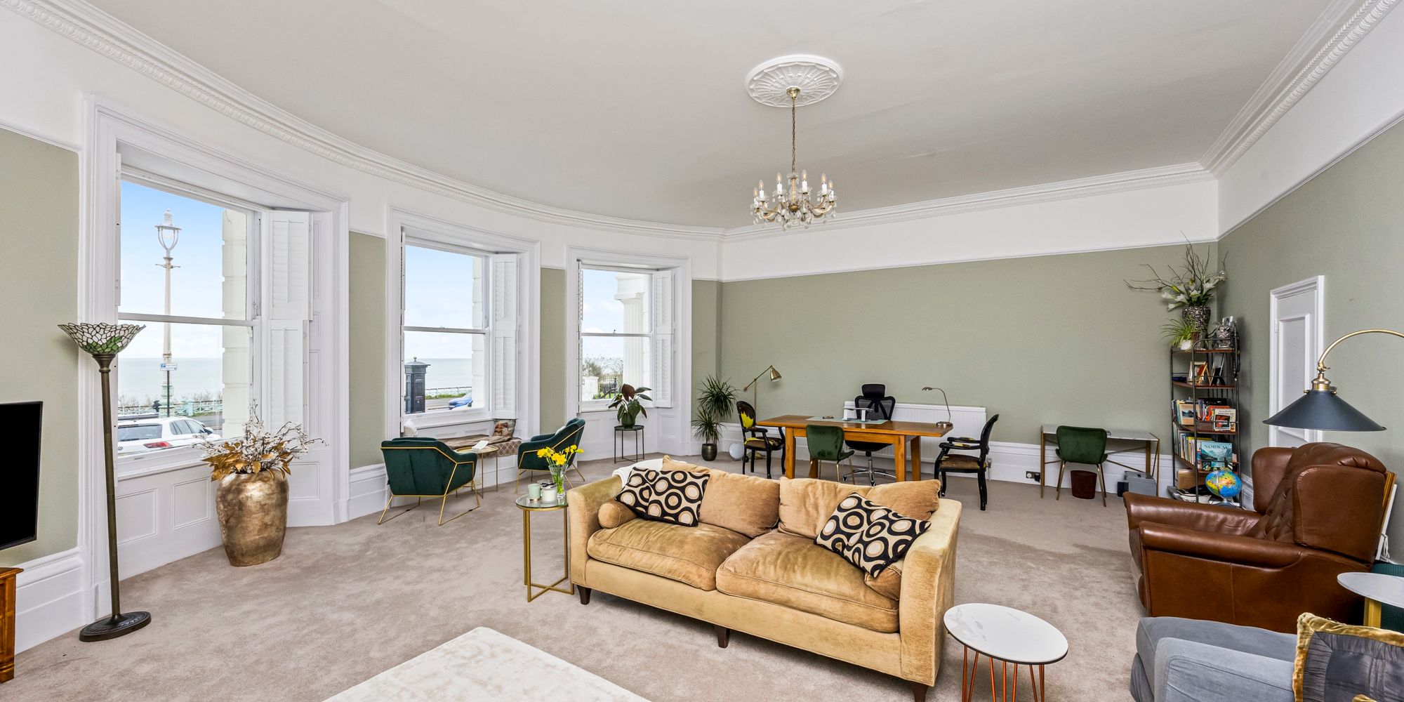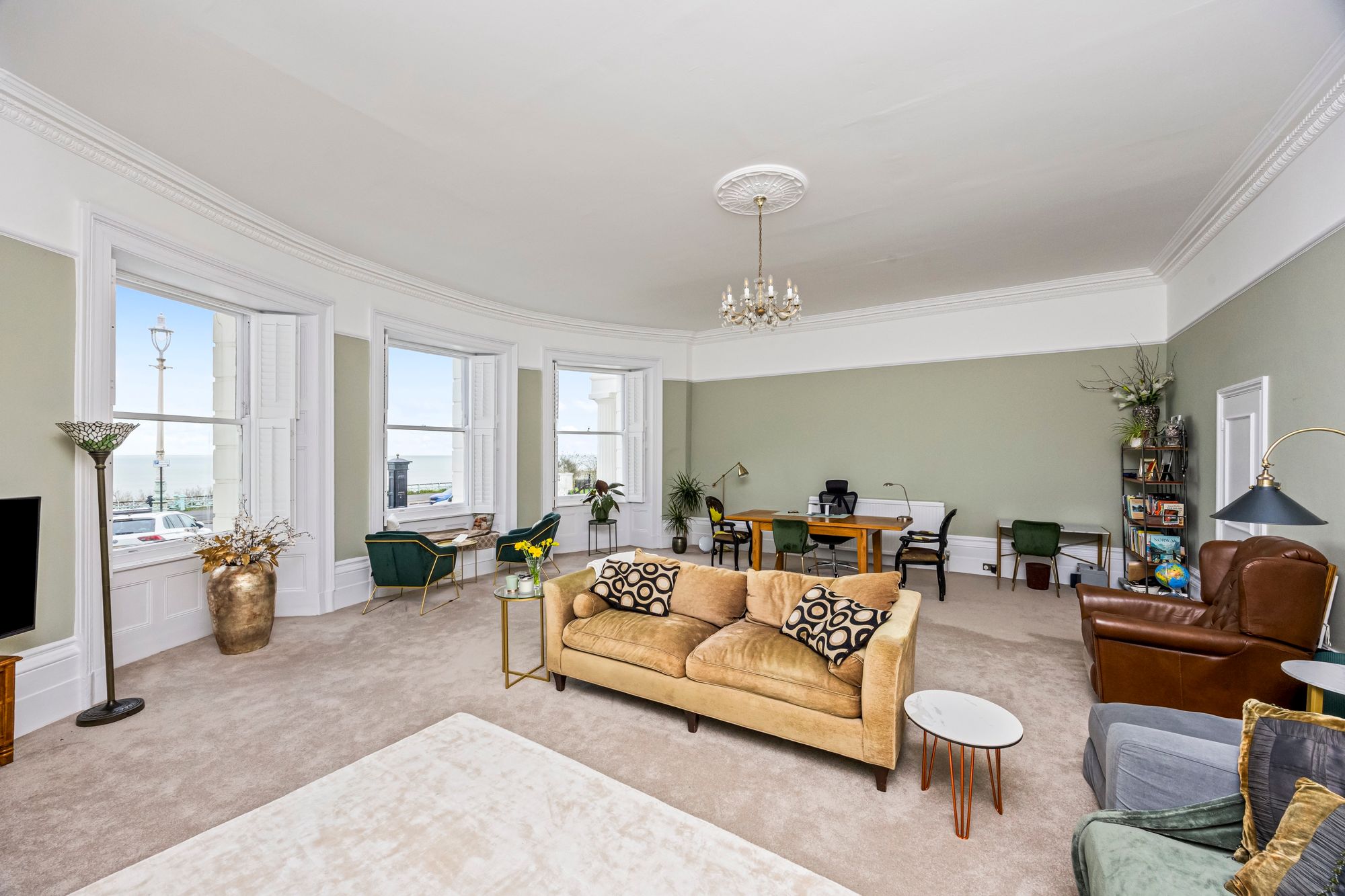 The property boasts a large lounge, where high ceilings with intricate cornicing and a stunning feature fireplace create a sense of grandeur, while expansive sash windows provide excellent sea views, filling the room with natural light.