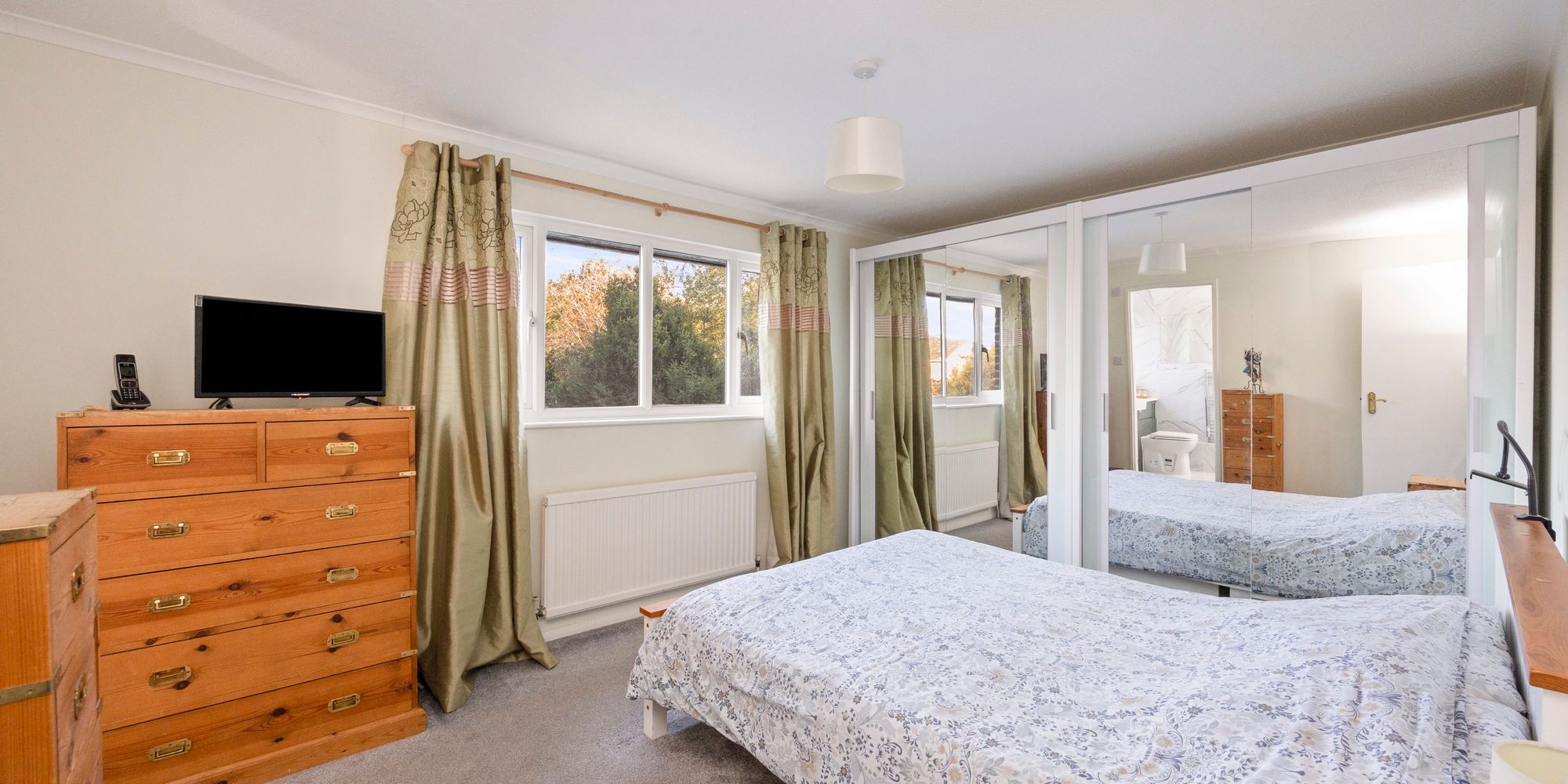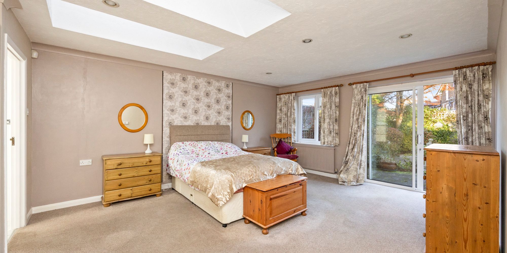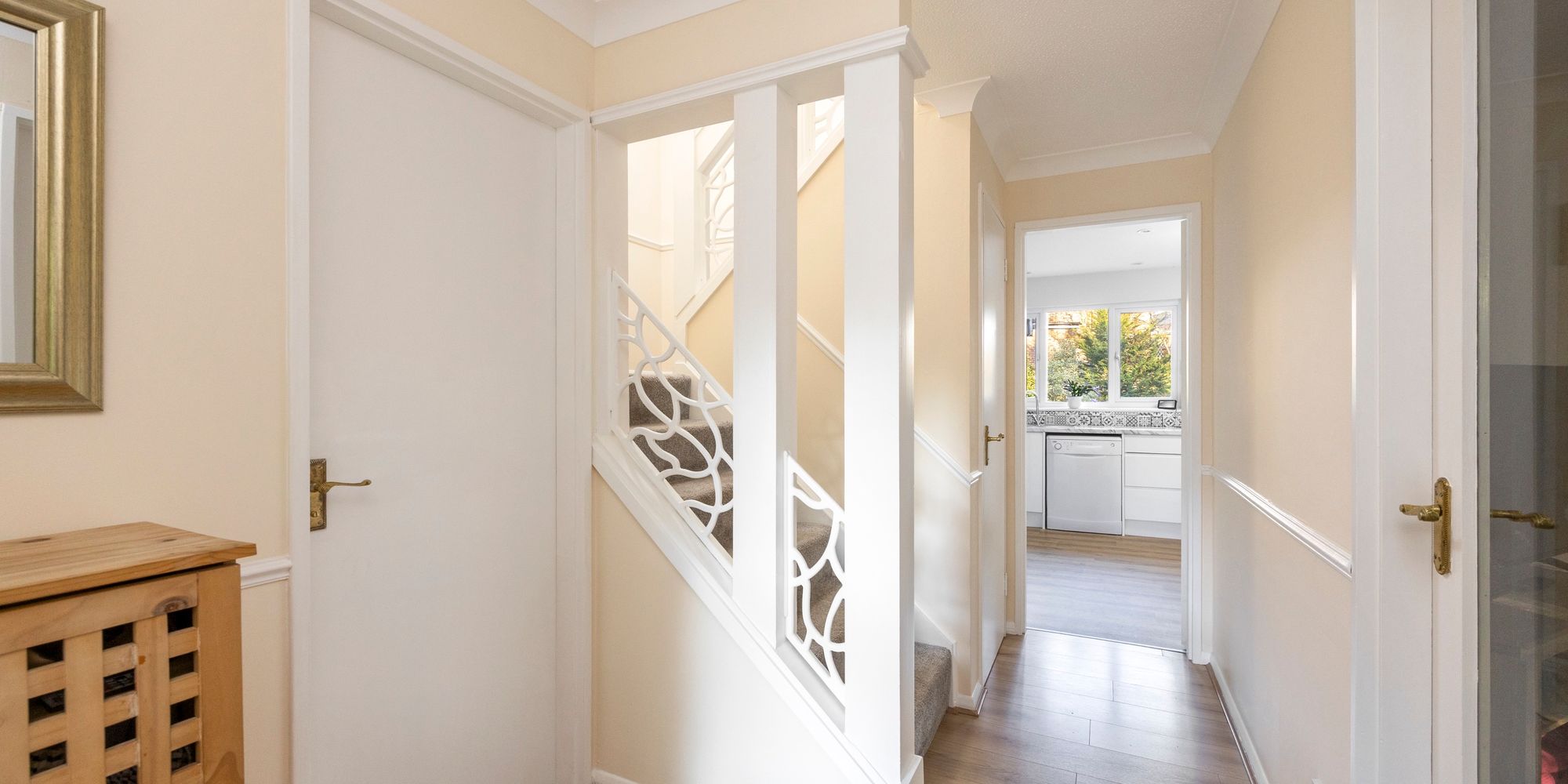 Ascending the main staircase, set beneath Art Deco–style balustrades and complemented by a feature window, the first floor presents four well-proportioned bedrooms. The principal bedroom includes fitted wardrobes and an en-suite. The main family bathroom has been recently refitted to a high standard.