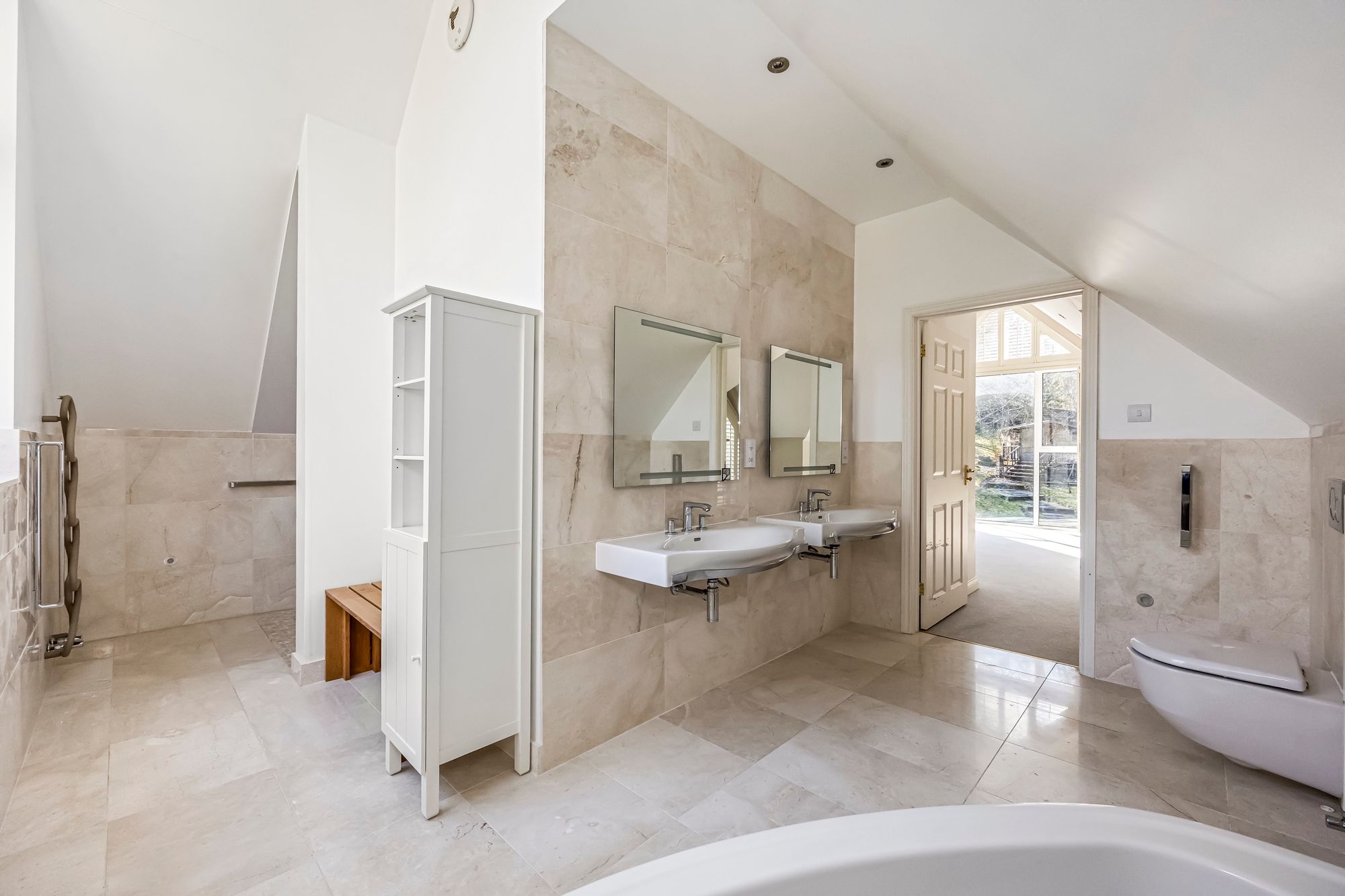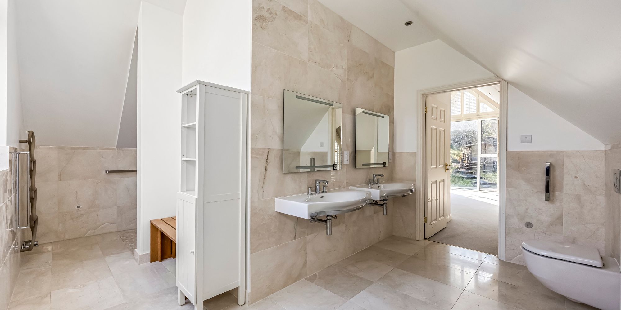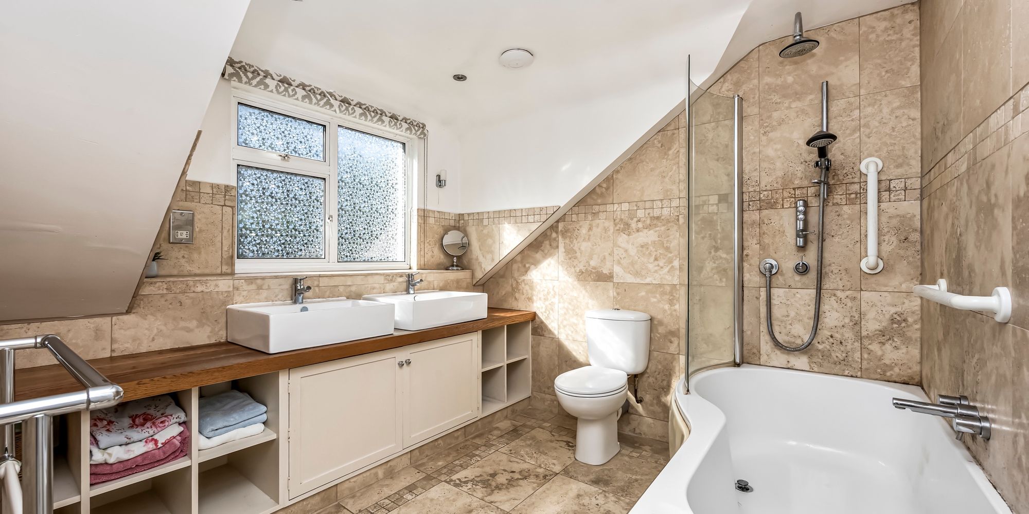 FAMILY BATHROOM: panelled bath with side taps, tiled surround and integrated shower over, dual flush low level wc, twin vanity wash basins, heated towel rail with radiator, travertine tiled flooring and window to front.