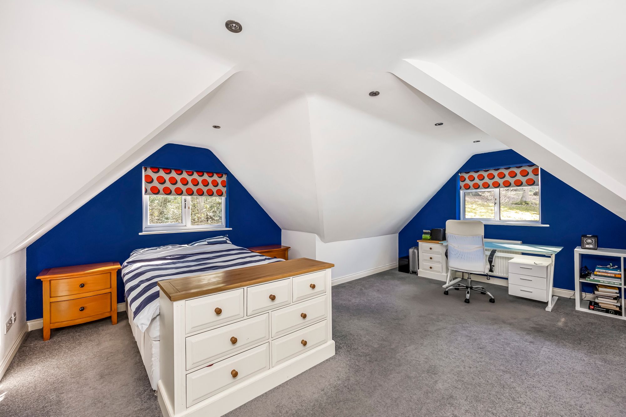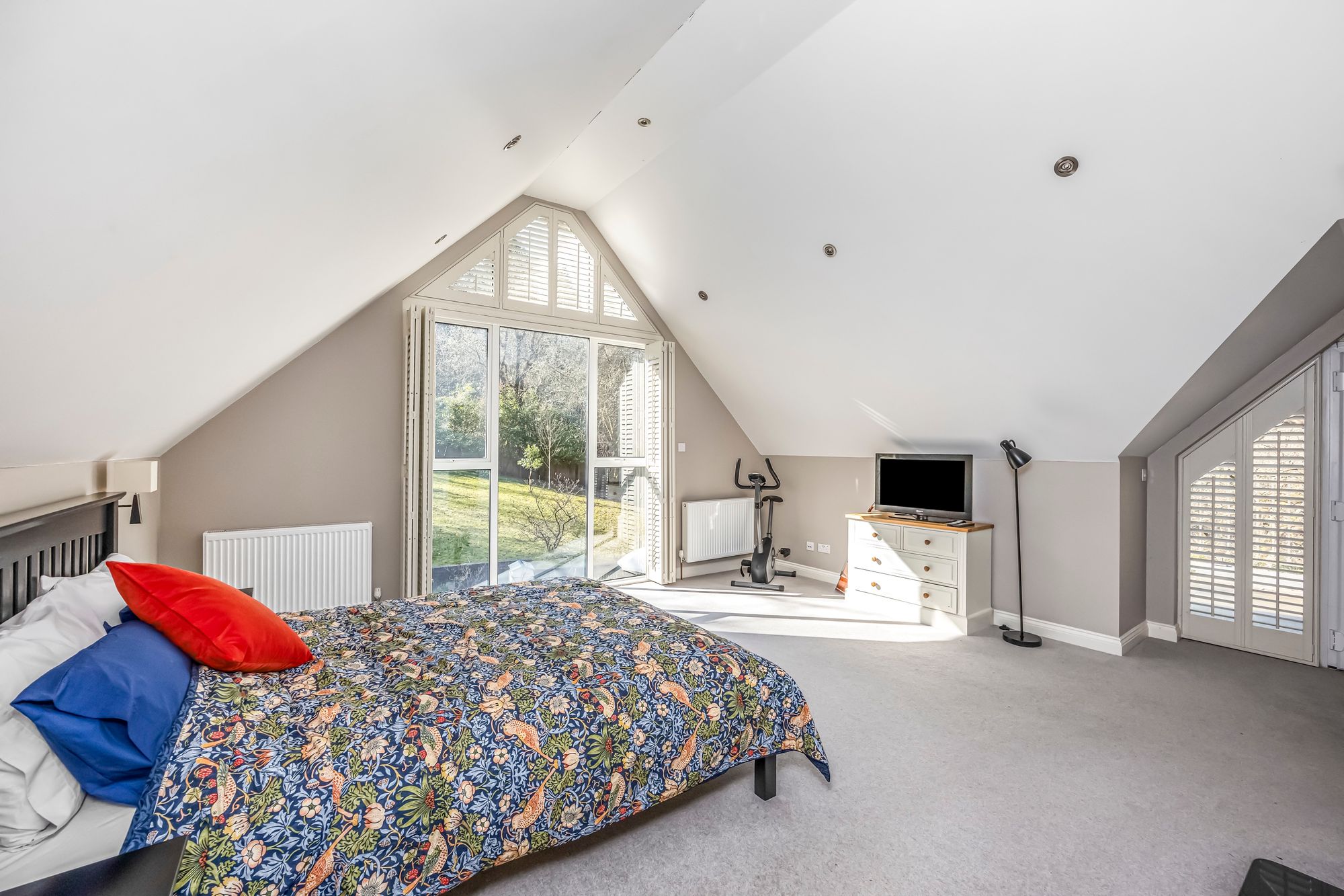 MAIN BEDROOM SUITE: An impressive vaulted bedroom featuring an inset wood burning stove with iron surround and granite hearth, a range of fitted cupboards and eaves storage, lift access from ground floor, large floor to ceiling windows with fitted blinds overlooking the front garden and door to ROOF TERRACE: A large terrace enclosed via iron balustrades and enjoying outstanding panoramic views over the forest. LARGE EN SUITE BATHROOM: Corner bath with side taps, twin sinks with mirrors above and shaver point, dual flush floating wc, walk-in wet room area with rainfall showerhead, separate shower attachment and tiled seating, two heated towel rails, tiled flooring, extractor fan and large window to rear.