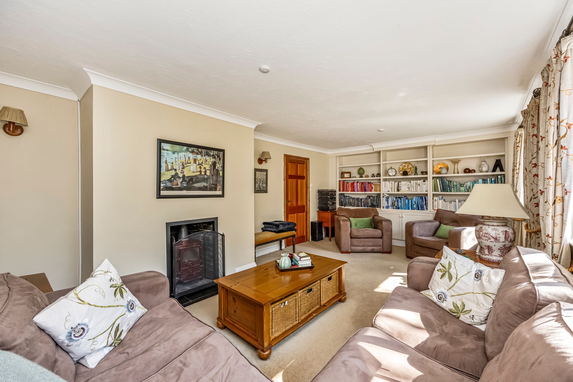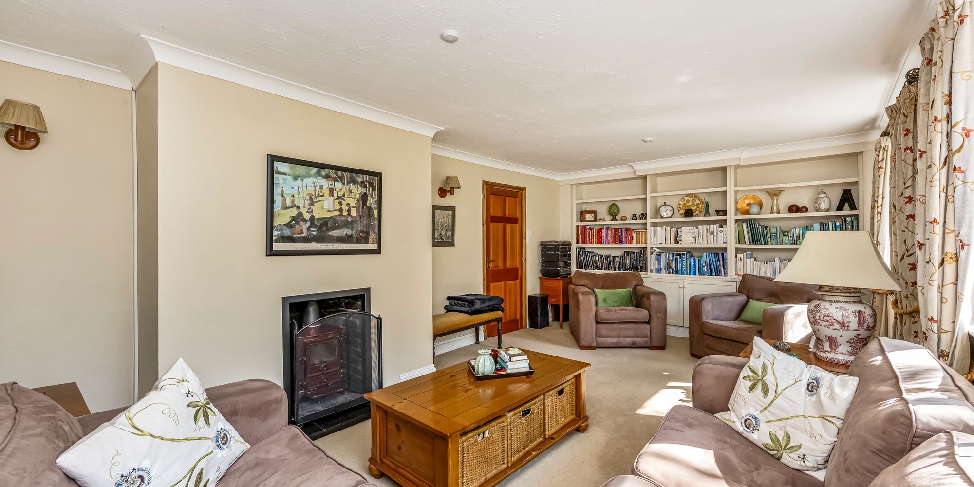 SITTING ROOM: Open fireplace incorporating an integrated wood burner with brick surround and granite hearth, extensive fitted wall unit with shelving and storage, two large windows to front.