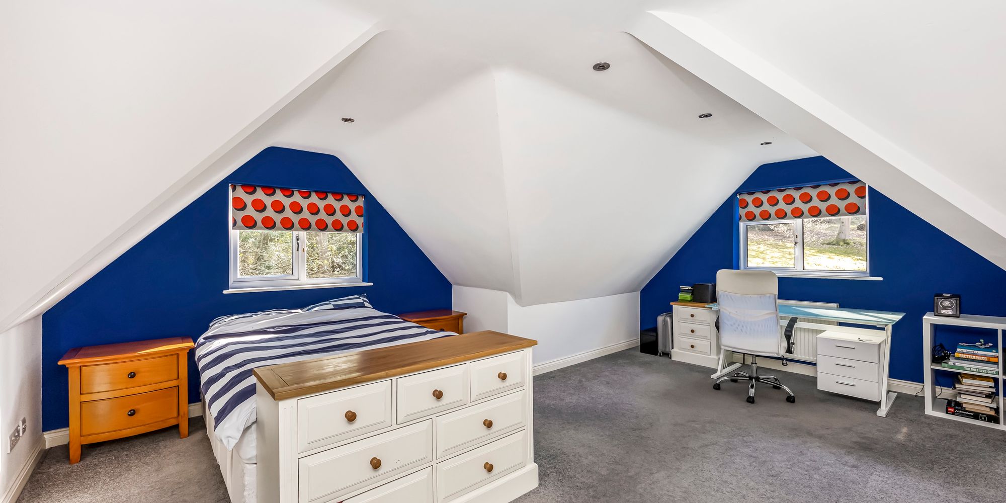 BEDROOM: Built-in wardrobes, eaves storage, dormer window to front, window to side and door into: EN SUITE WET ROOM: Tiled enclosure with Aqualisa thermostatic shower, dual flush floating wc, vanity wash basin with storage under, shaver point, tiled flooring, heated towel rail, tiled flooring and window to rear.