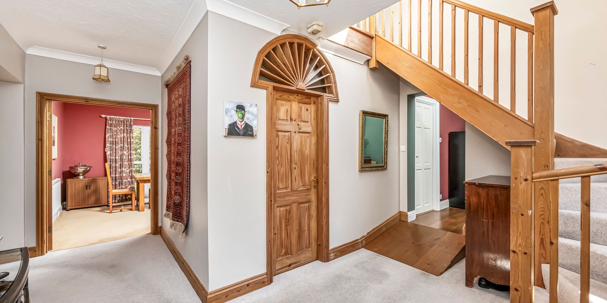 COVERED ENTRANCE PORCH: Outside lighting and glass panelled composite front door opening into: ENTRANCE HALL: Coir entrance matting, stairs to first floor, two windows to front.