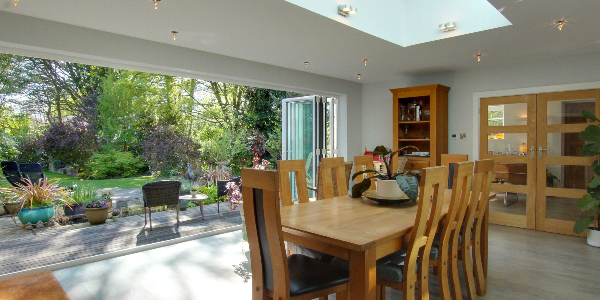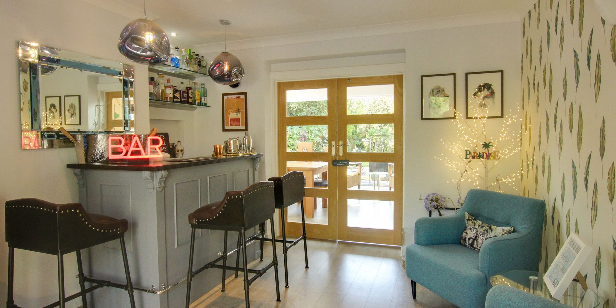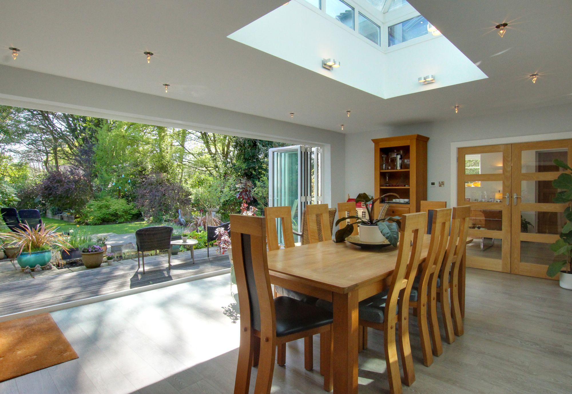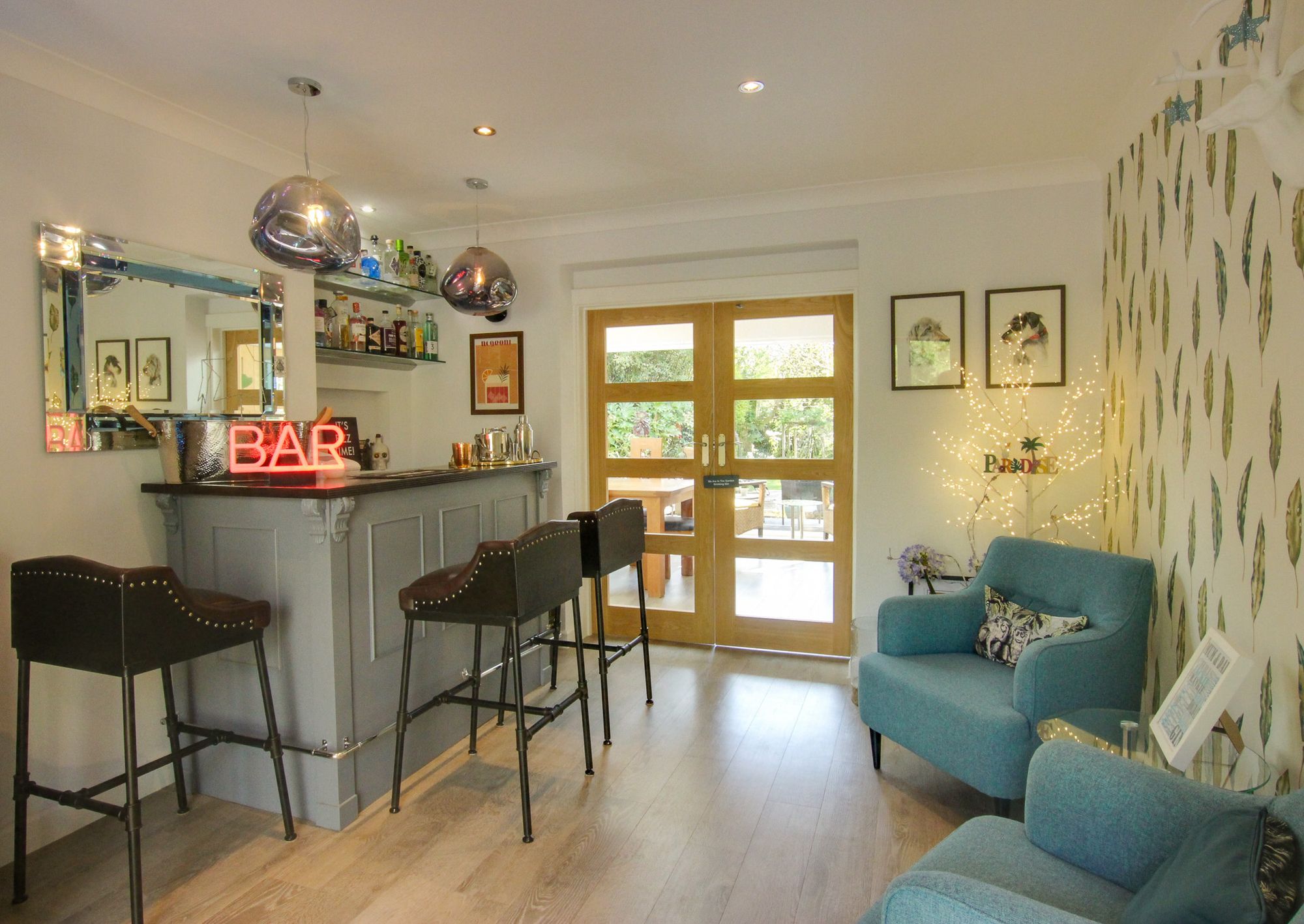 In addition to the hall, there is a GRAND SITTING ROOM with fireplace, a DINING ROOM with bi-fold doors leading out onto the rear terrace, a HOME OFFICE, a PLAYROOM (currently used as a bar), whilst the GARAGE is currently arranged as a HOME GYMNASIUM AREA. There is a beautiful KITCHEN fitted by Hamilton Stone Design equipped with appliances and Caesar Stone worktops, a separate UTILITY ROOM with back door and a CLOAKROOM.