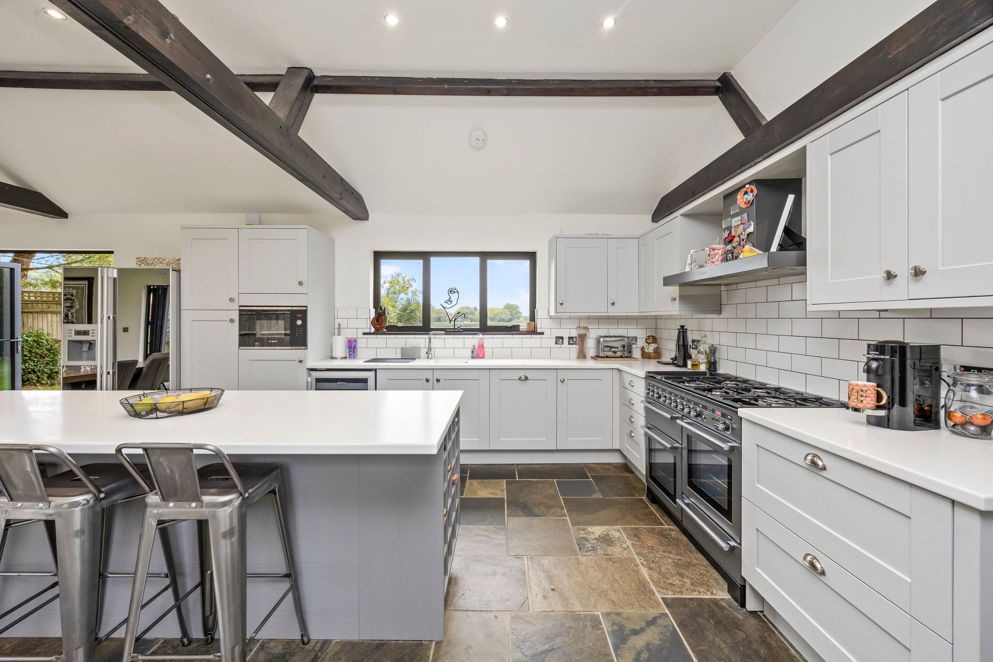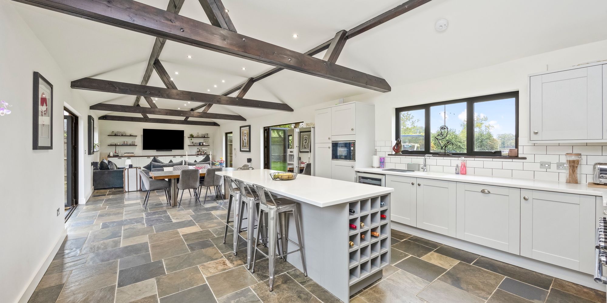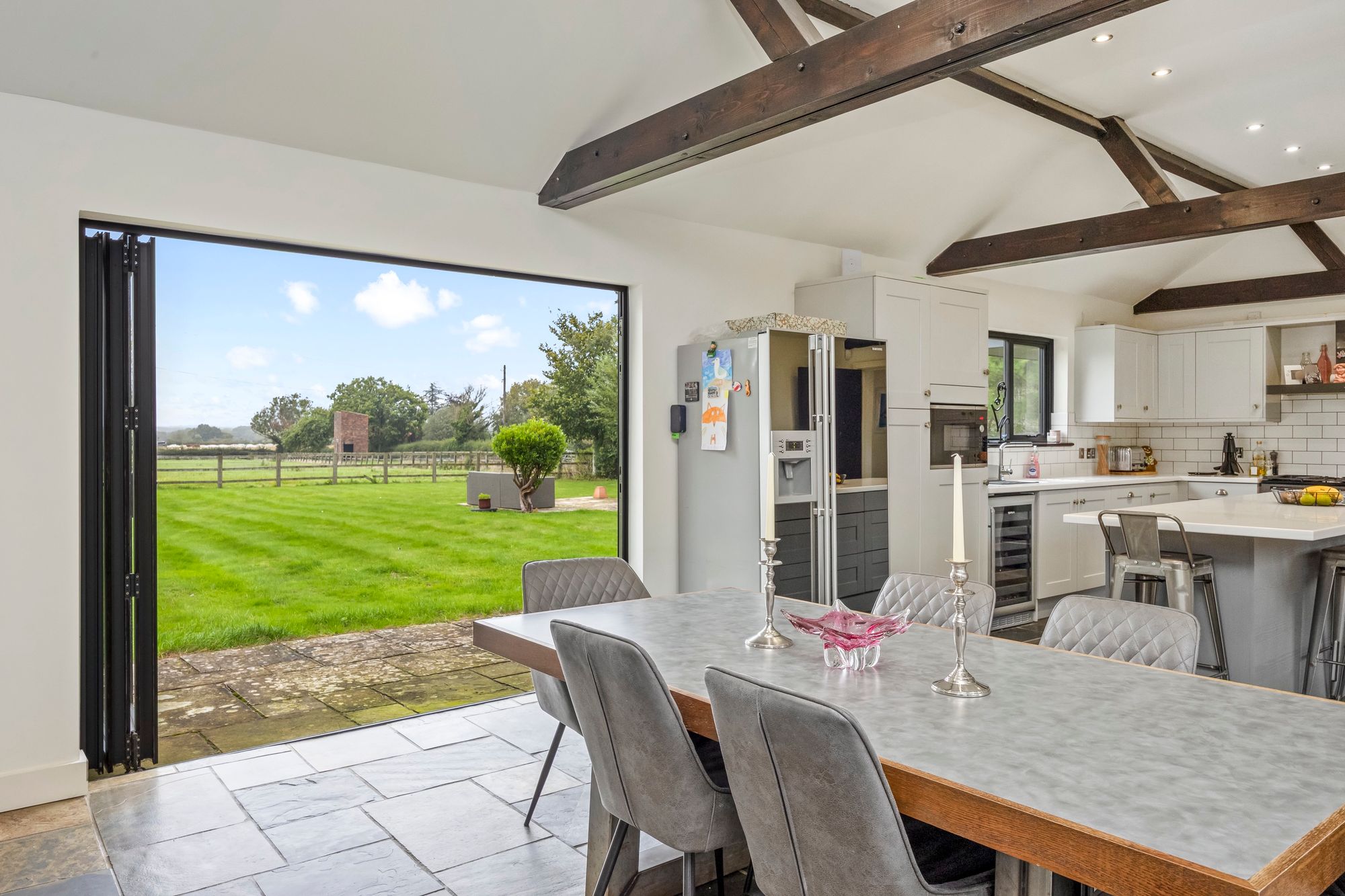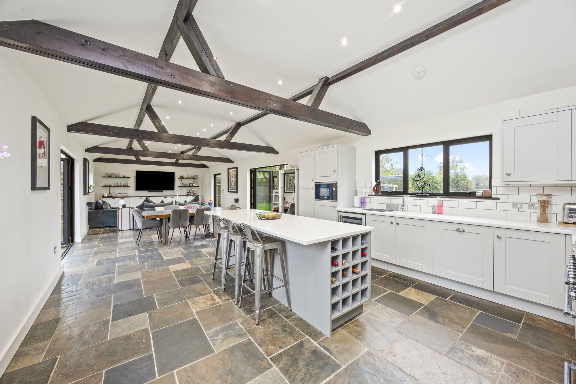 - Large Open Plan Kitchen Family Room With Vaulted Ceilings, Bi-fold Doors To The Front And Rear Gardens, High Specification Kitchen With Feature Island And Integrated Appliances