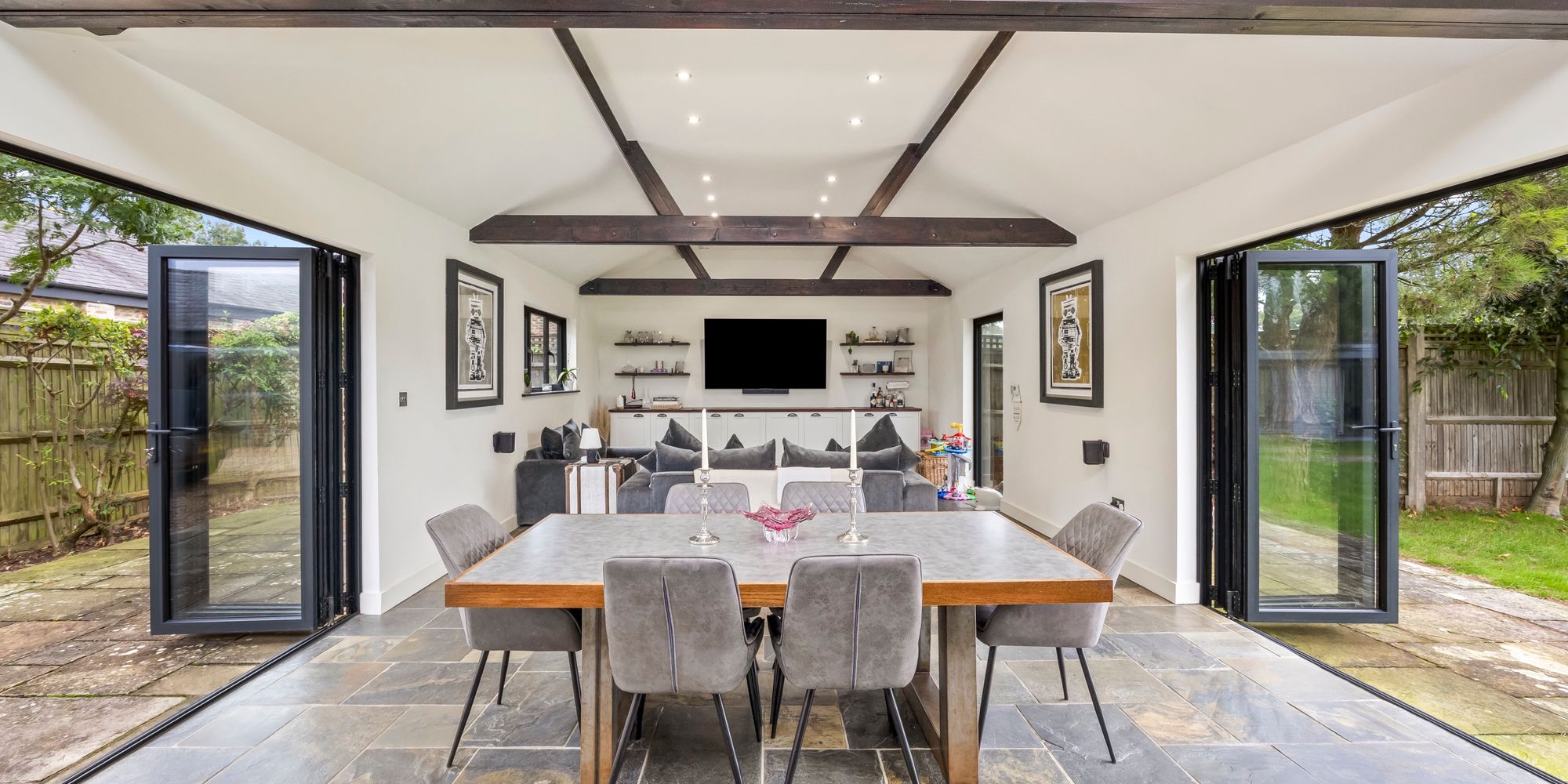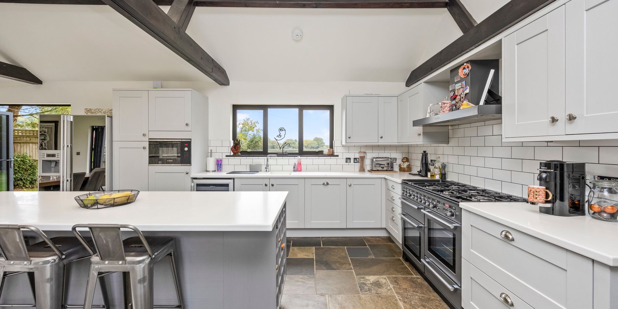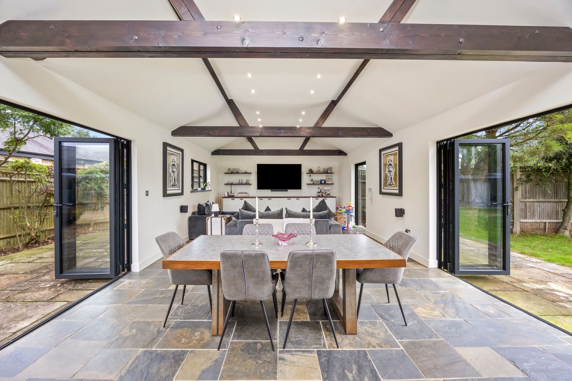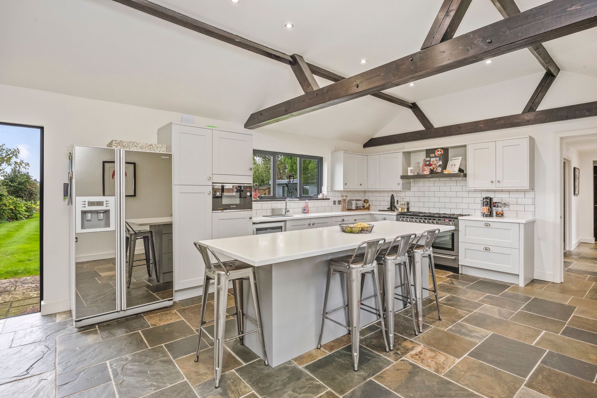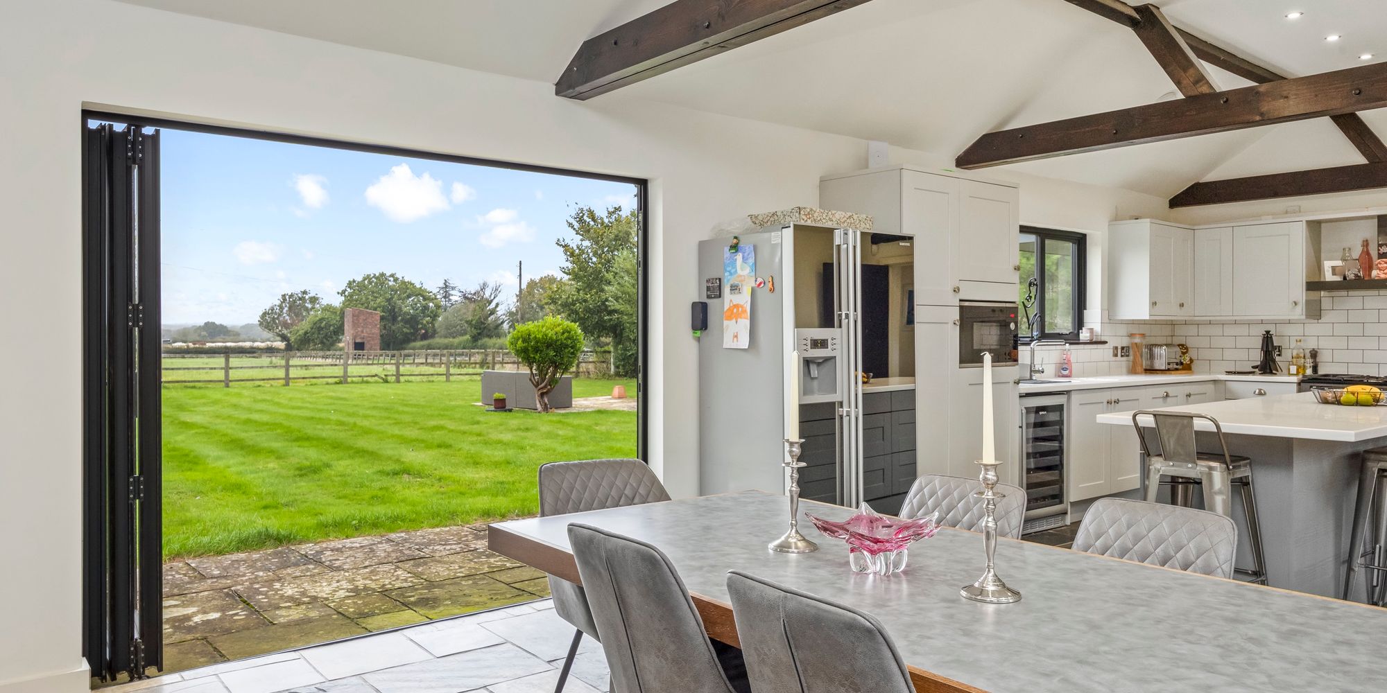 - Large Open Plan Kitchen Family Room With Vaulted Ceilings, Bi-fold Doors To The Front And Rear Gardens, High Specification Kitchen With Feature Island And Integrated Appliances