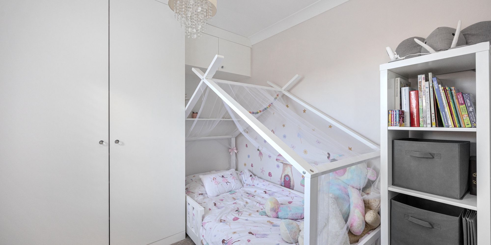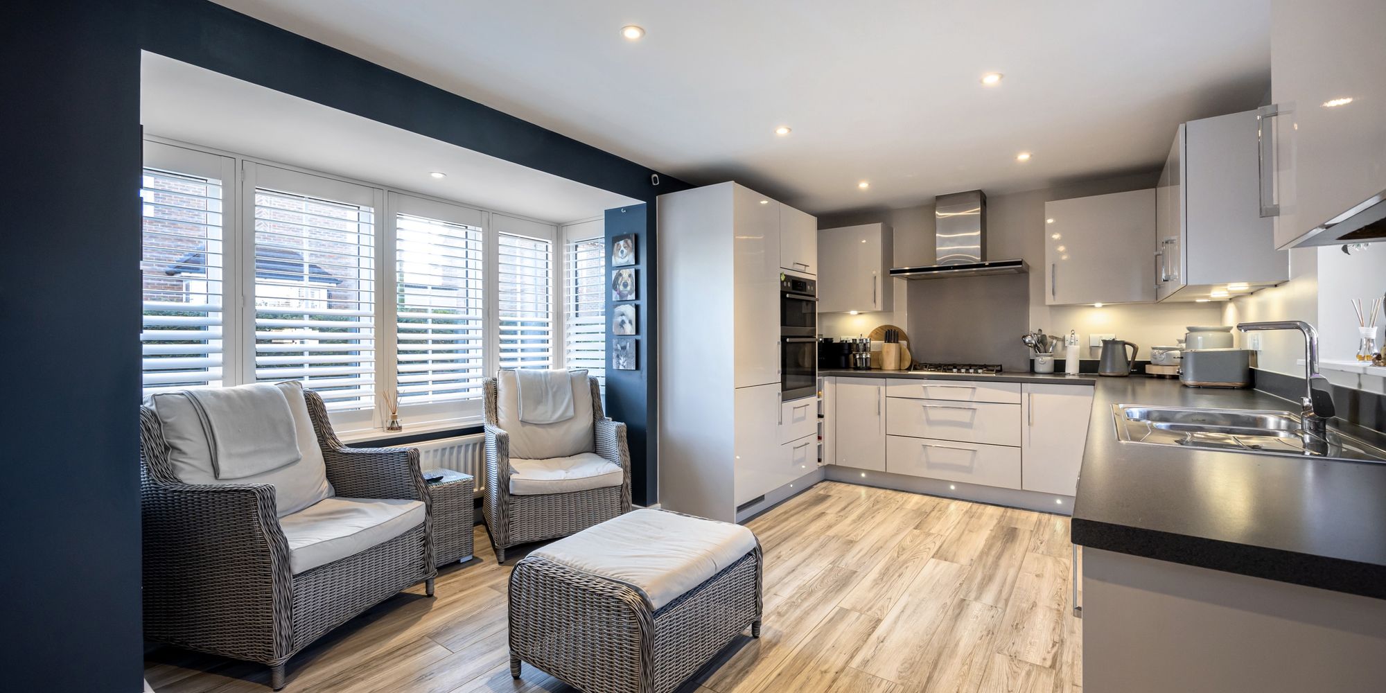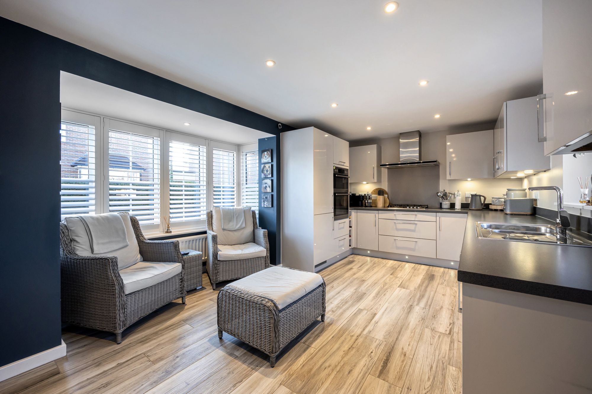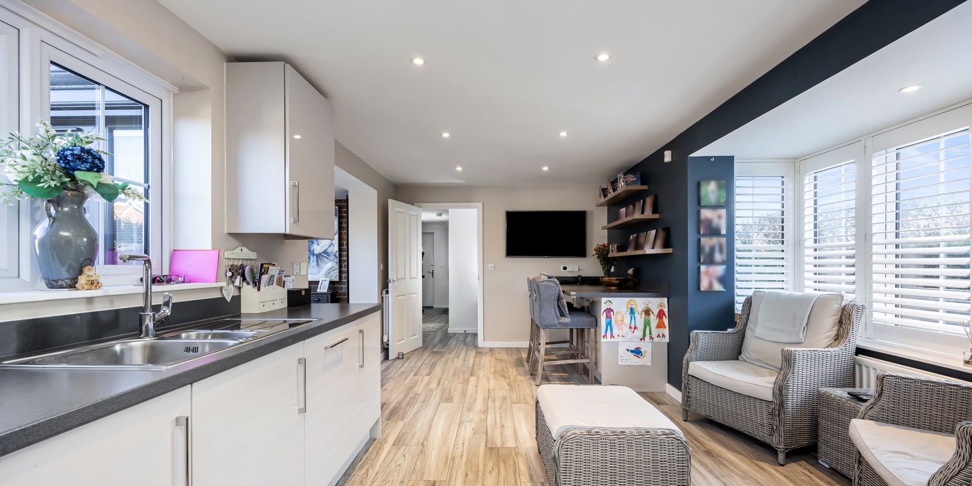 The ground floor provides exceptional space for both entertaining and family life. The large, light-filled living room, as well as the expansive kitchen/breakfast room, both feature double doors leading into the orangery, which then opens up to the rear garden. The orangery itself is a versatile space, with bi-fold and sliding doors that can be fully opened to the garden during warmer months, and integrated sun-blinds between the glazing to ensure comfort on hotter days. The kitchen/breakfast room features a striking south-facing bay window with contemporary white shutters, creating a bright and inviting space. There’s ample room for a dining or seating area in front of the window, and a breakfast bar adds further versatility. The kitchen is well-equipped with a gas hob, AEG double oven and grill, as well as integrated appliances including a dishwasher, washing machine, and fridge freezer. The ceramic-tiled floor is heated by underfloor heating, ensuring warmth and comfort.