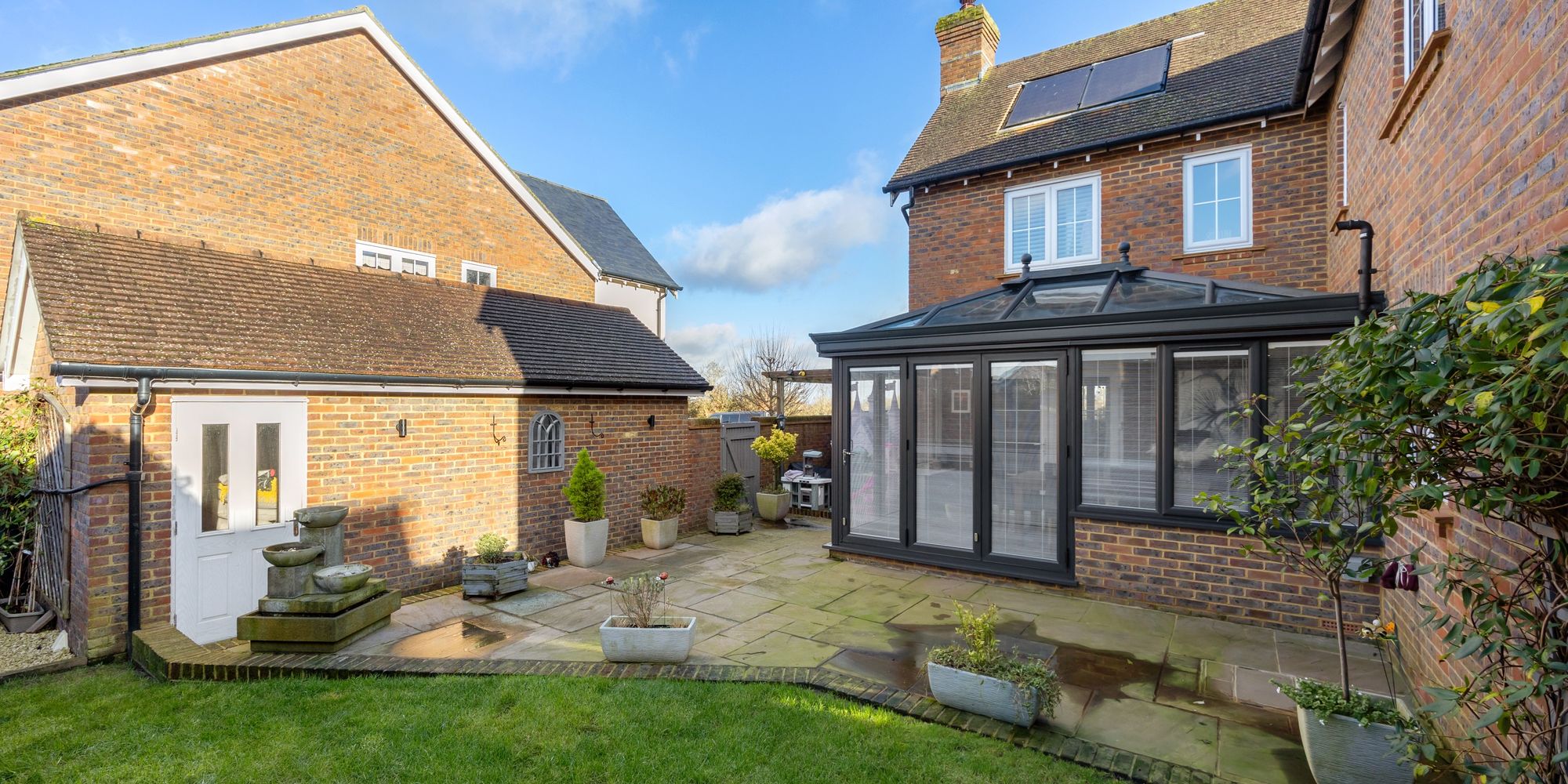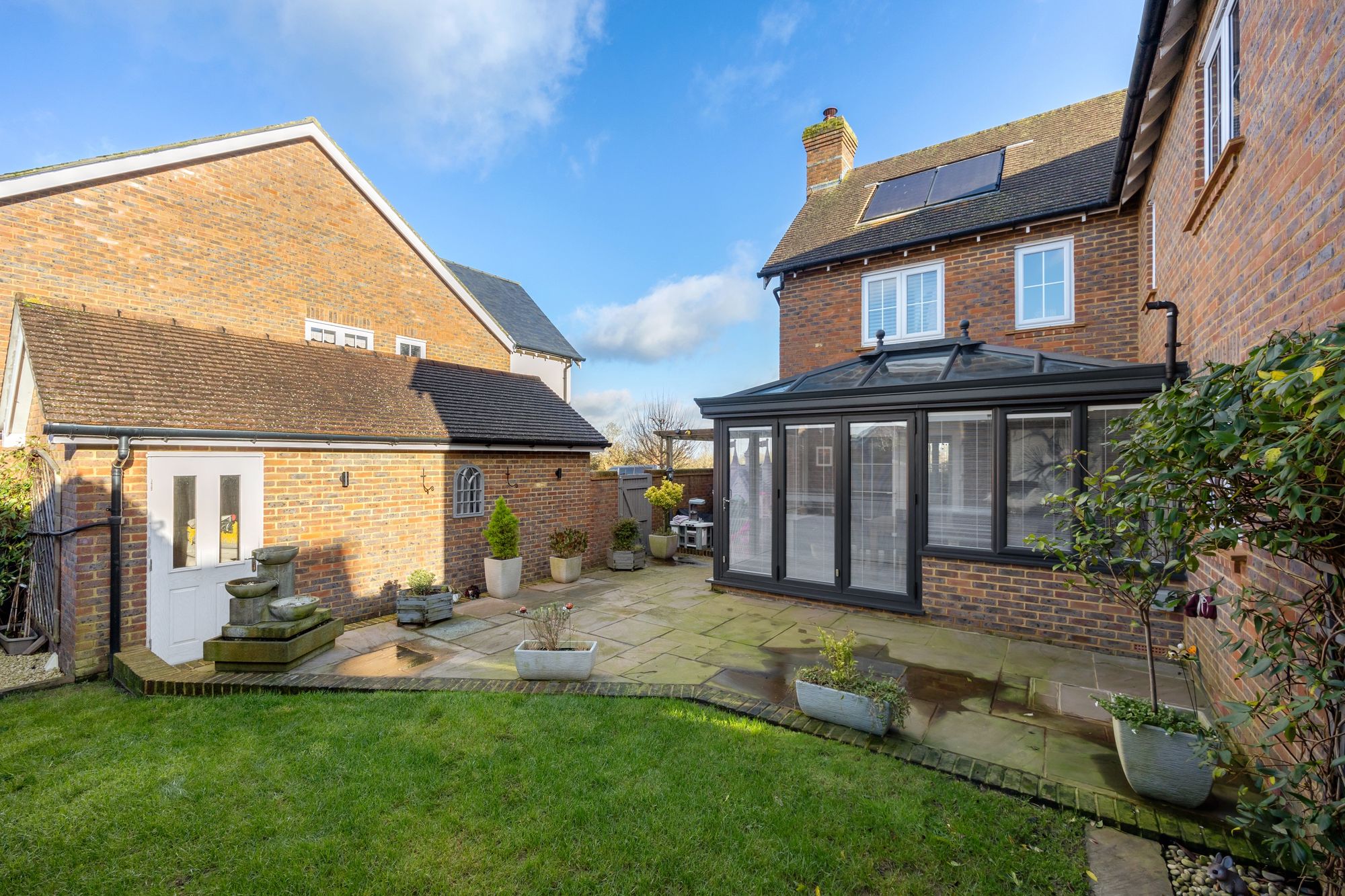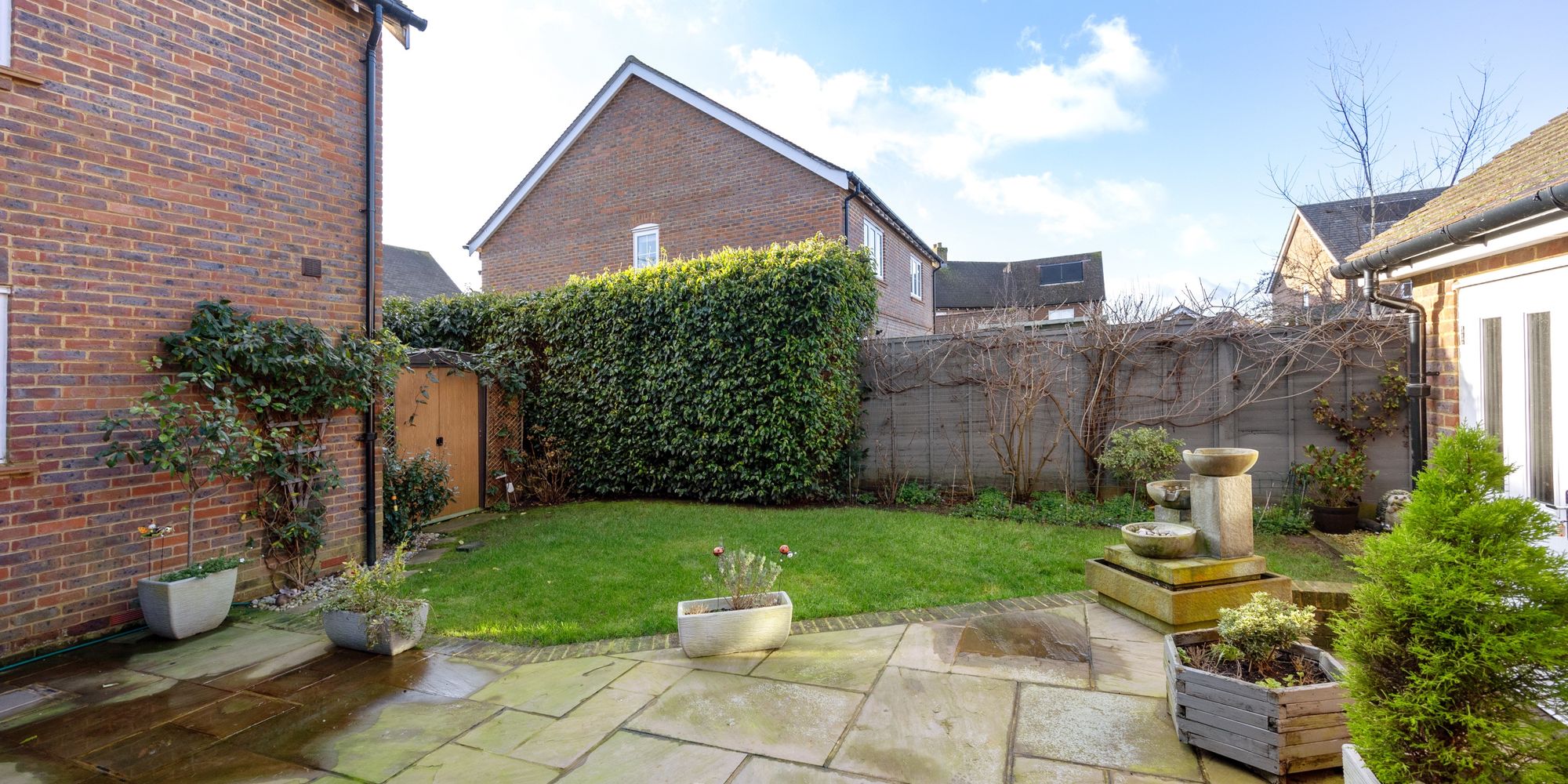 Outside, the garden enjoys a prized westerly aspect, perfect for catching the afternoon sun. There’s a generous lawn and a flagstone patio ideal for al fresco dining. A secluded space tucked behind the garage offers the perfect spot for a hot tub or barbecue, and the shed is cleverly concealed from view. The garden is easily accessible via the front driveway.