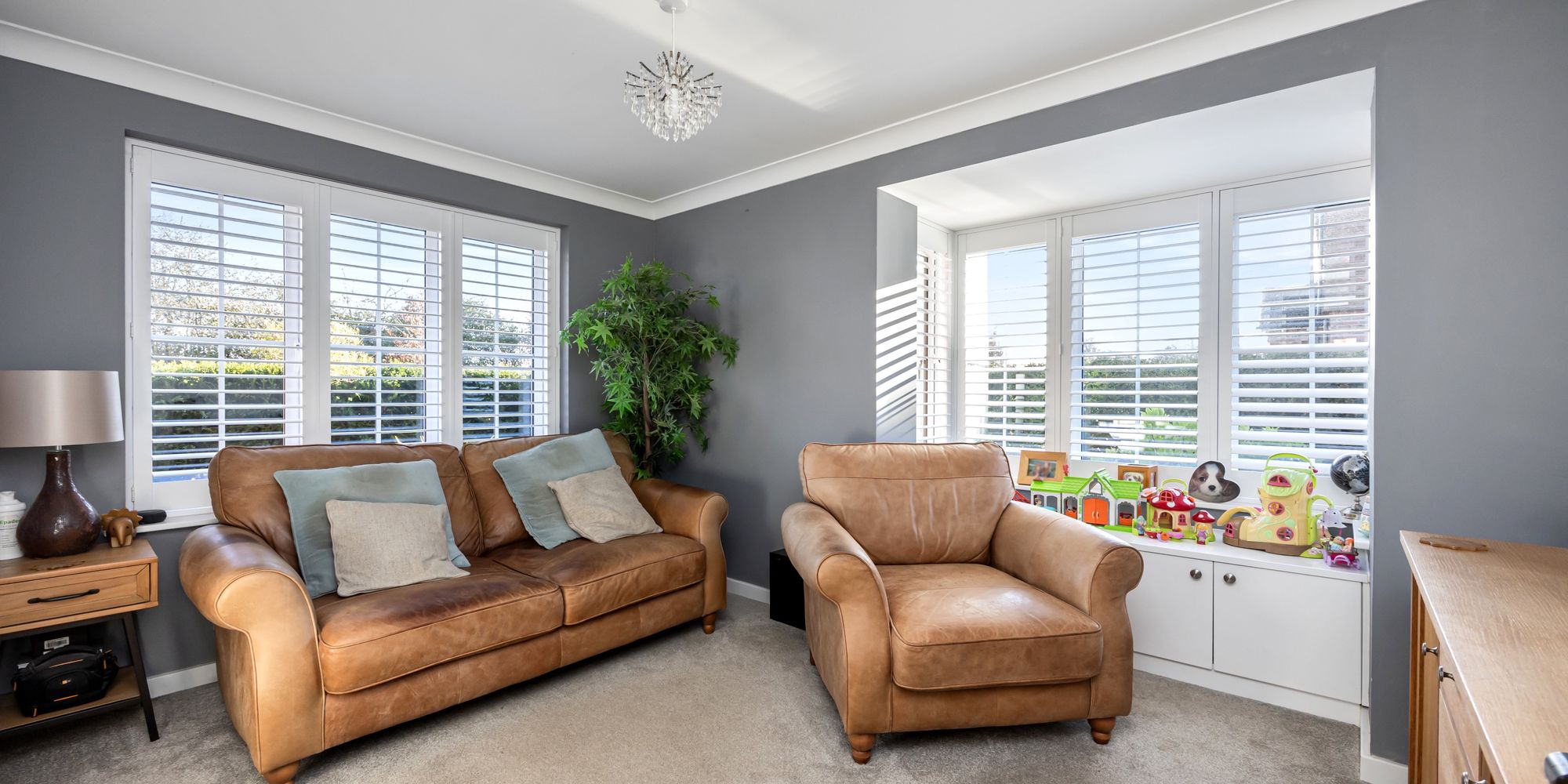 Storage is abundant throughout the property, with built-in wardrobes in every bedroom, multiple understairs cupboards, a large loft, and the garage. Notably, the house is entirely step-free at the front entrance, and its wide doorways provide added accessibility, making it suitable for wheelchair users.