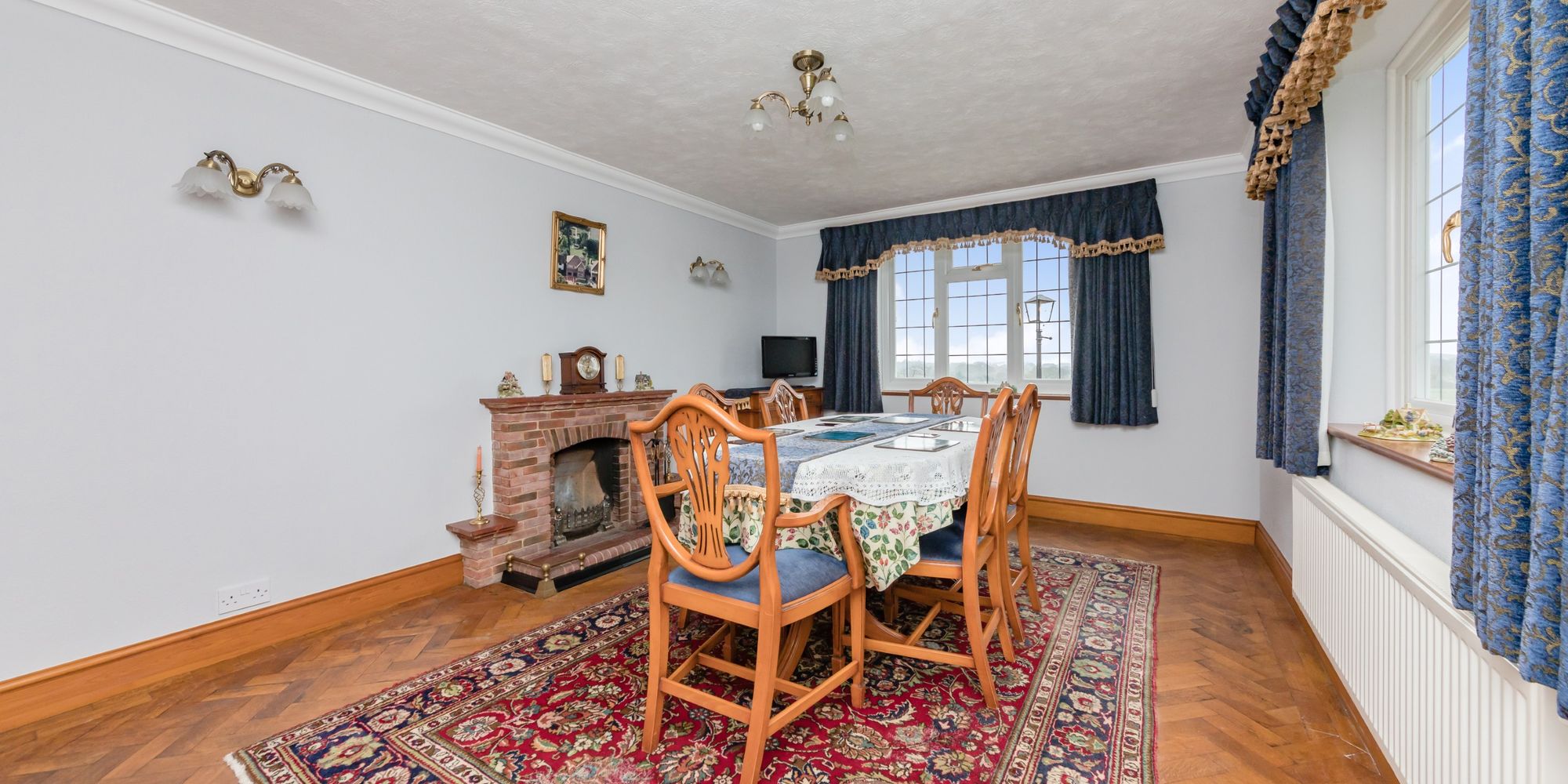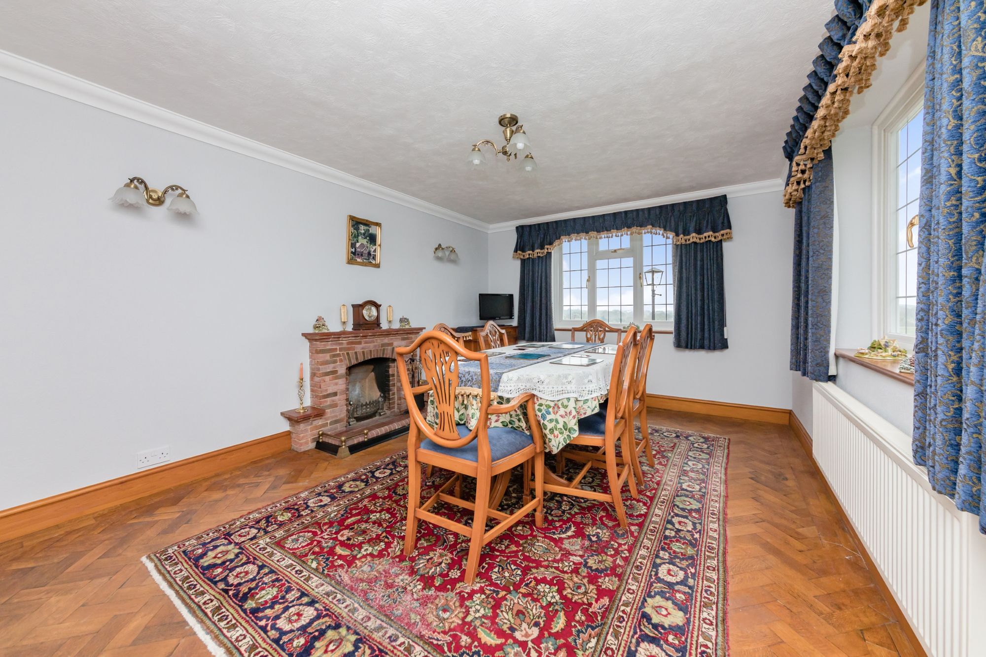 Dining Room- A dual aspect Dining Room with magnificent far-reaching views over the local countryside. The room features parquet wood floors and an open fireplace.