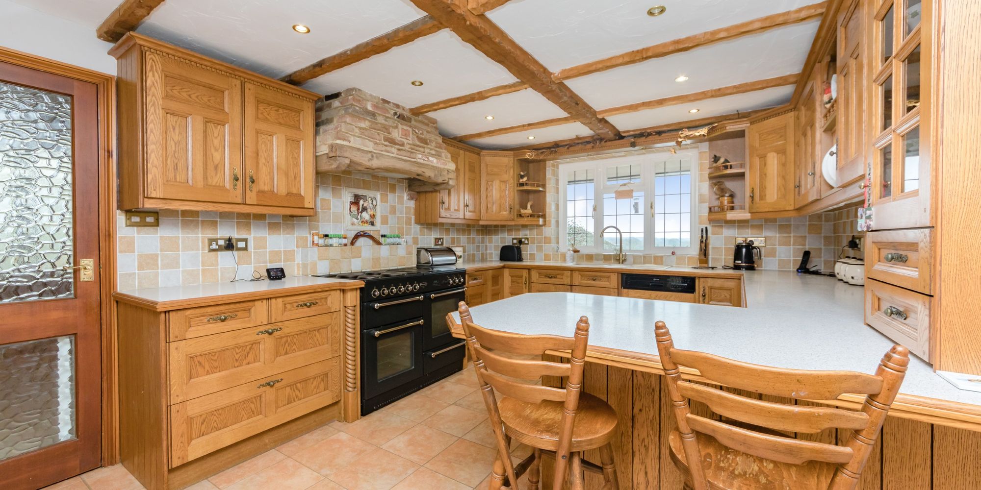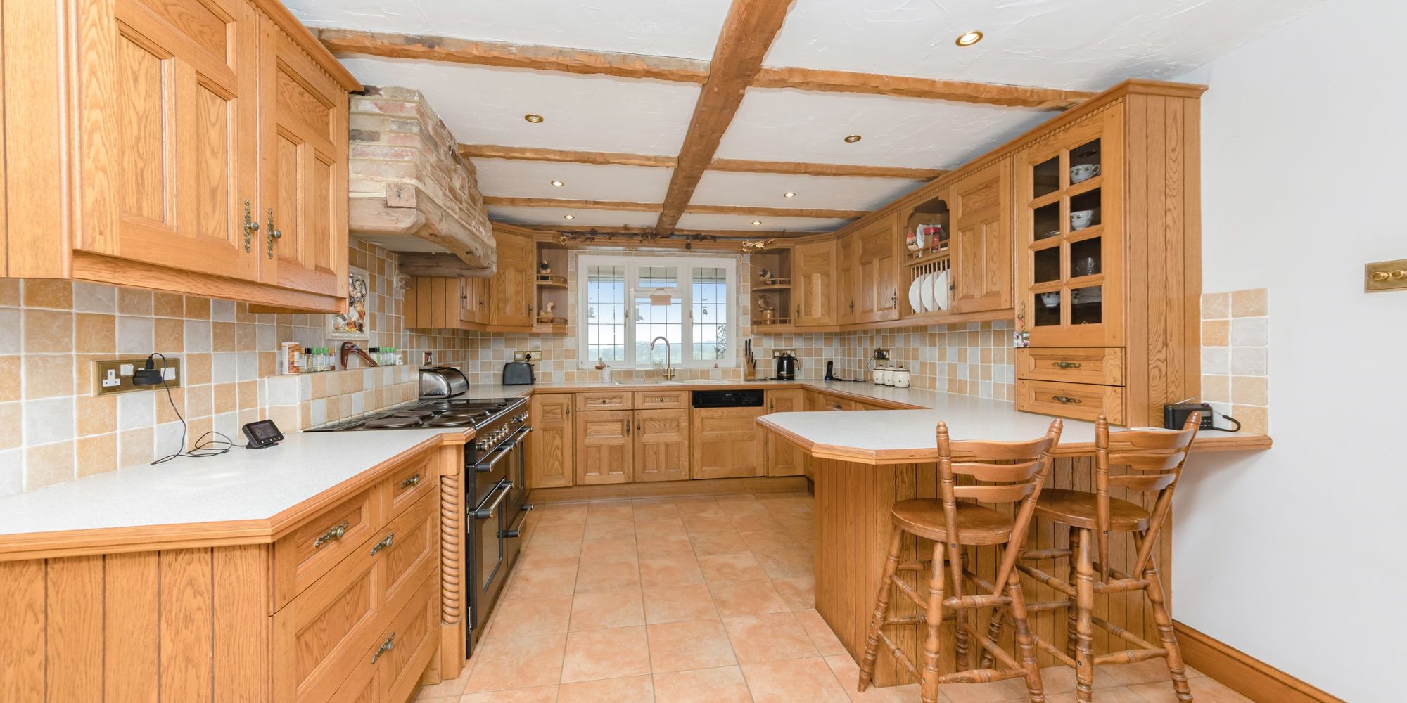 Kitchen- Finished in an oak design and comprising of a comprehensive range of cupboards and drawers. The kitchen features exposed beams and incorporates a breakfast bar, and pantry into the design.