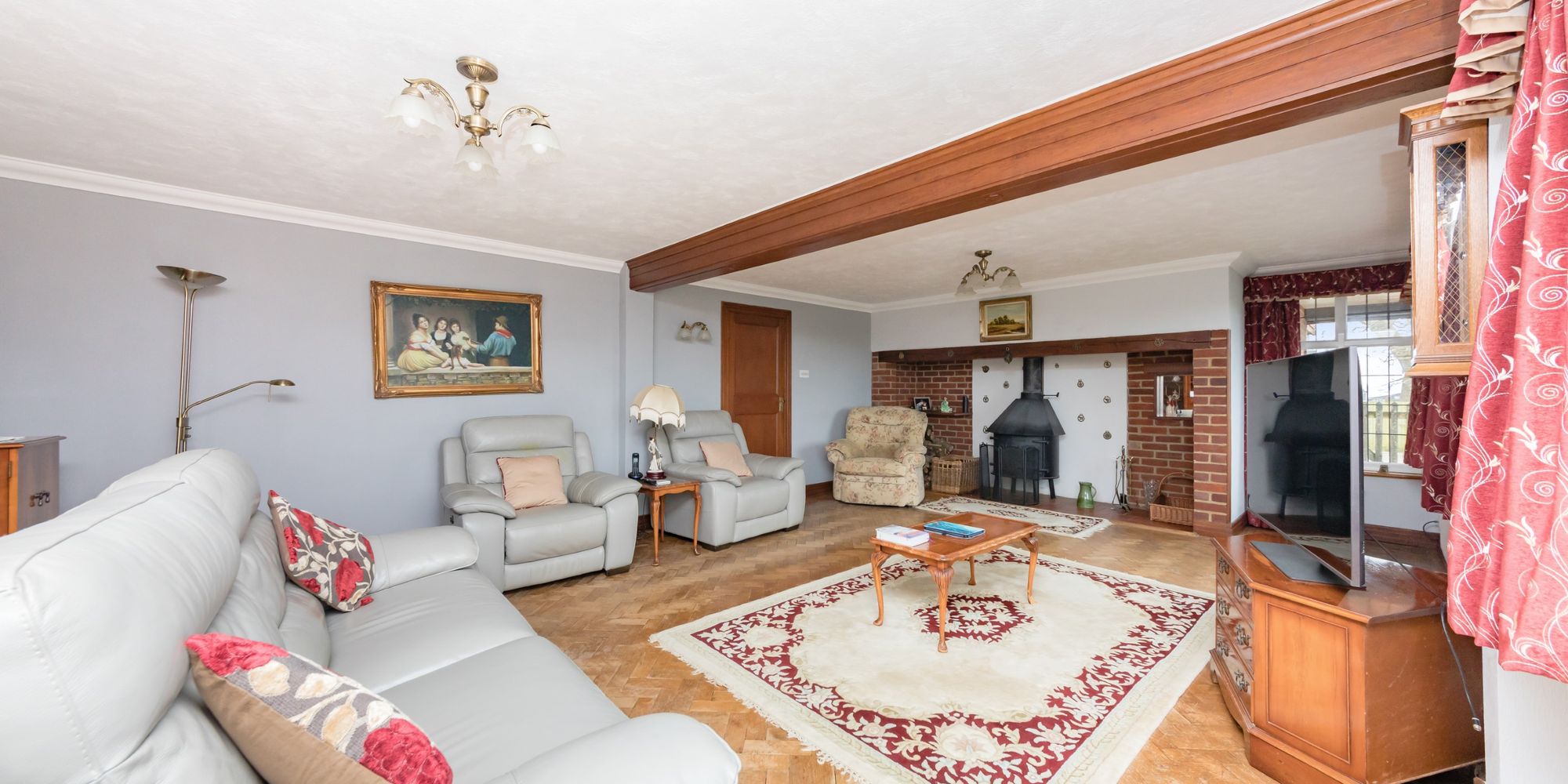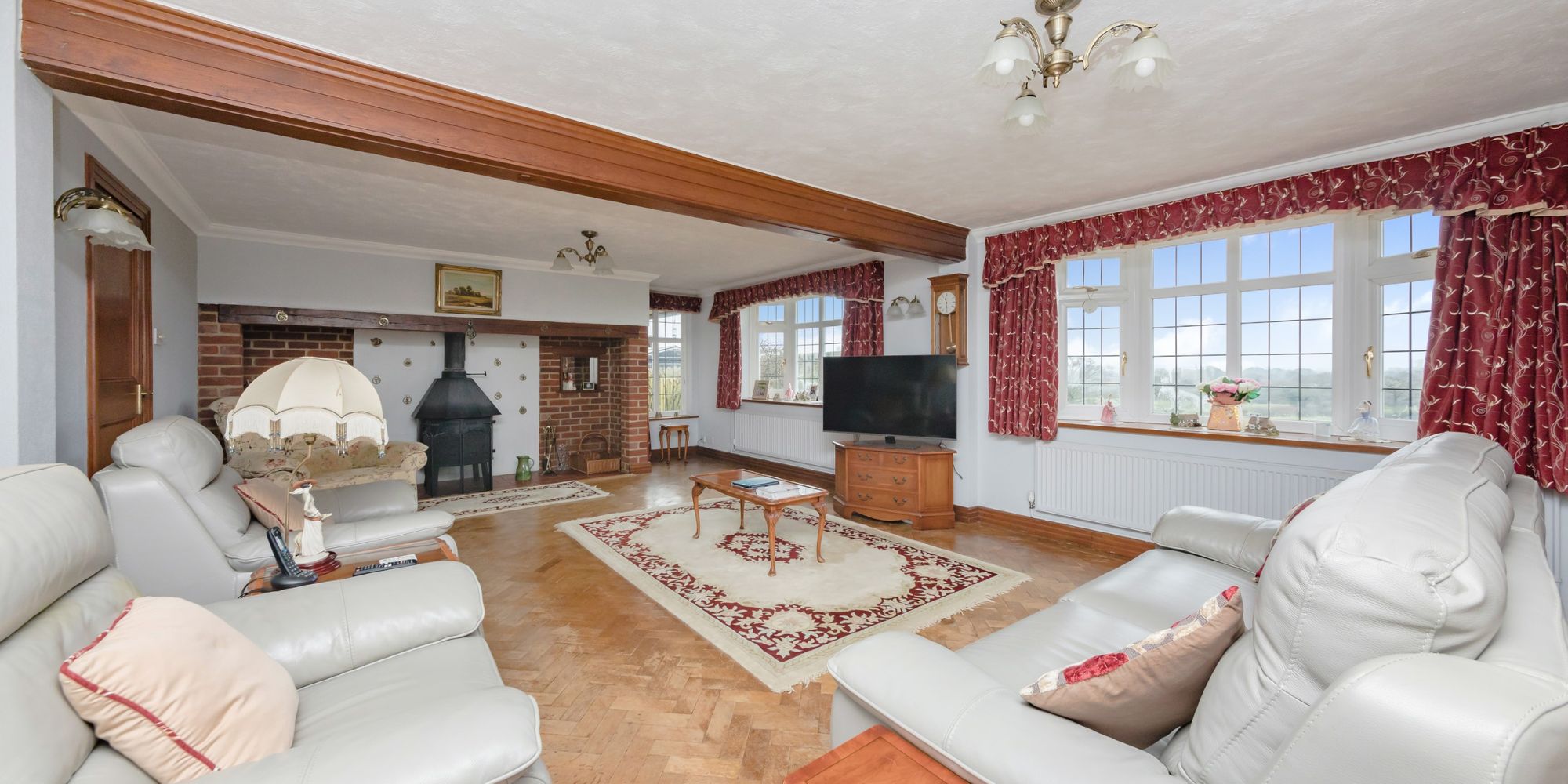 Sitting Room- Measuring an enviable 25ft and boasting glorious views over the adjoining countryside. The dual aspect reception room benefits from parquet wood floors and an impressive inglenook fireplace complete with wood burning stove.