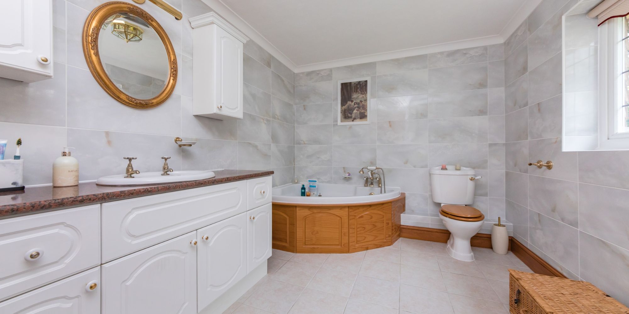 EnSuite- A generously sized bathroom with suite comprising of a corner position bath, separate shower enclosure, wc and wash hand basin set into a vanity unit. Tiled walls and window to the rear.