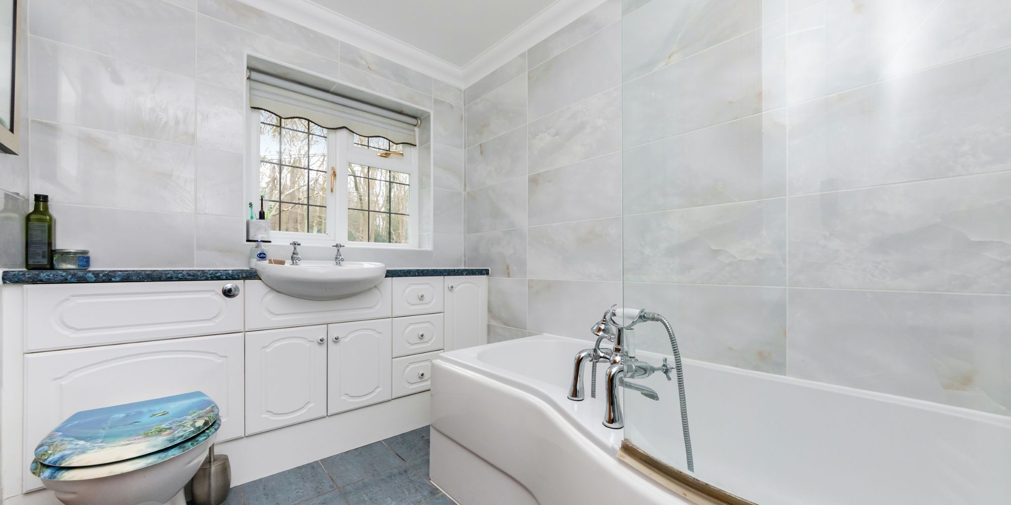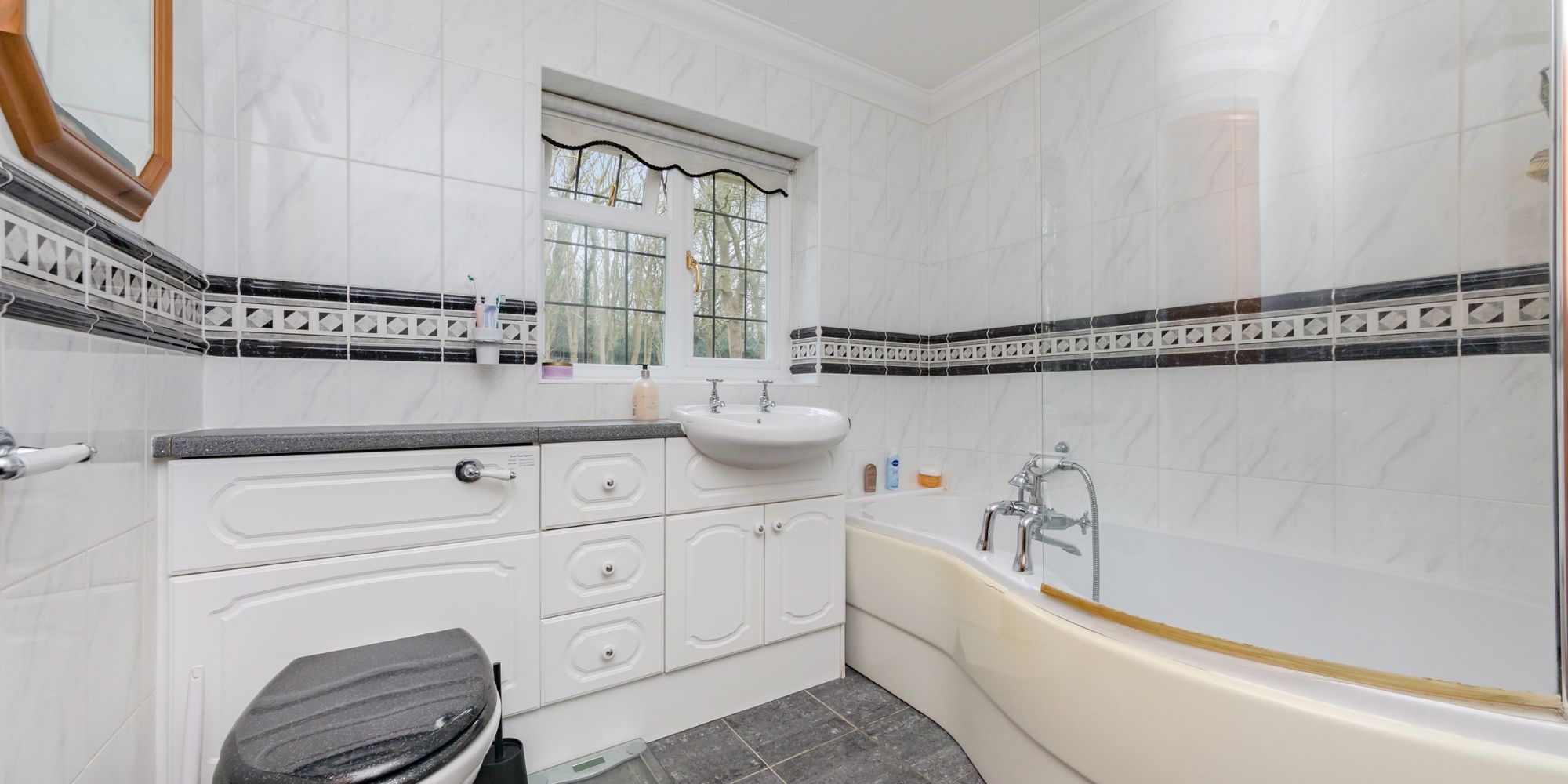 Bathroom- A further family bathroom with modern suite comprising of a tearshaped bath with shower over and glass screen door. Wc and wash hand basin set into a vanity unit. Tiled surrounds and window to the rear.