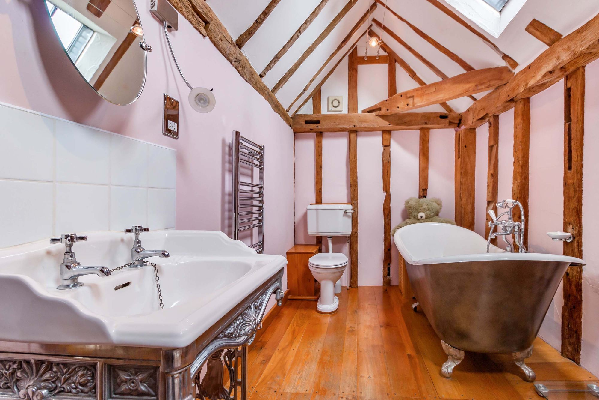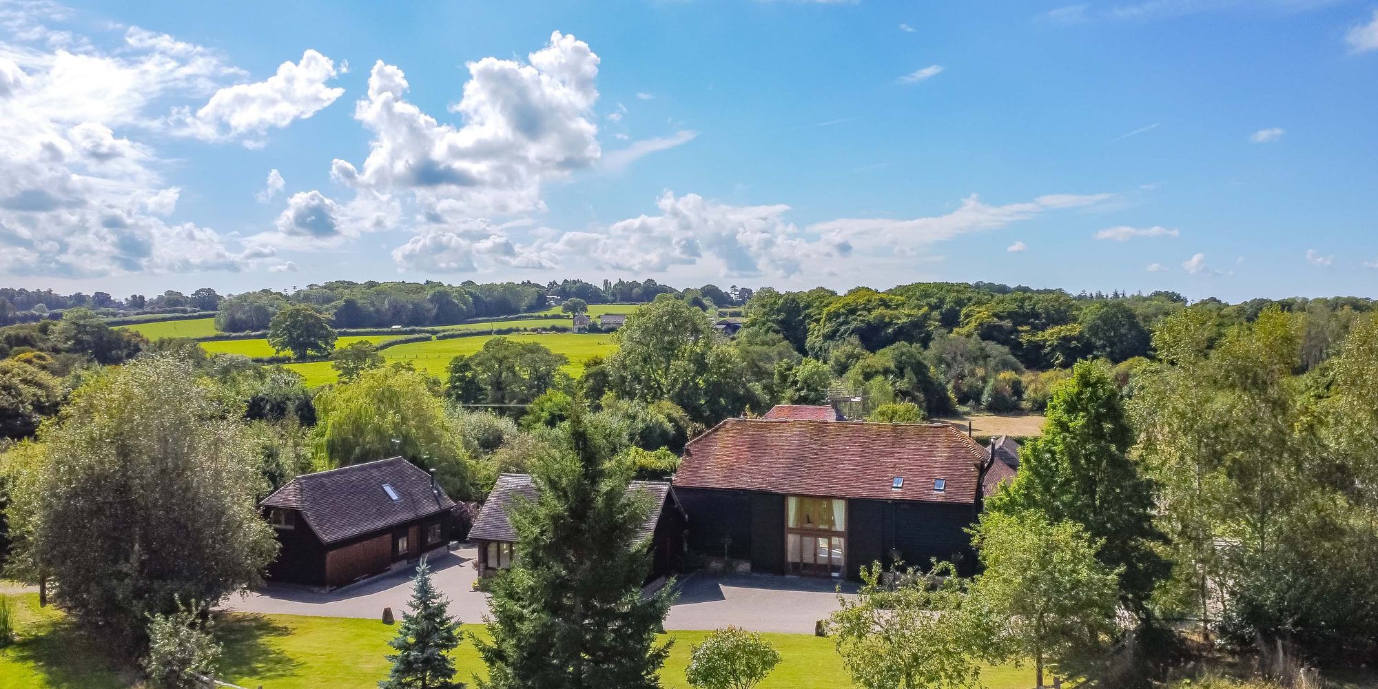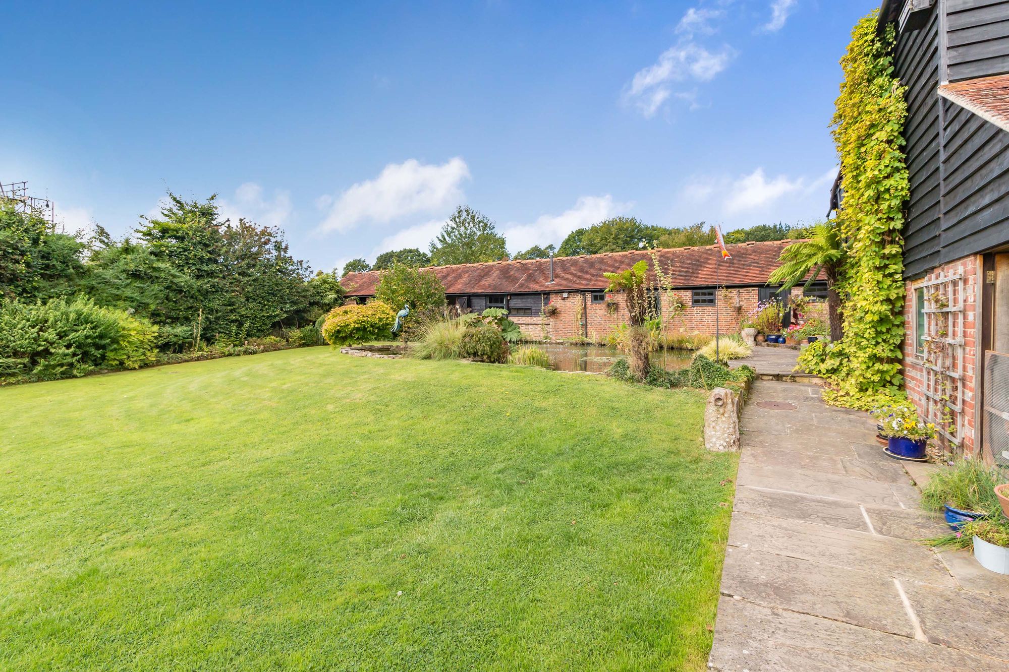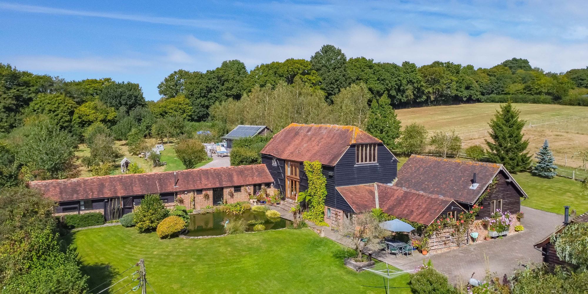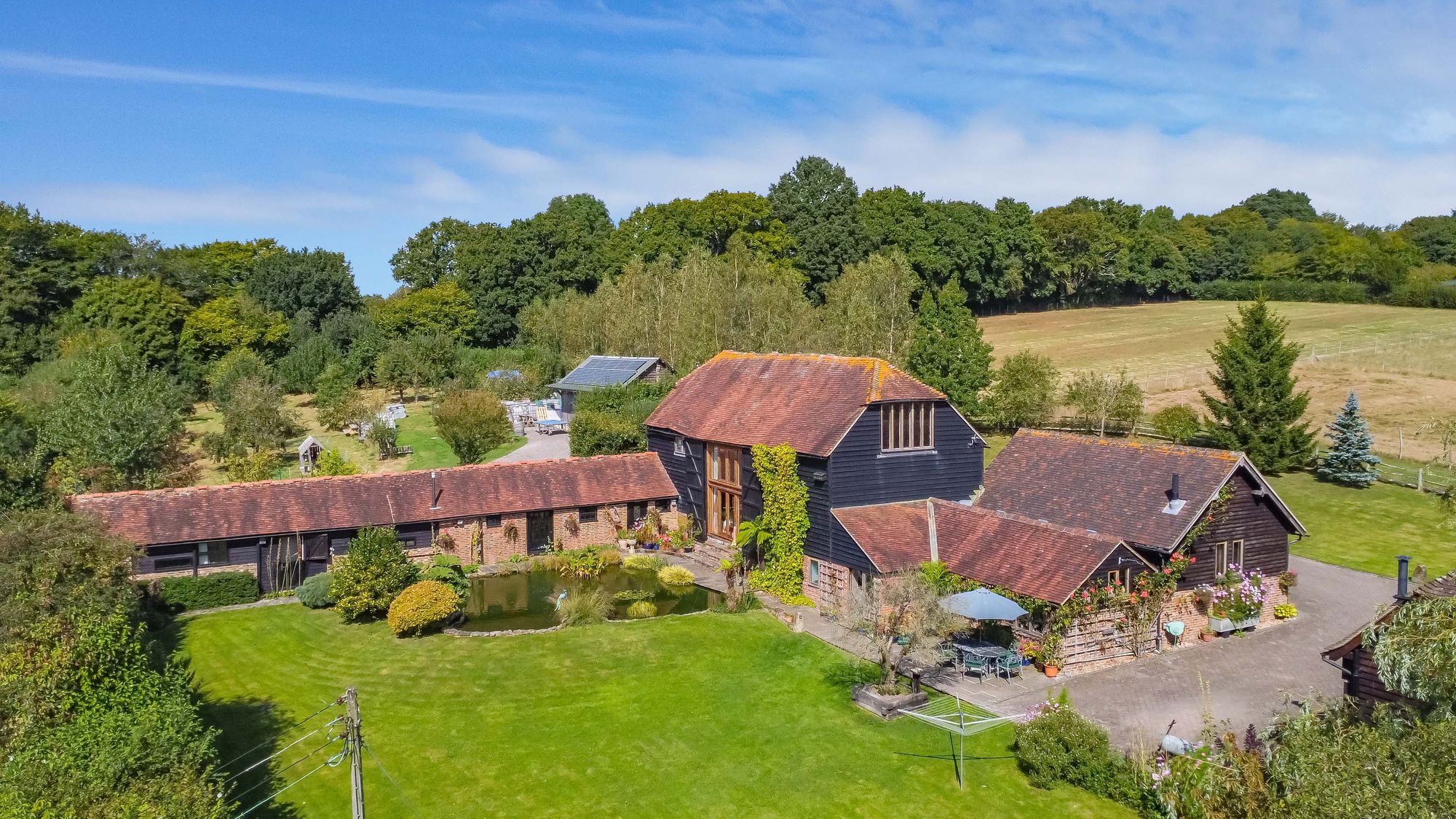 A magnificent 4/5 bedroom 4 bathroom detached Sussex barn occupying 8.5 acres of stunning grounds with a number of ponds, outbuildings and a beautiful detached oak framed timber barn/garage. Situated in a peaceful semi-rural position off a long driveway surrounded by open countryside.