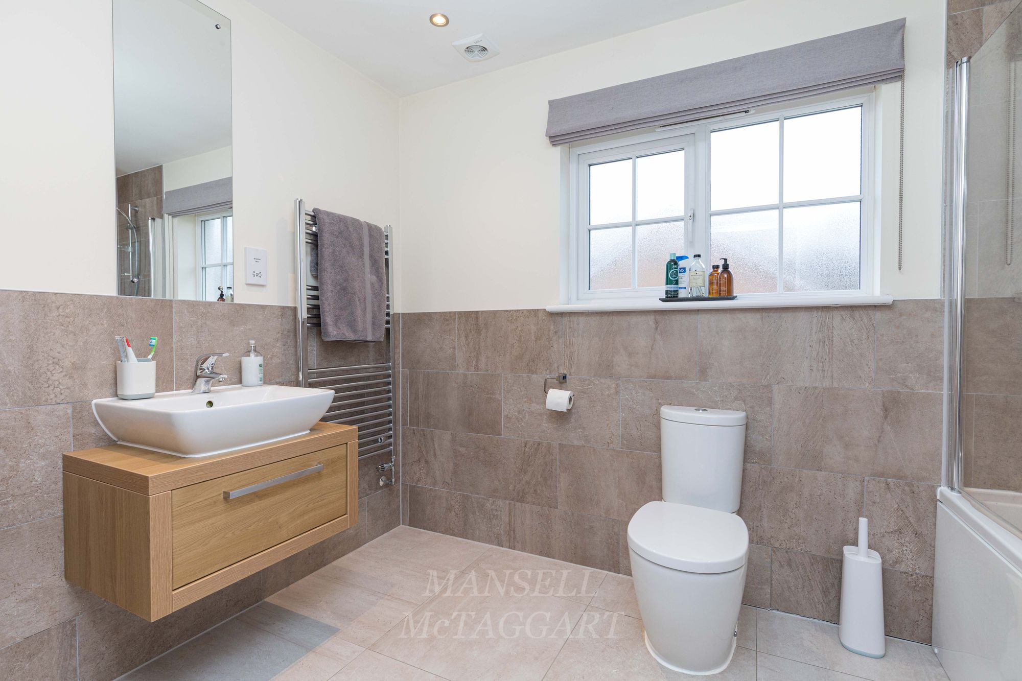 A bright and spacious “U” shaped landing provides access to all bedrooms, bathroom and airing cupboard with east facing window looking out the front. There is also loft access with integrated wood loft ladder. The well proportioned main bedroom overlooks the front of the property with both the main bedroom and second bedrooms both able to comfortably fit a king size bed. The main bedroom offers a walk-in wardrobe and a generous size en-suite shower room with tiled floors and walls, dual sinks, low-level W.C and walk-in shower with glass shower screen. The second bedroom benefits from a double fitted wardrobe and en-suite shower room, two further double bedrooms, also boasting fitted wardrobes. Completing the upstairs accommodation is a family bathroom finished with part tiled walls, low-level W.C, wash hand basin and bath with glass shower screen, mixer taps and fitted shower.