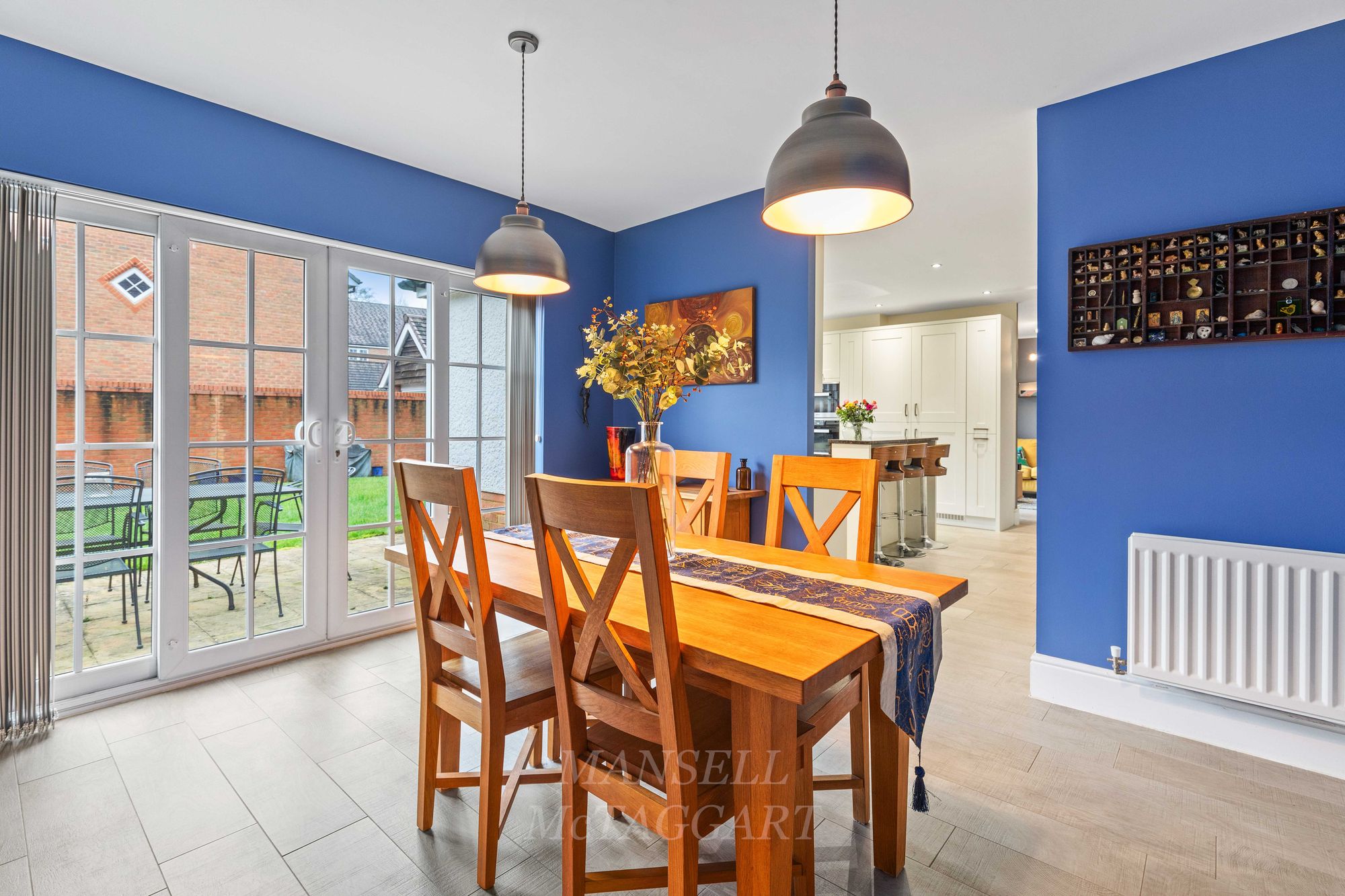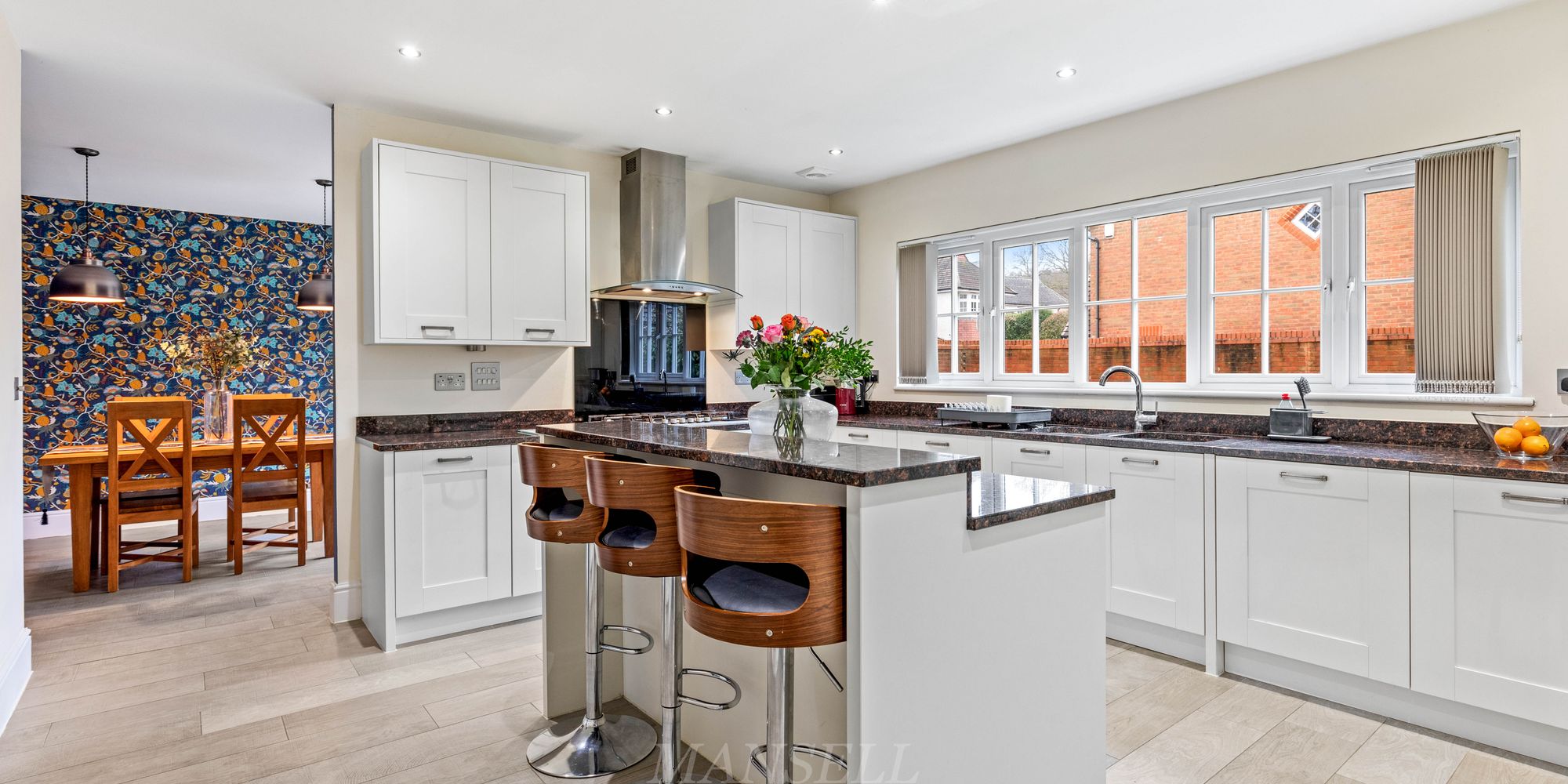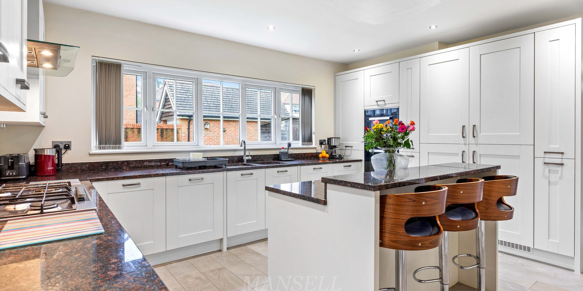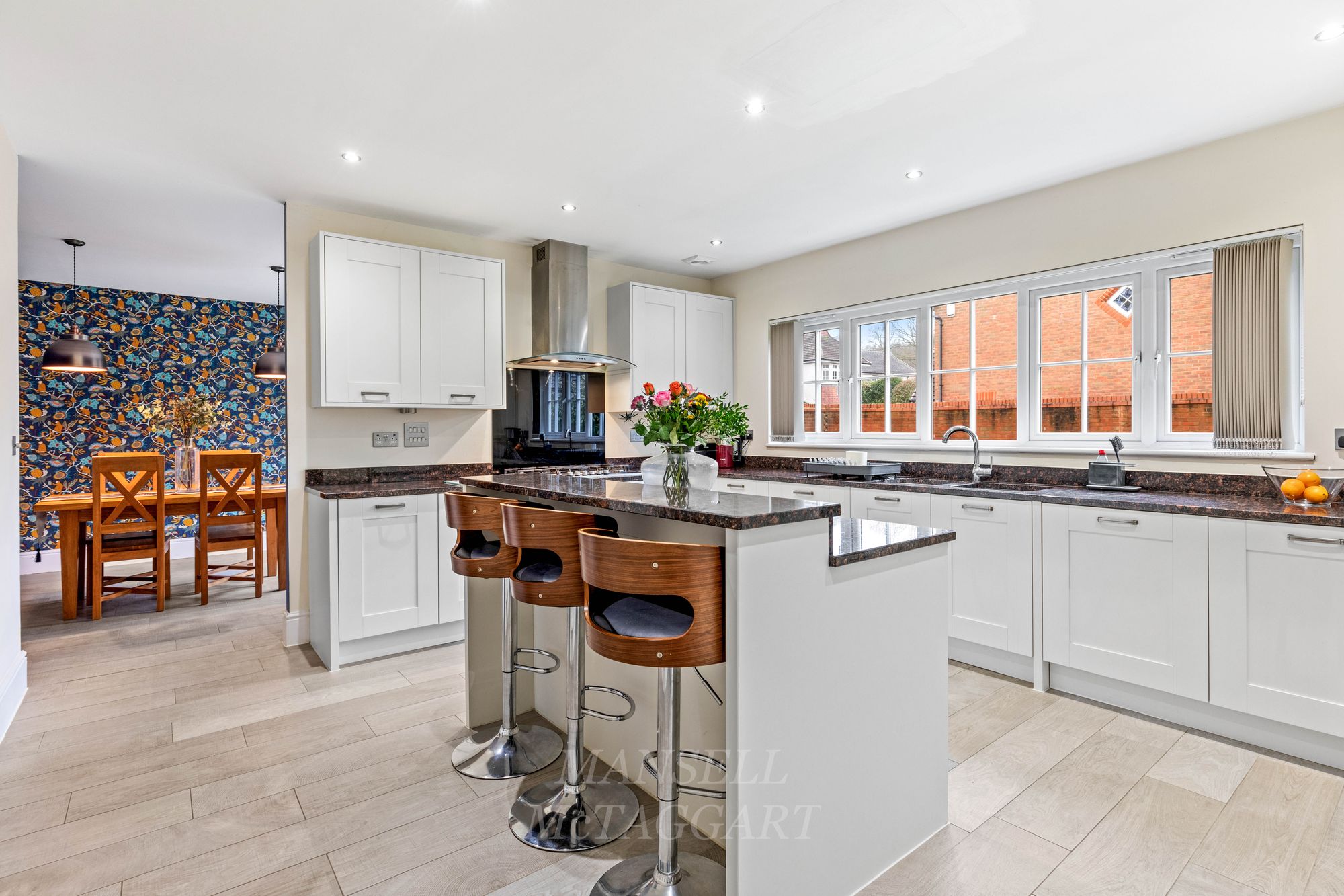 As you enter the property, the bright and airy hallway welcomes you with multiple storage cupboards for shoes and coats, leading to the inviting double aspect living room which features an electric fireplace and bay window flooding the room with natural light. Leading to the rear of the property, the open plan kitchen area is a true highlight, boasting a range of wall and base units, granite work surfaces, and upgraded Miele appliances including 3 tier dishwasher, two eye-level ovens including a compact steam oven, AEG full height fridge and separate freezer, 6-ring gas hob and extractor hood over. Central to the room is an island breakfast bar offering additional storage below and counter tops above.