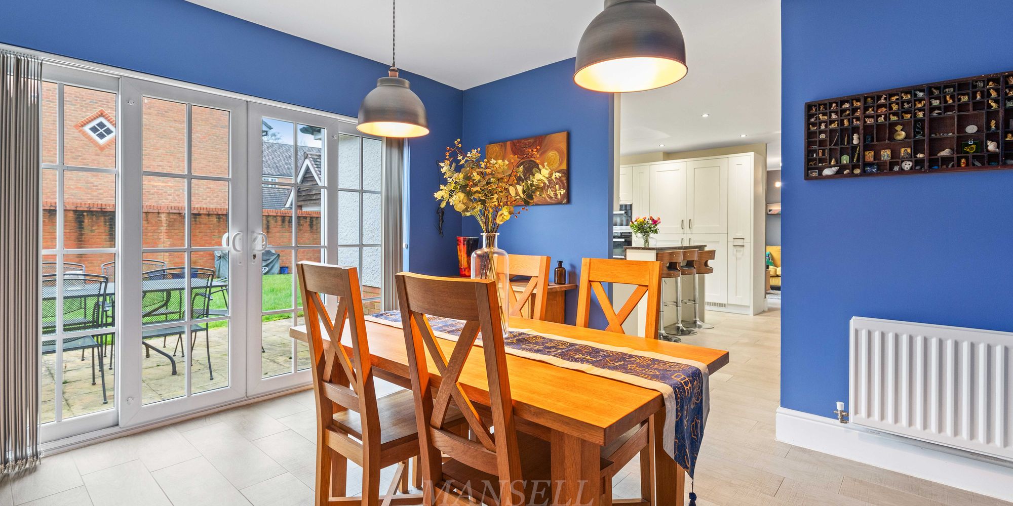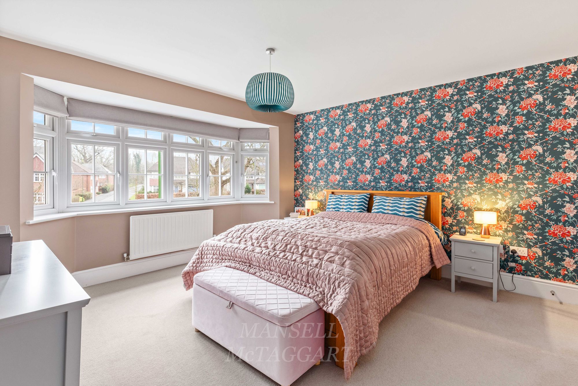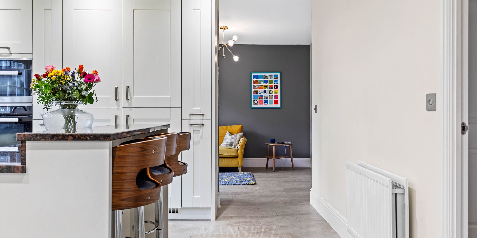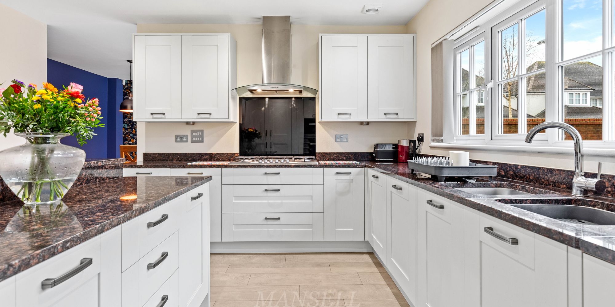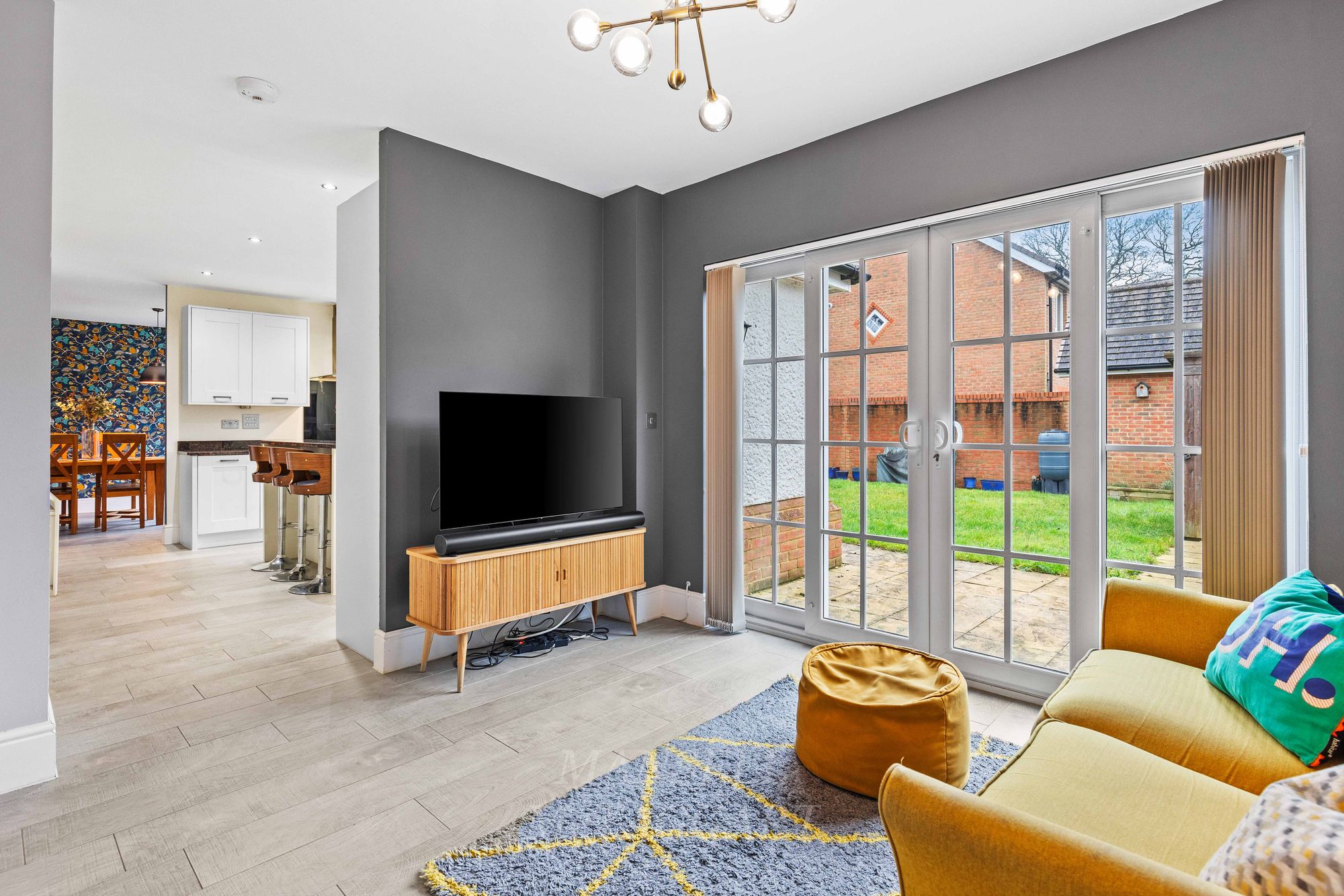 As you enter the property, the bright and airy hallway welcomes you with multiple storage cupboards for shoes and coats, leading to the inviting double aspect living room which features an electric fireplace and bay window flooding the room with natural light. Leading to the rear of the property, the open plan kitchen area is a true highlight, boasting a range of wall and base units, granite work surfaces, and upgraded Miele appliances including 3 tier dishwasher, two eye-level ovens including a compact steam oven, AEG full height fridge and separate freezer, 6-ring gas hob and extractor hood over. Central to the room is an island breakfast bar offering additional storage below and counter tops above.