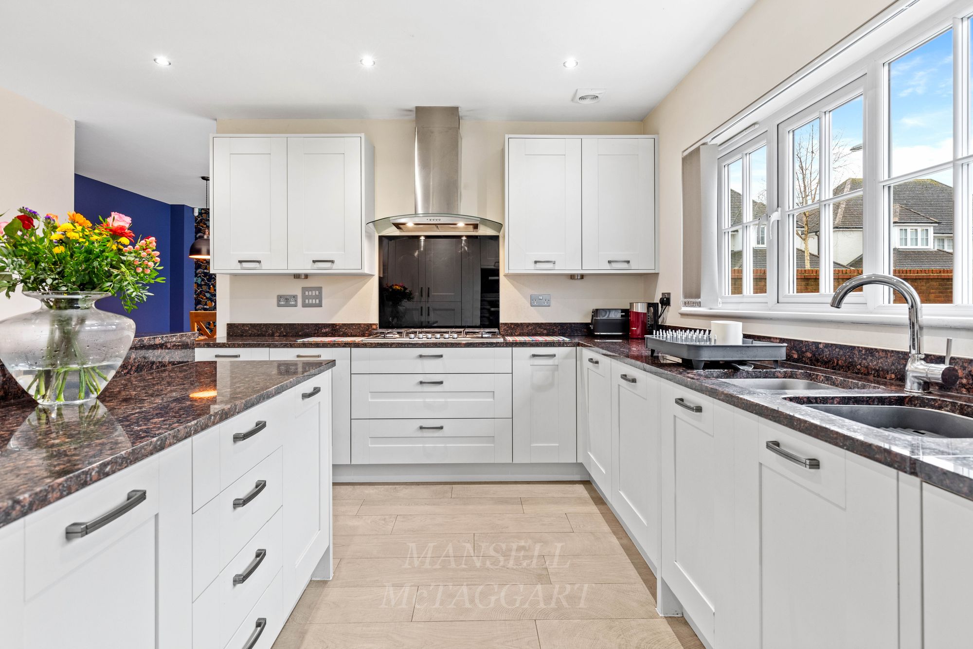 - Fitted kitchen with integrated appliances and central island