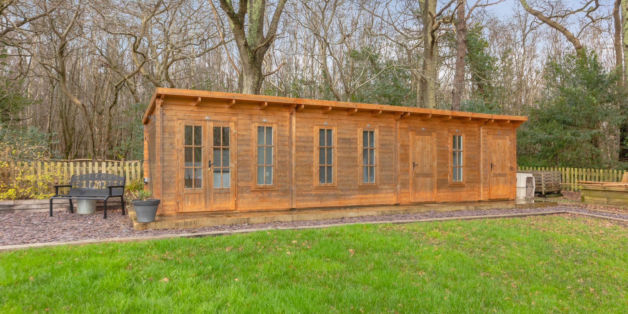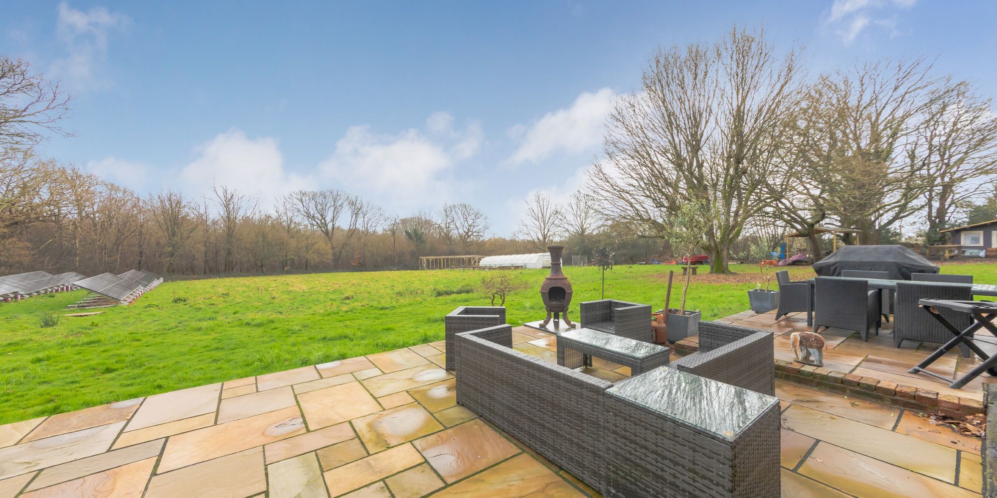 The large bright and sunny lawned area is flanked by 5.78 acres of mature woodland with gated access and features an array of solar PV panels which contribute to an impressive EPC of A.