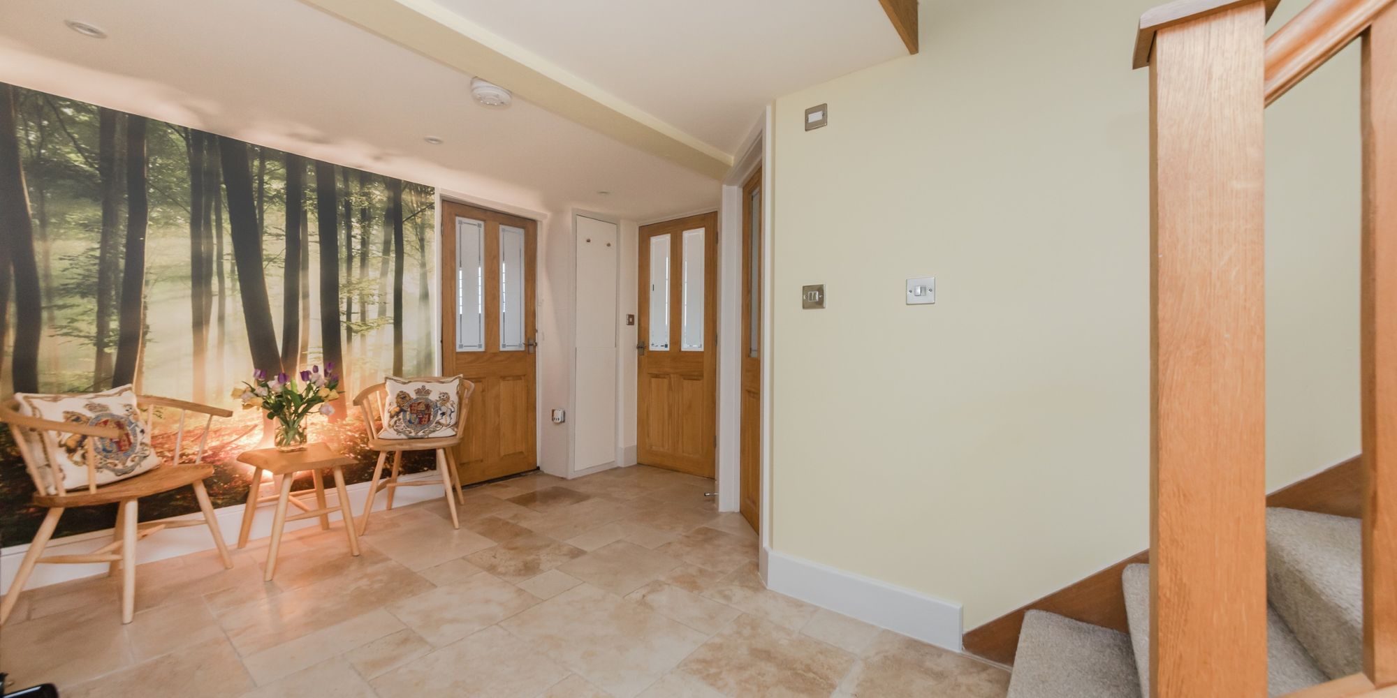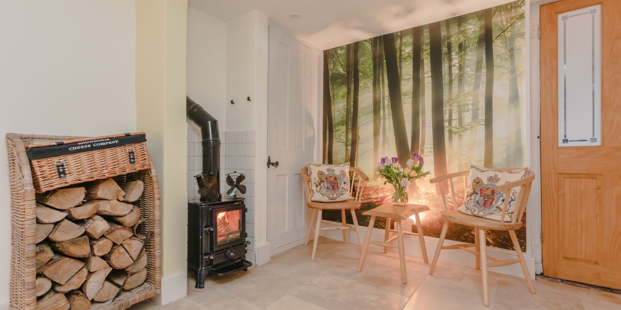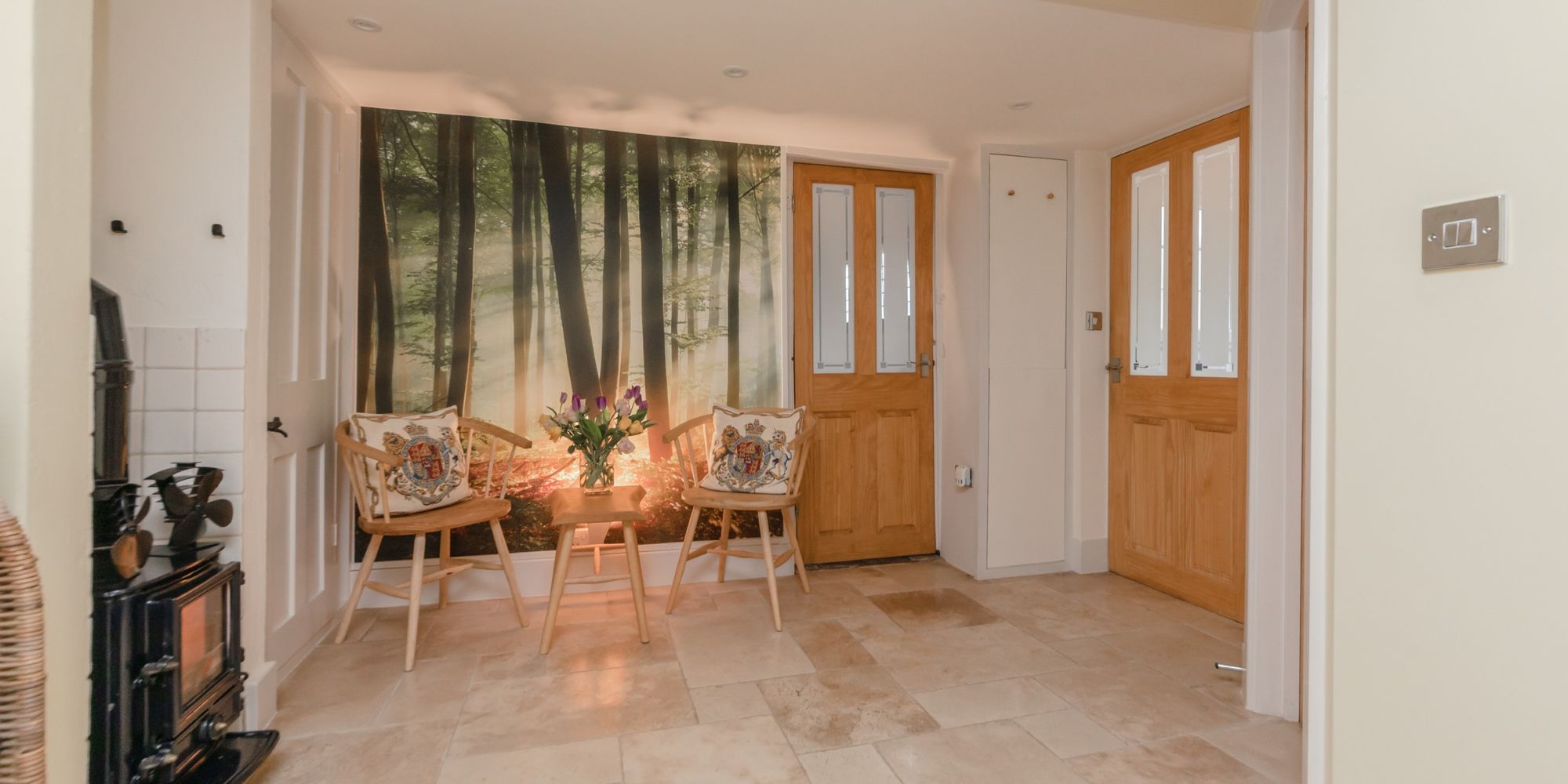 ENTRANCE HALL- A cosy space with cupboard, stairs to first floor, doors to principal rooms, cast-iron log burner with tiled surround and underfloor heating