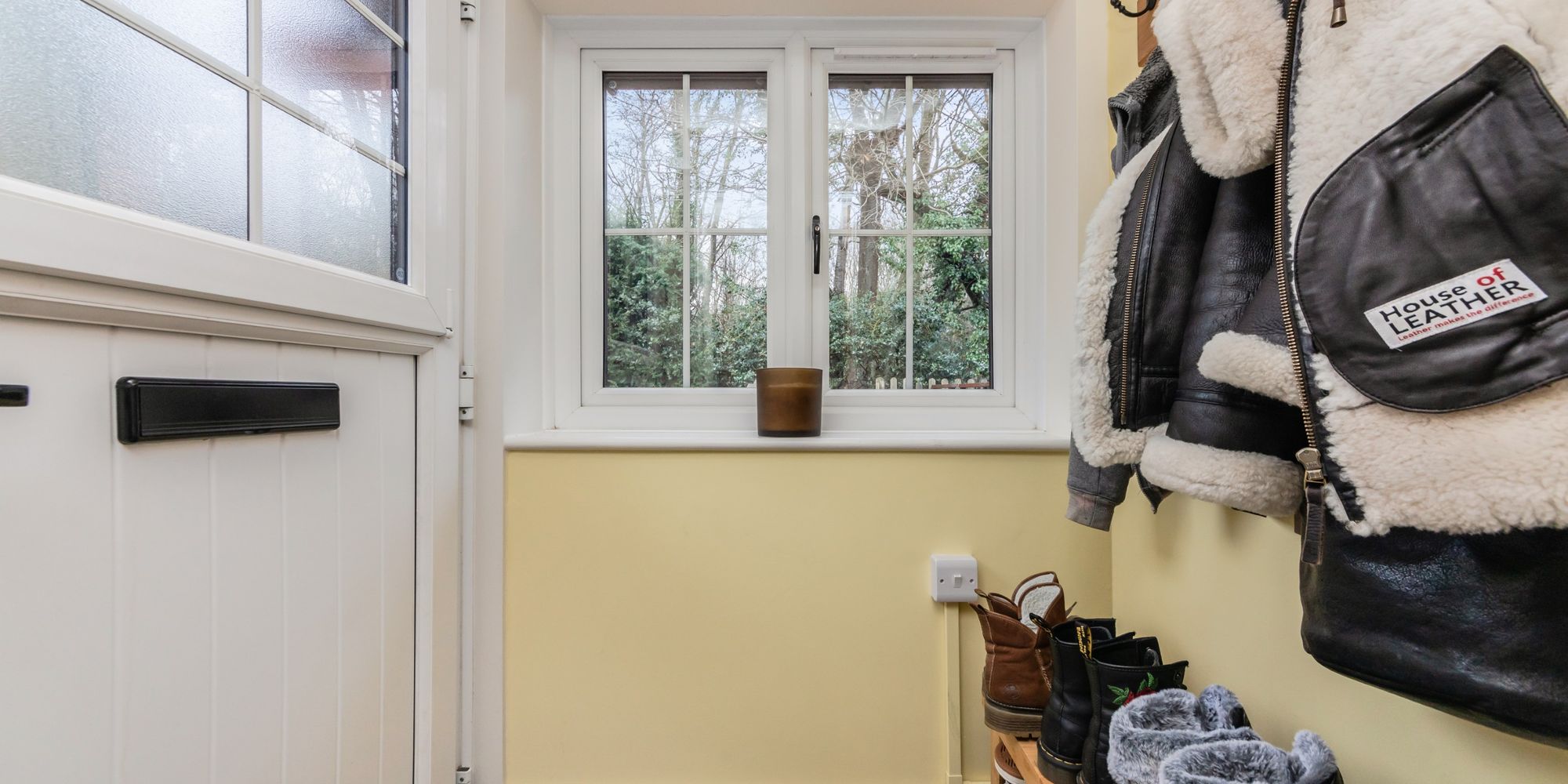 ENTRANCE PORCH- Composite, barn style door to enclosed porch with side aspect window. Door to
