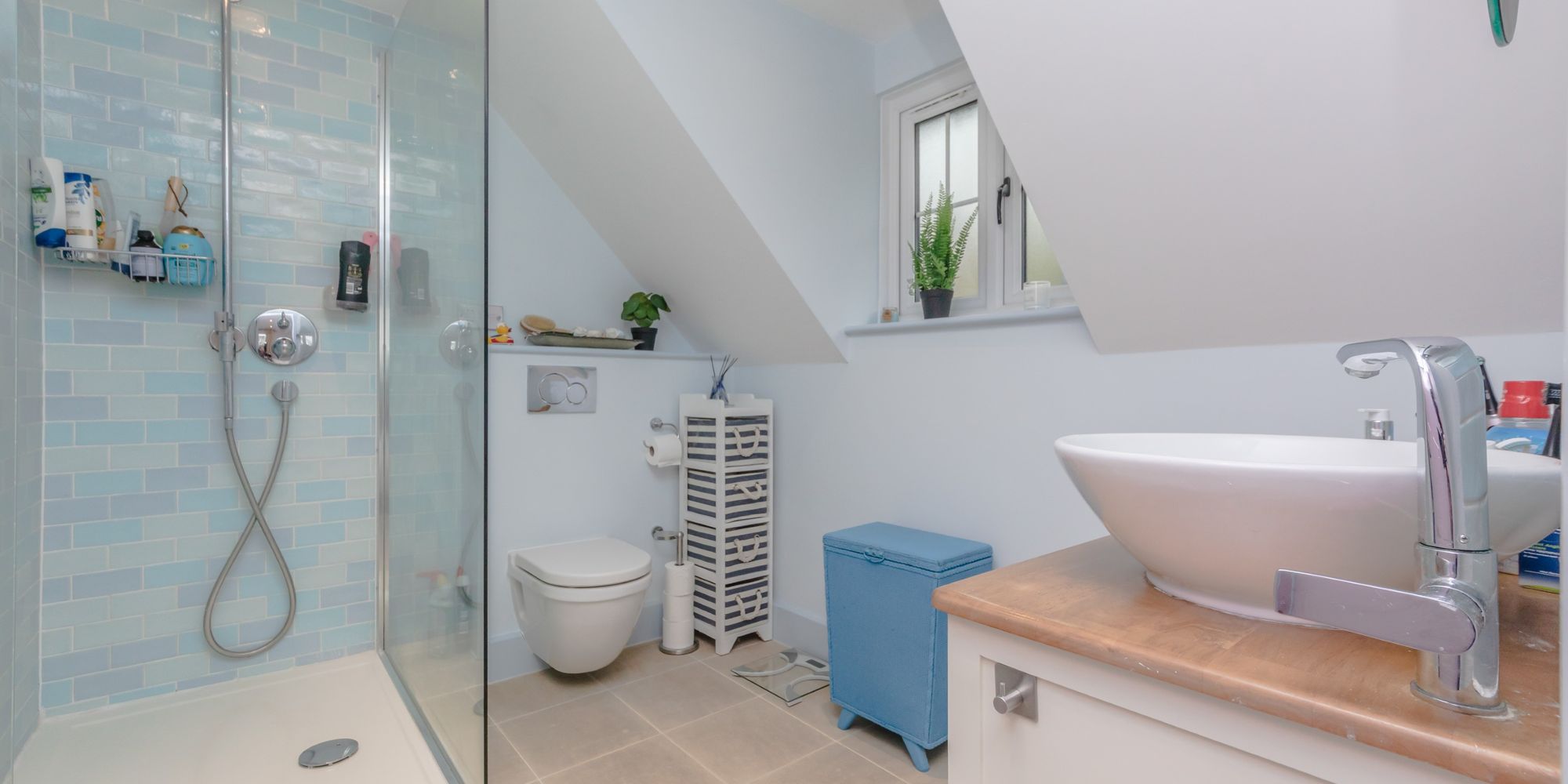 EN SUITE- Walk in shower, glass enclosed with tiled surround, W.C. with concealed system, hand wash basin with mixer tap, obscured windows, tiled flooring and vaulted ceilings