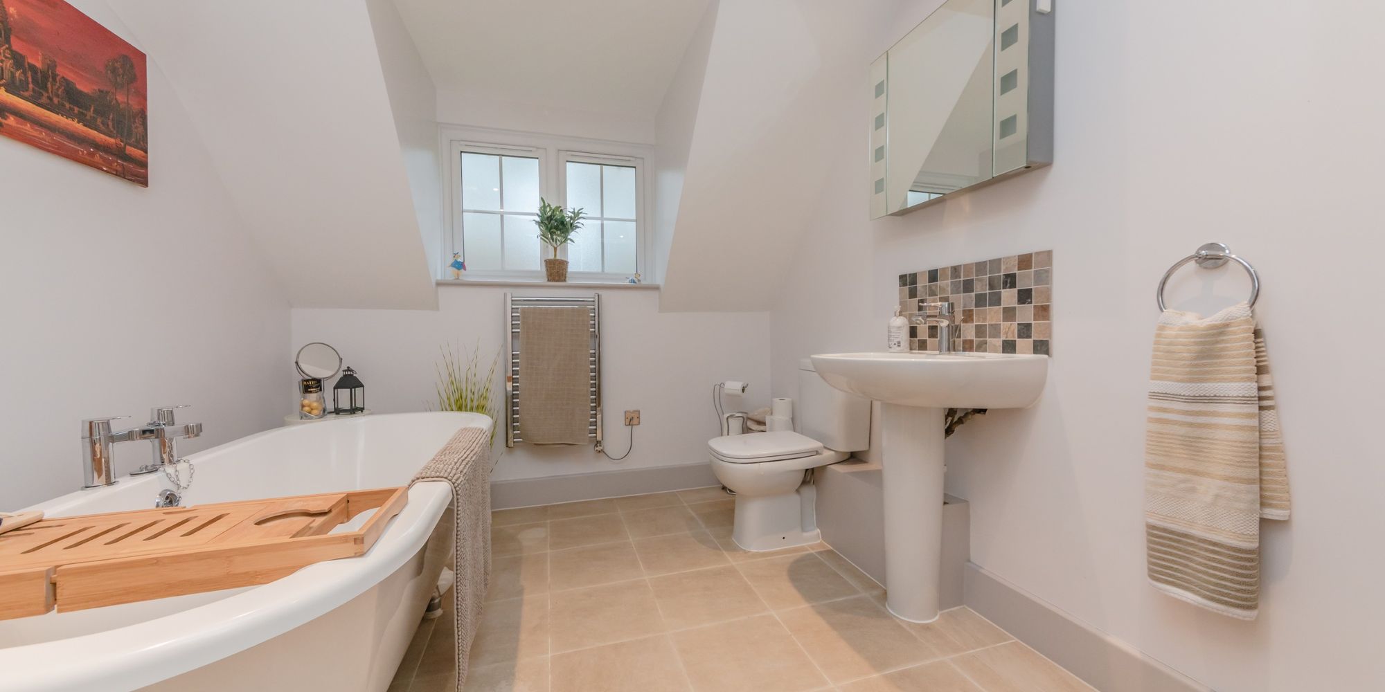 BATHROOM- A modern fitted family suite comprising a stand-alone bath with mixer taps, walk-in shower with tiled surround and glass enclosed, pedestal hand wash basin with mixer tap and mosaic tiled backsplash and low-level W.C. Chrome heated towel rail and tiled flooring boasting underfloor heating