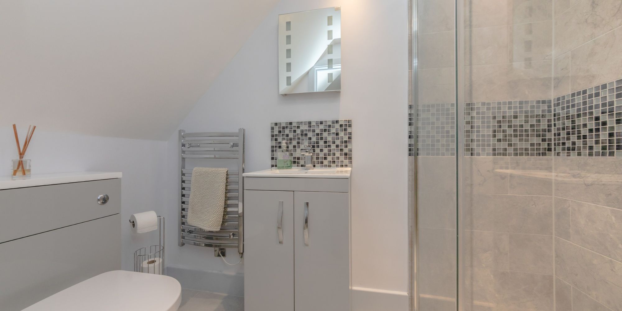 EN SUITE- Walk-in shower, glass enclosed and tiled surround, wash hand basin with mixer tap and tiled splashback and vanity below, W.C and chrome heated towel rail