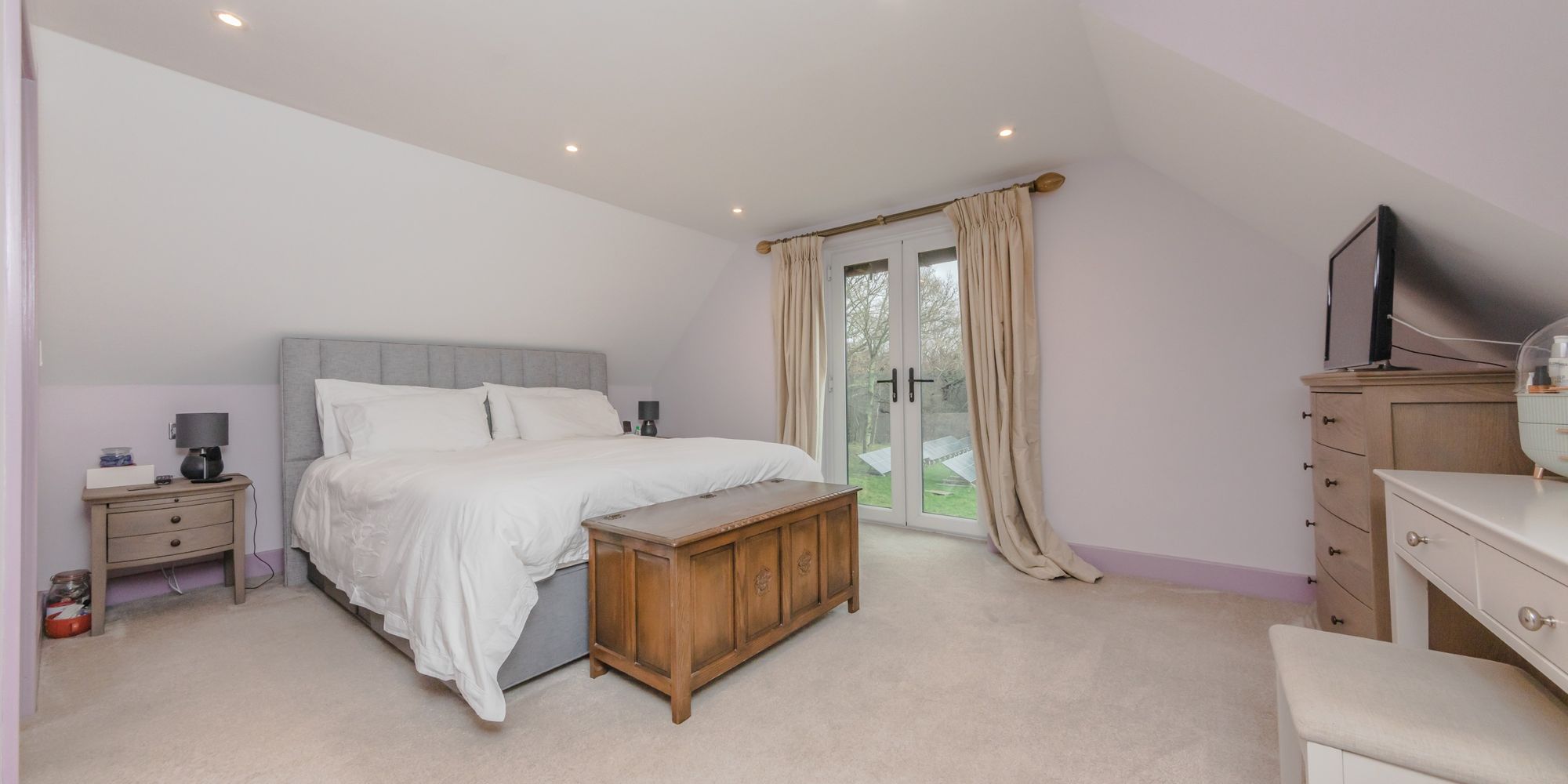 BEDROOM- A great size double bedroom with vaulted ceilings, skylights providing floods of natural light and side aspect double-glazed window and door to
