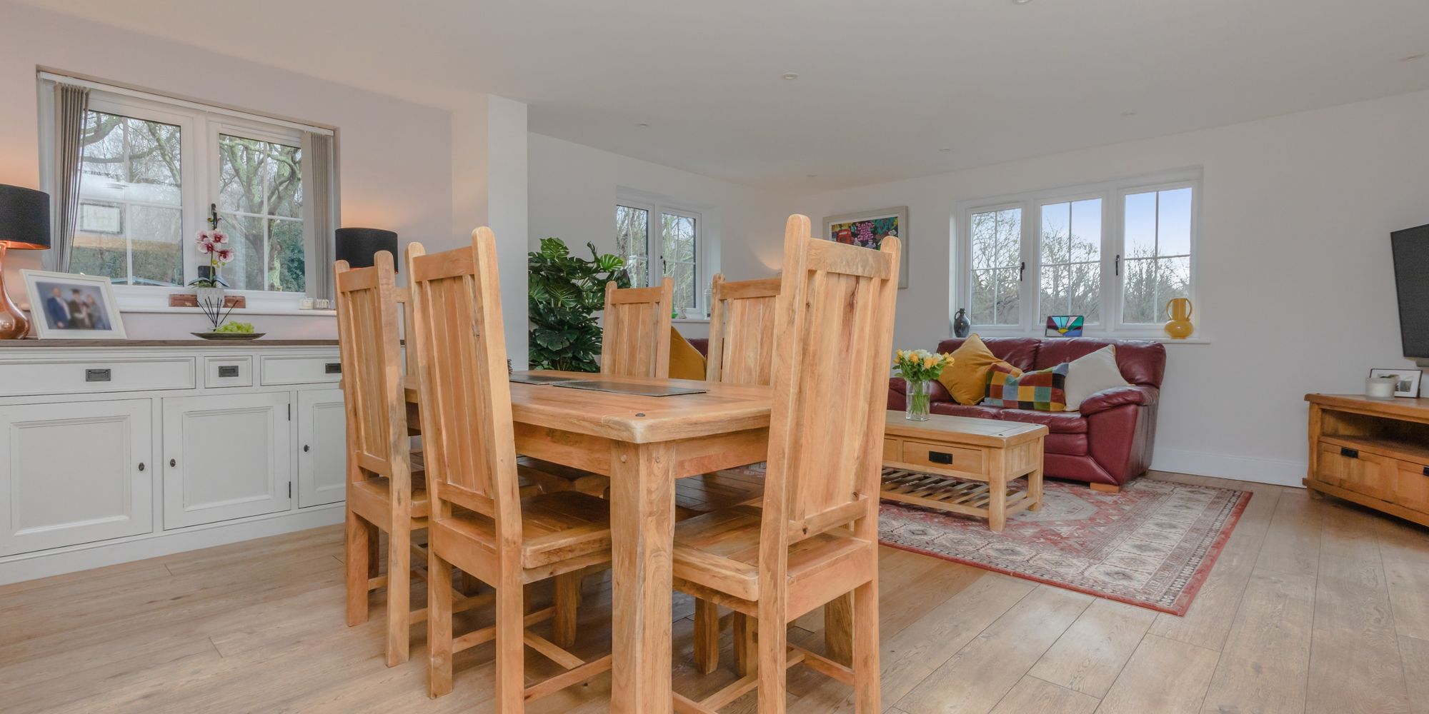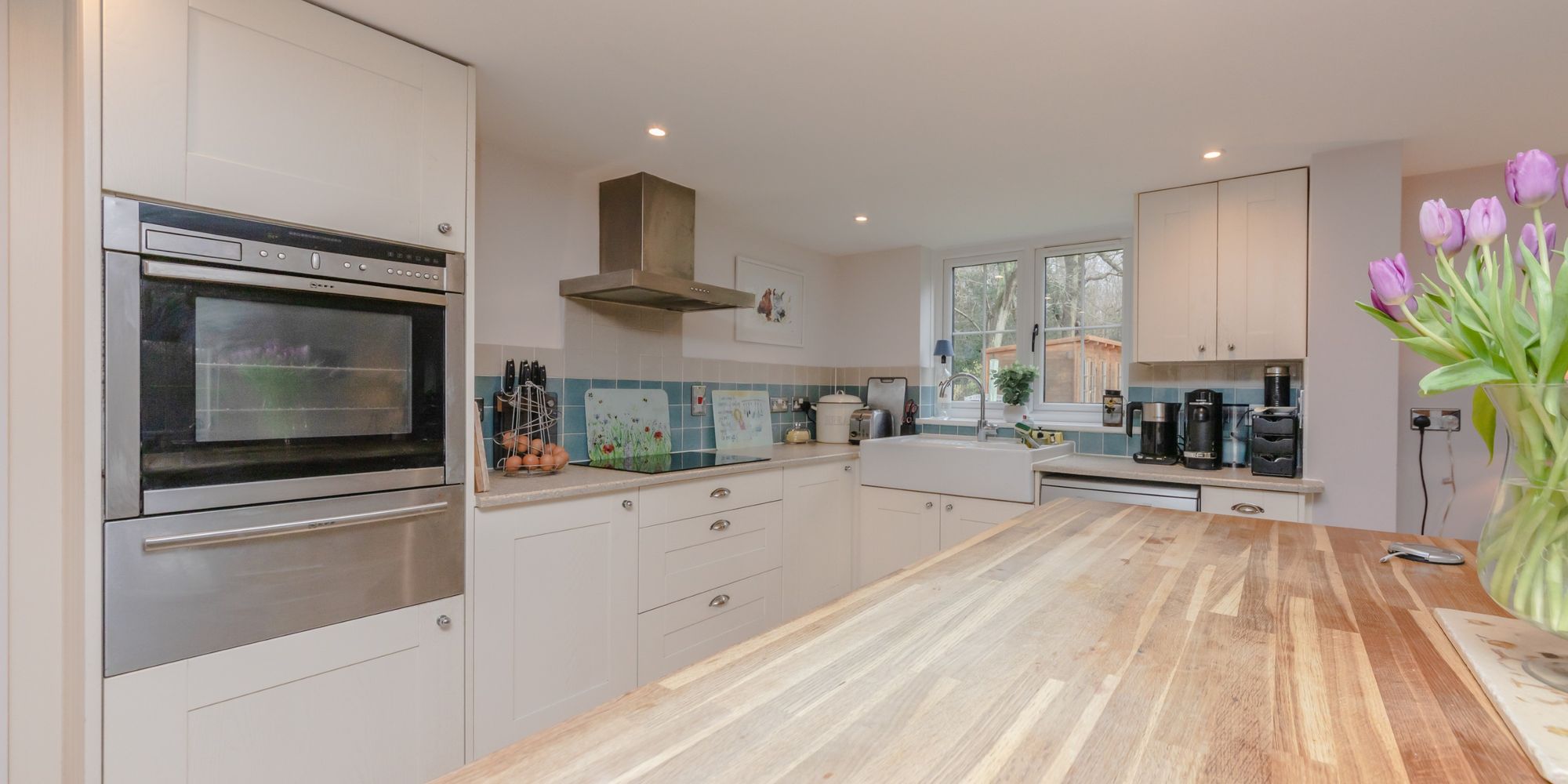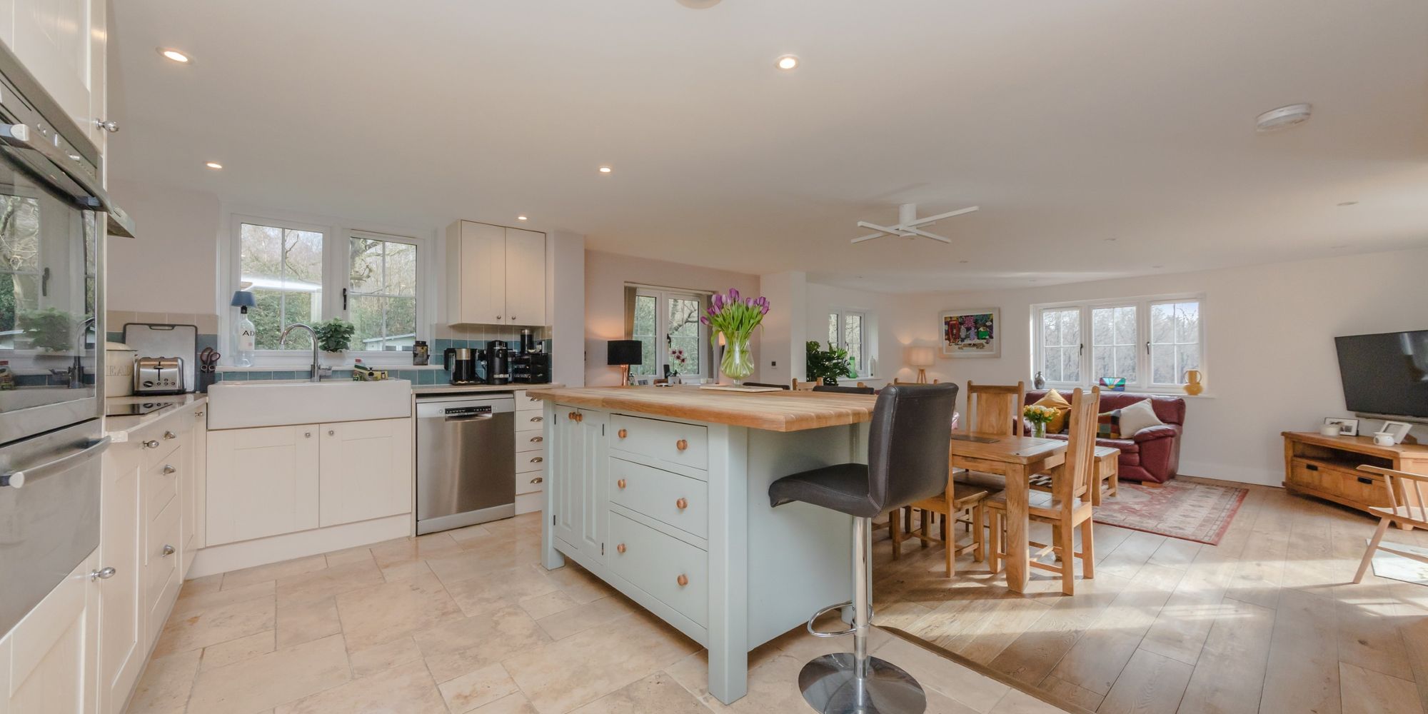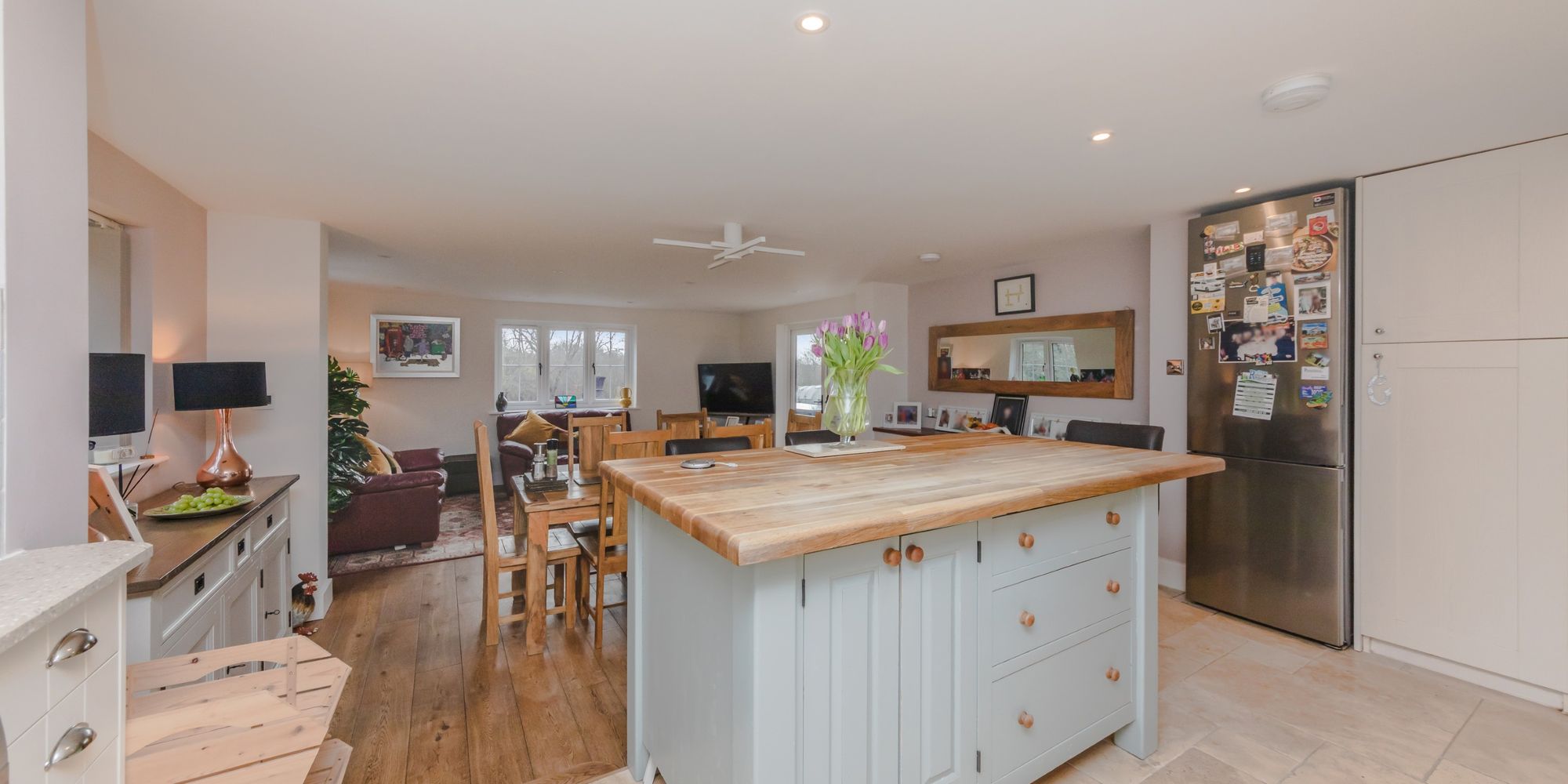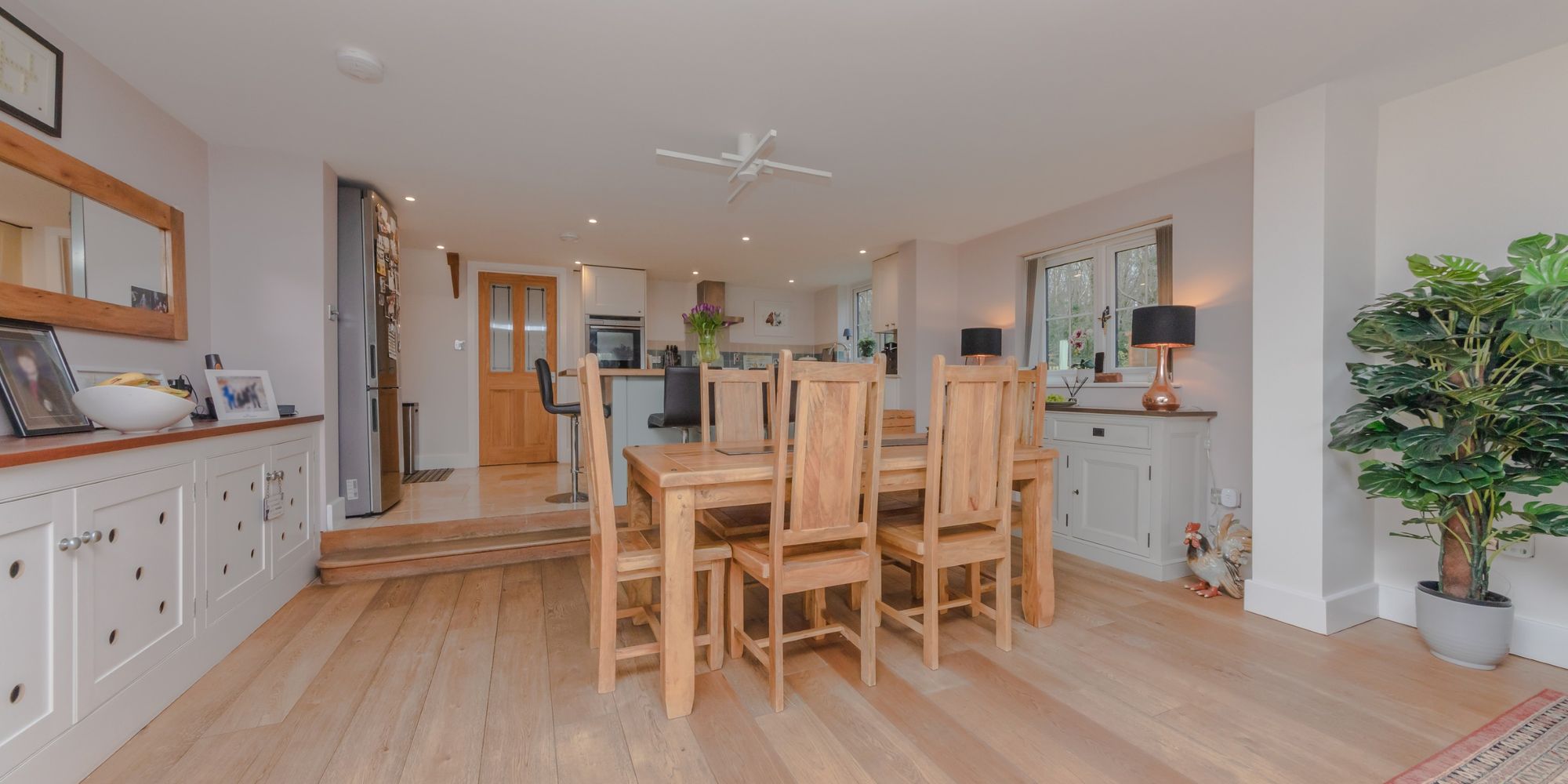 KITCHEN/DINING ROOM- A simply stunning room, flooded with natural light from the expanse of glass and roof window. This beautiful room is the heart of day-today living with areas for cooking, relaxing and both formal and informal dining. With stylish shaker style wall and base units with complimenting wooden worktops, featuring an island with the similar stylish design providing further storage. 4 ring ceramic hob with cooker hood above and tiled splashback surround, eye level oven and warmer drawer and dishwasher. Large ceramic Butler sink with mixer tap and side aspect window above overlooking the garden. Space for large fridge freezer. Step down to living/dining area. With wooden floors, built in storage on one side and rear and side aspect windows allowing lots of natural light. Double doors open directly to the garden and patio allowing a natural flow
