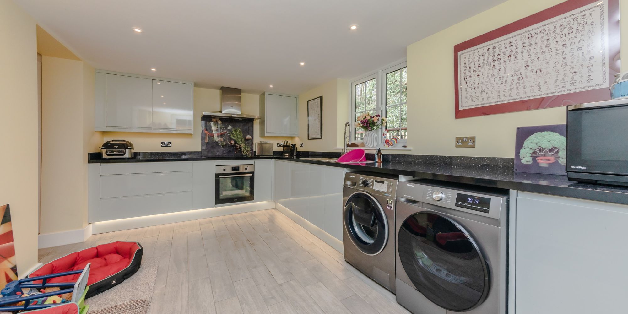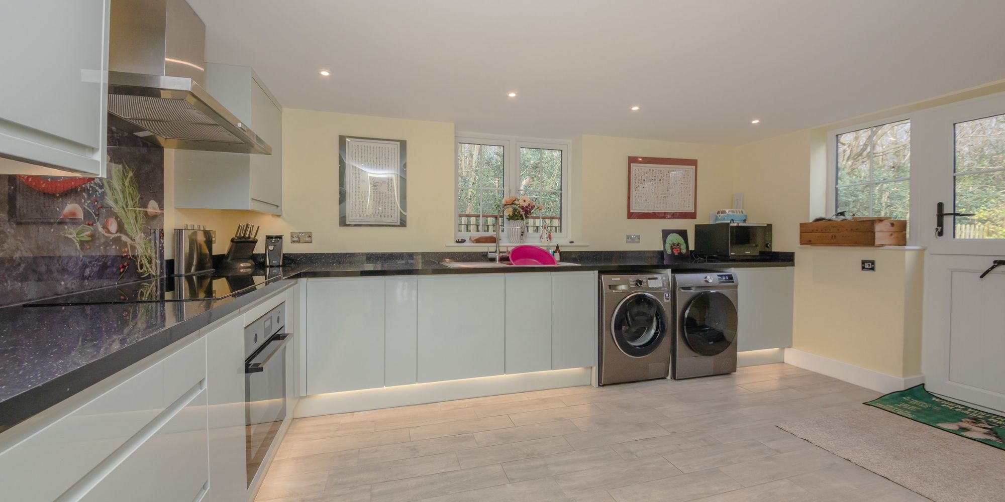 UTILITY ROOM- A newly extended part of the house measuring a staggering 13’7ft x 9’8ft. This utility has space for a washing machine and tumble dryer and comprises flushed, handleless wall and base units with complimenting black granite style worktops. There’s a 4 ring ceramic hob with oven below and chimney style cooker hood above. Stainless steel sink with mixer tap and side aspect window above overlooking the side of the property and further to the woodland. With underfloor heating and door to further storage cupboard; composite barn style door to garden with double-glazed window to the side.