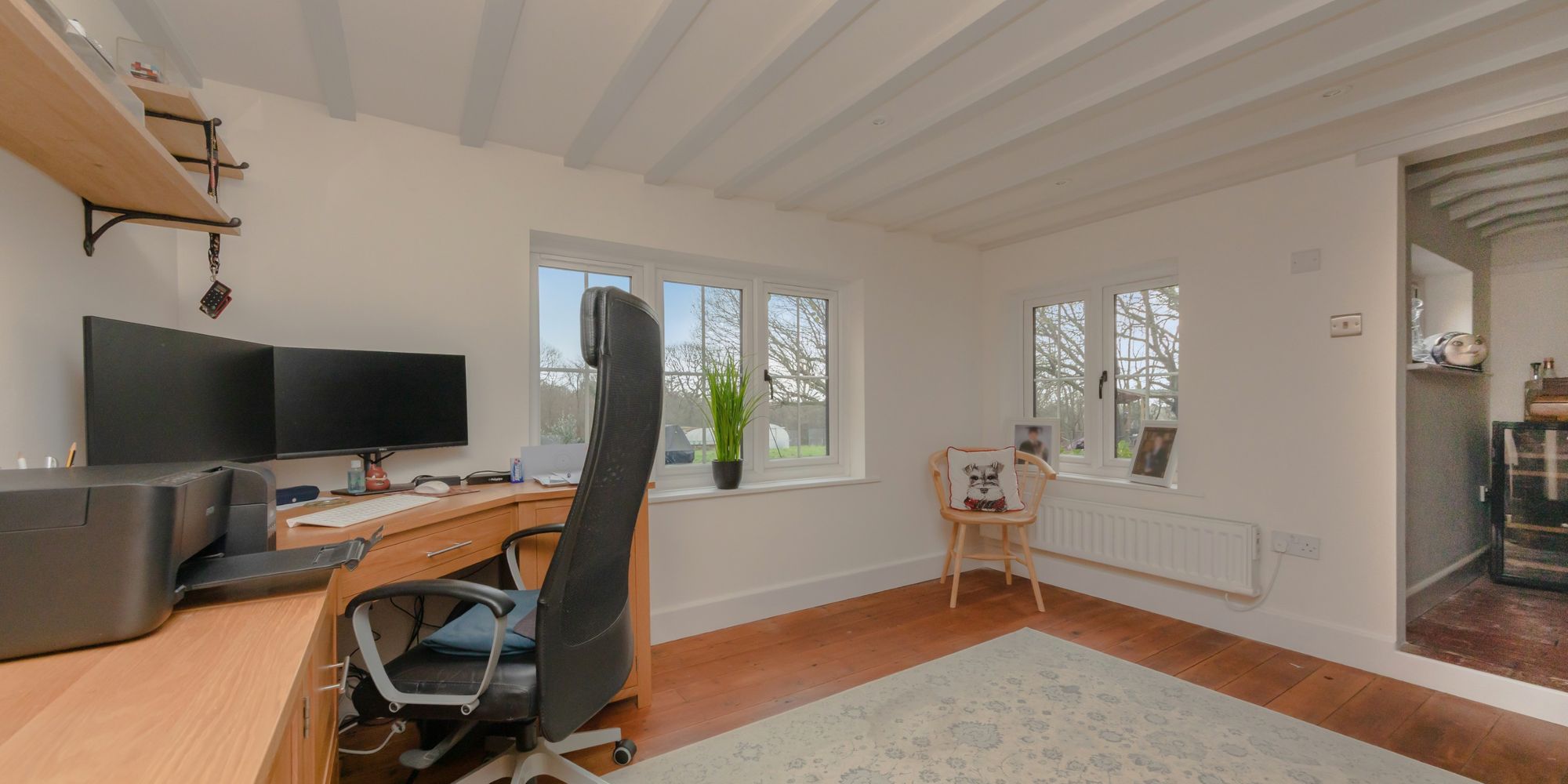 STUDY- A good size, dual aspect room with large rear and side aspect windows overlooking the garden. Featuring exposed wooden floorboards and brick chimney hearth