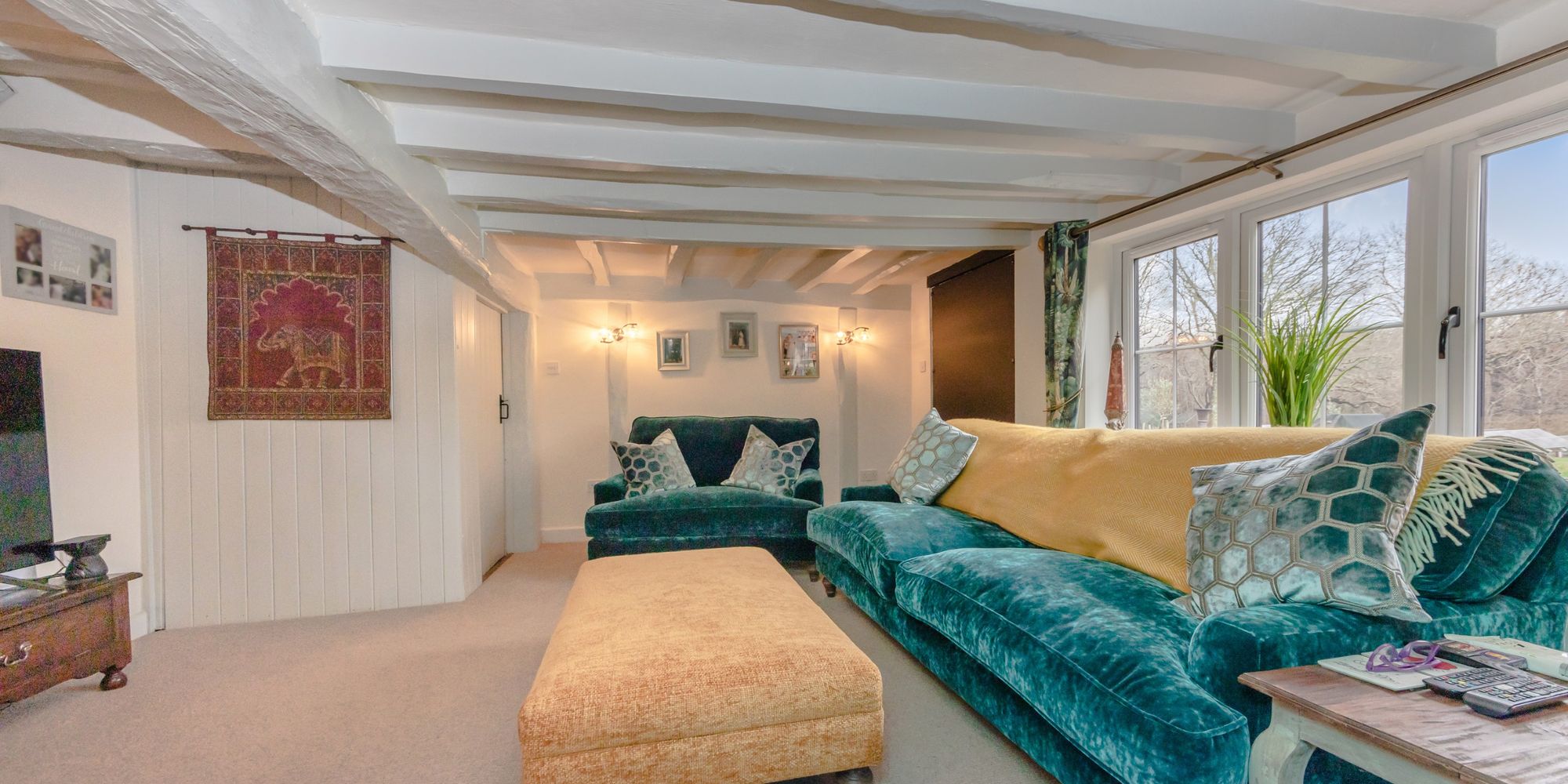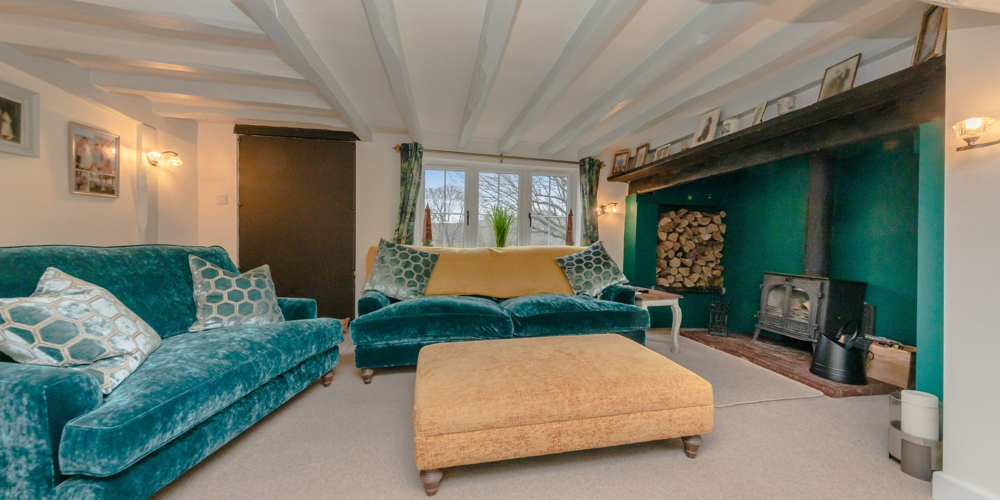 SITTING ROOM- A beautiful cosy room featuring painted beams and cast-iron log burner inside a large recess with wooden mantel piece. Dual aspect with side aspect windows and panelled latch door
