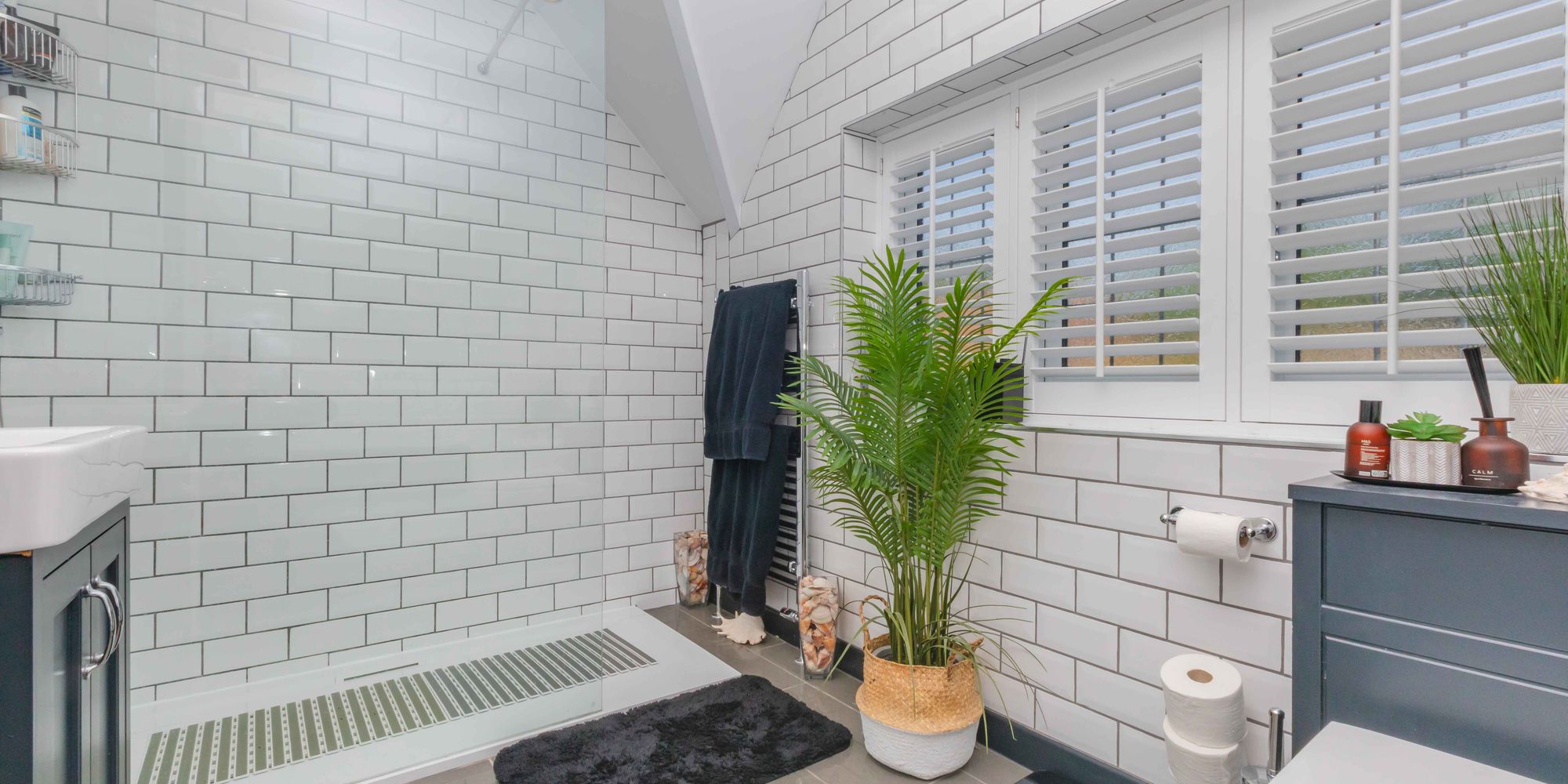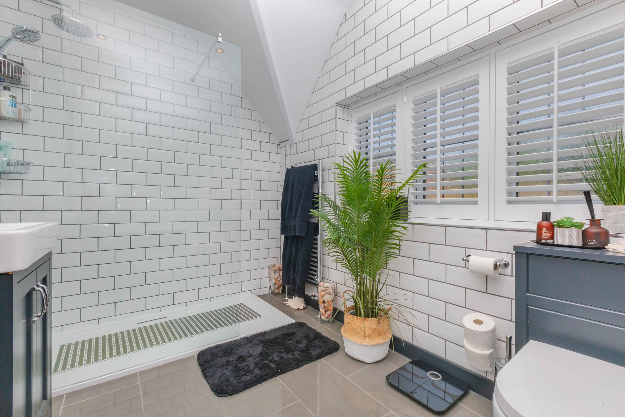 FAMILY BATH/SHOWER ROOM: beautifully refitted with a luxurious white suite and comprising enclosed bath, chrome mixer tap with handheld shower attachment, tiled surround, walk-in shower with wall mounted shower unit and wide soaker rose, low level WC, vanity unit with inset washbasin, fully tiled walls and floor, opaque leaded light window to side, recessed spotlighting.