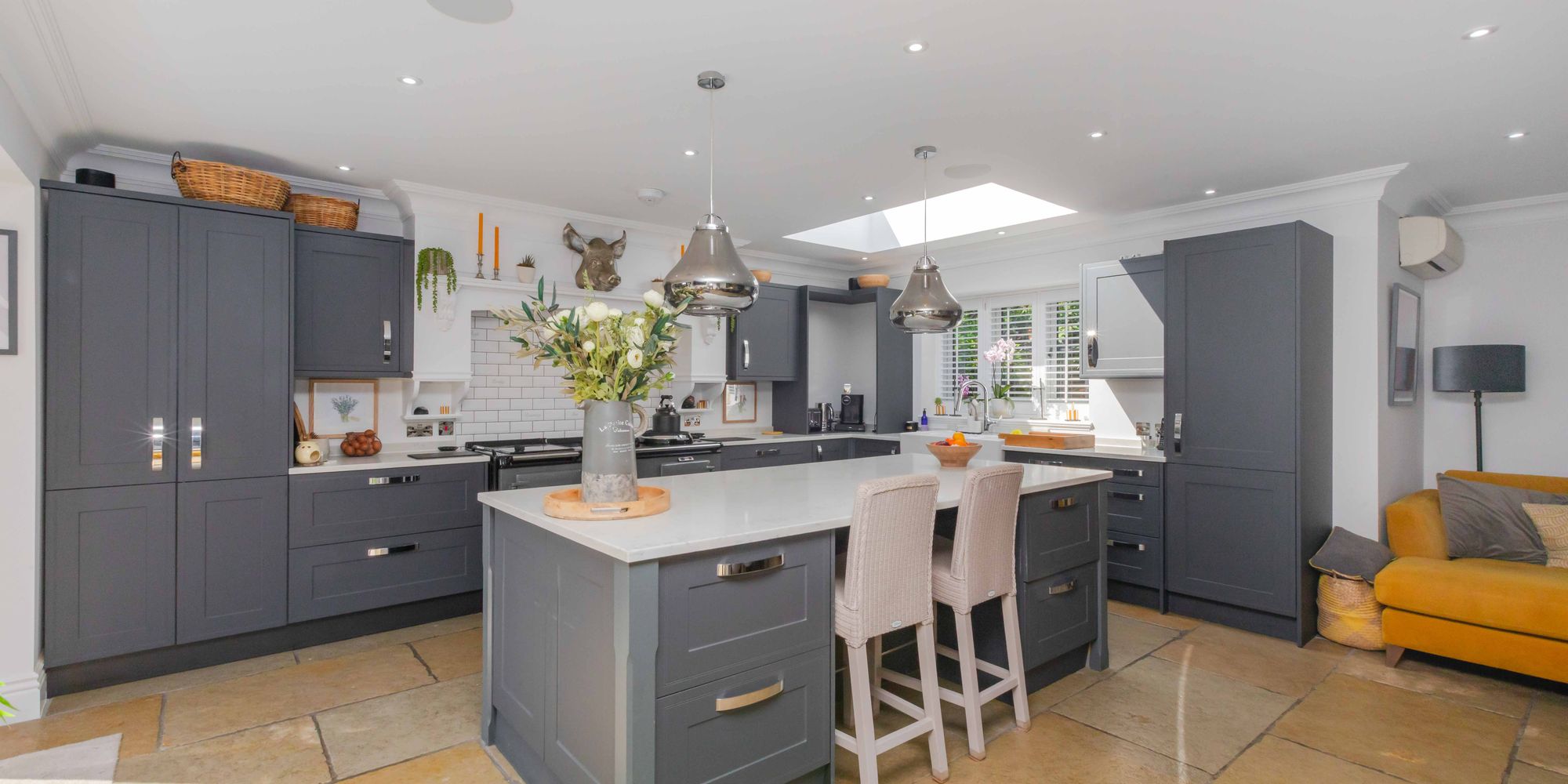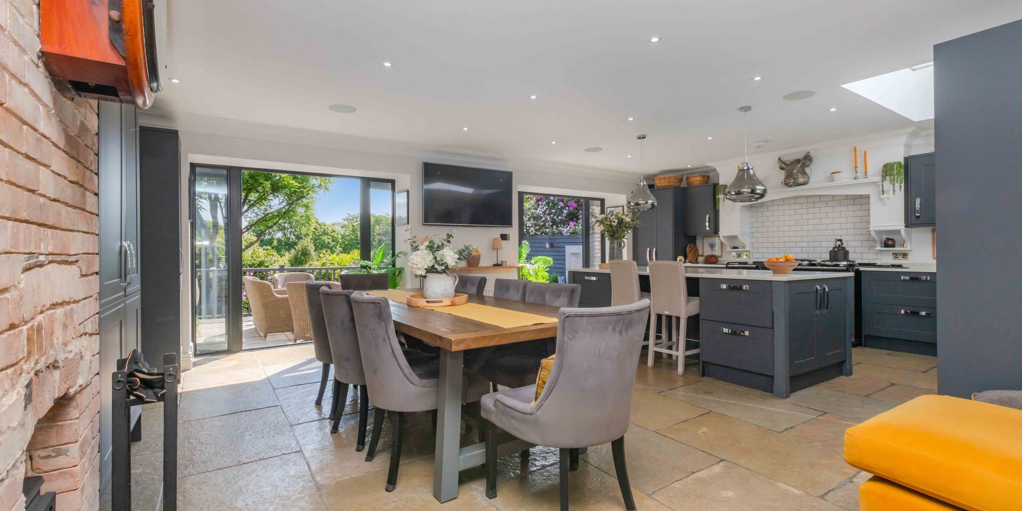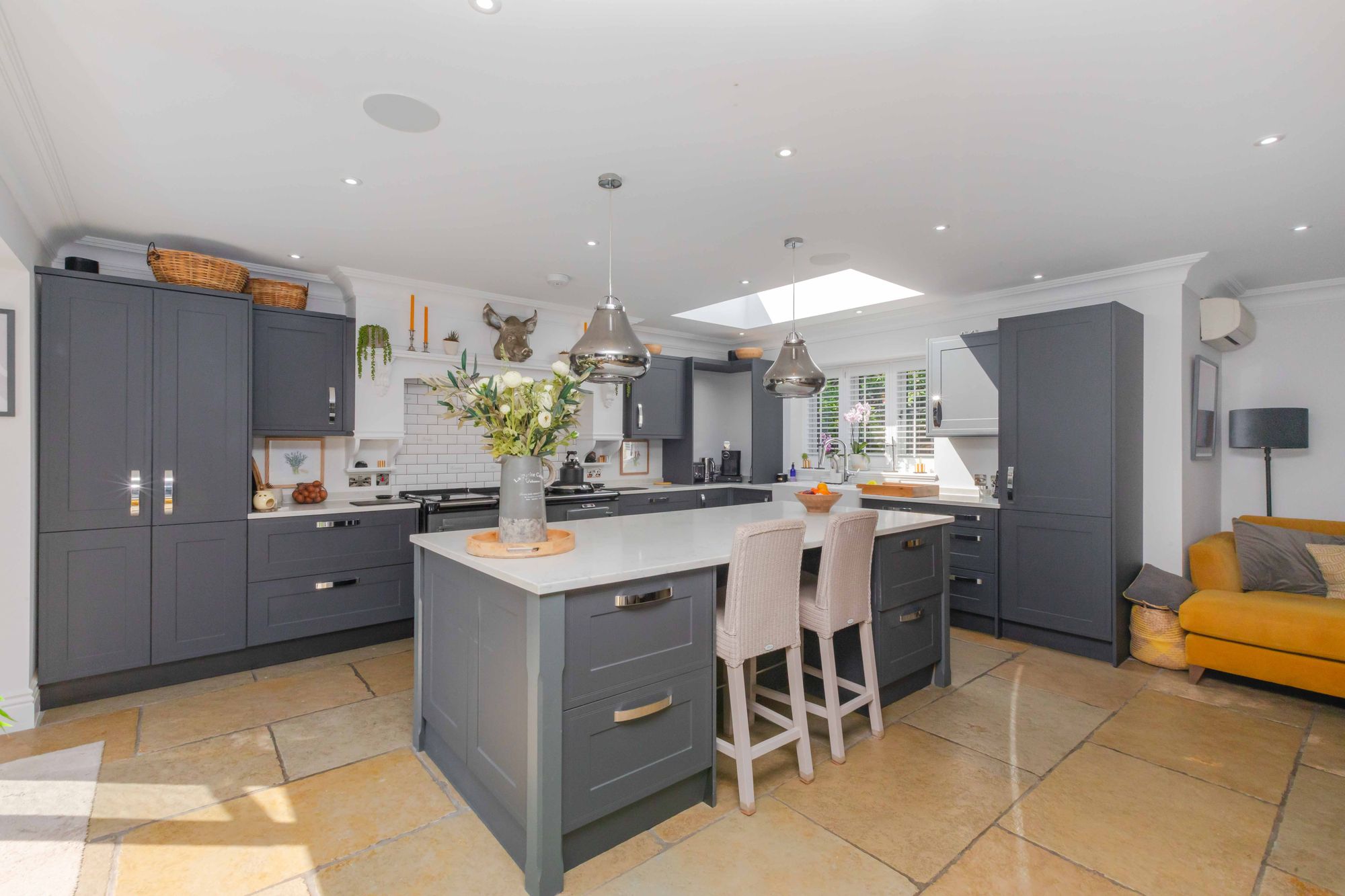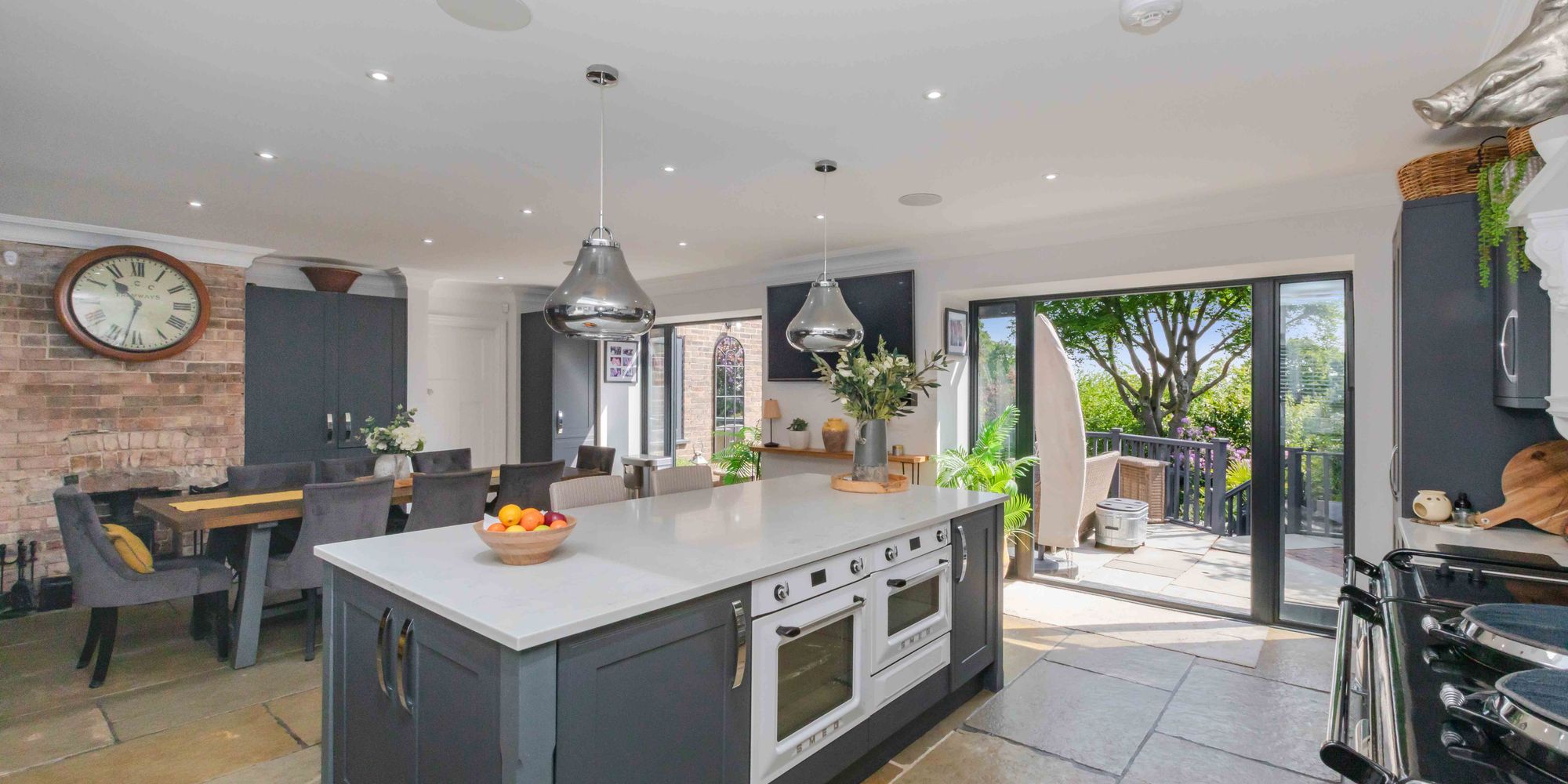 KITCHEN/DINING/FAMILY ROOM: a spectacular open plan double aspect room, beautifully re-fitted with a range of units to eye and base level and comprising double bowl ceramic sink unit with waste disposal unit, free standing mixer tap, deep pan drawer beneath. Adjoining quartz work surfaces, integrated Neff dishwasher, integrated tall standing fridge, fine twin plate electric electrickit Aga with both Induction Plate and ceramic hob, further range of units to eye and base level including retractable larder style unit, twin glazed double doors with adjacent floor to ceiling side panels opening to the patio and gardens, brick fireplace with recessed cast iron wood burning stove, further tall built-in larder style unit, large central island with quartz worksurface over, breakfast bar providing seating for two, further units beneath including twin Smeg ovens, recessed spotlighting, ceiling cornicing, leaded light windows to front, large roof lantern, tiled flooring.